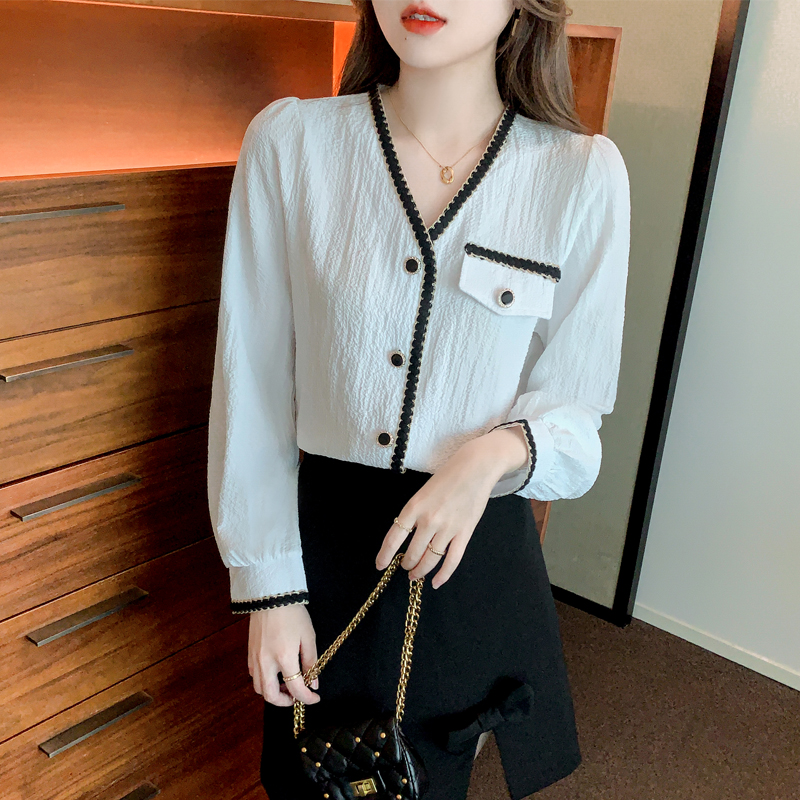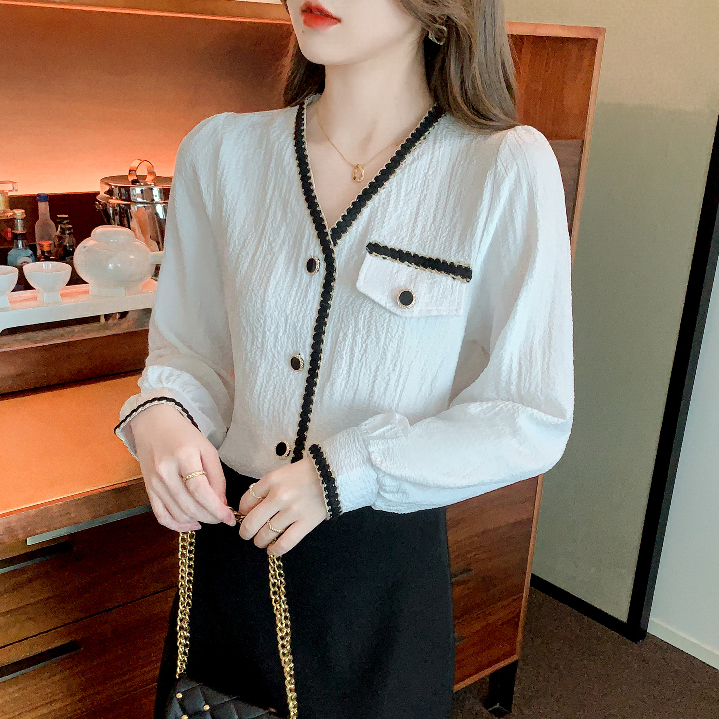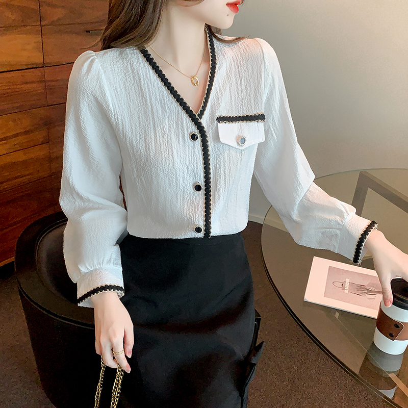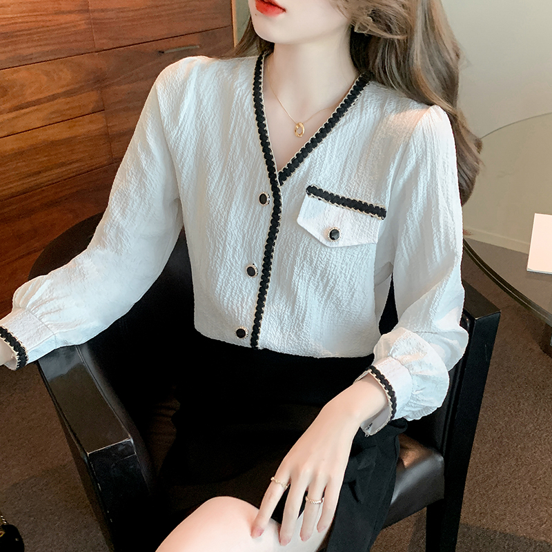 FA51095# 春装法式V领长袖衬衫气质通勤衬衣洋气小衫百搭上衣女 服裝批發女裝批發服飾貨源