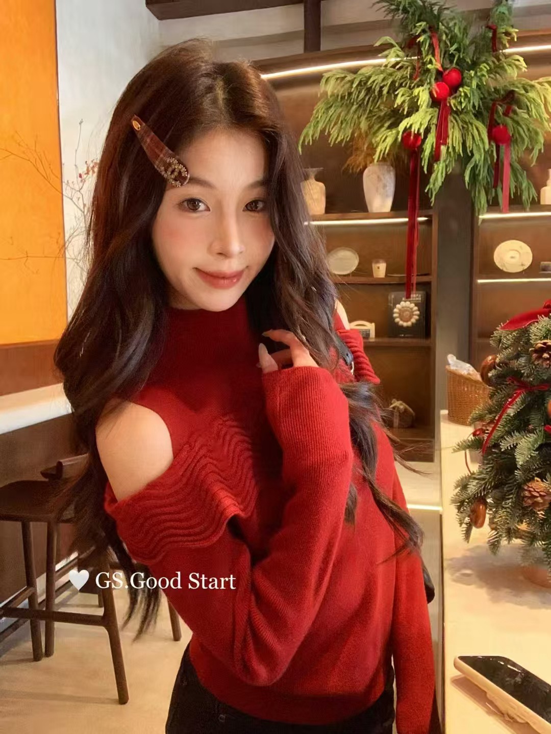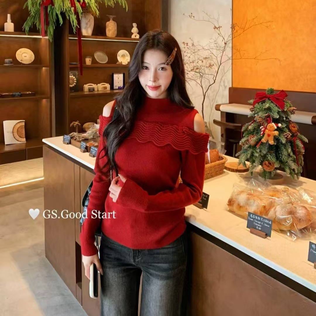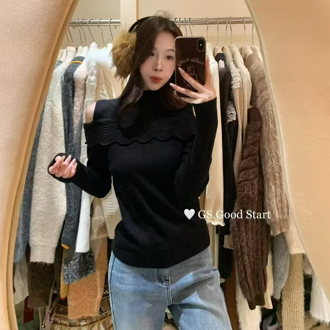 FA51185# 韩系气质设计感露肩针织上衣女冬季十三行新款半高领长袖打底衫 服裝批發女裝批發服飾貨源