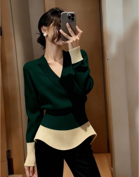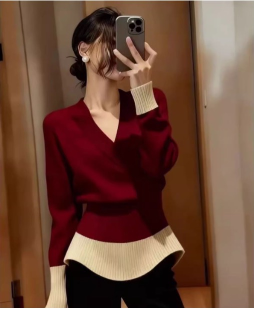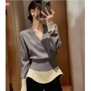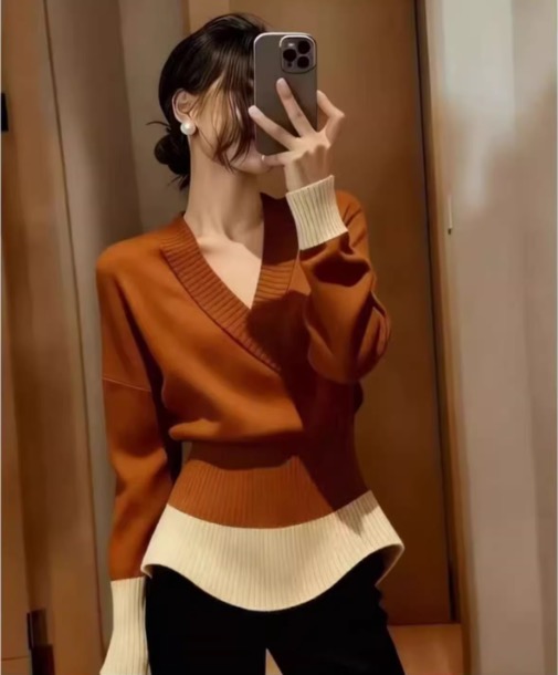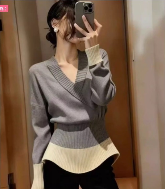FA51188# 韩系高级感撞色拼接v领毛衣女秋冬设计感收腰显瘦内搭打底针织衫 服裝批發女裝批發服飾貨源
