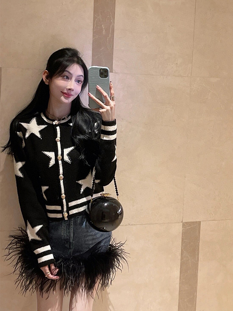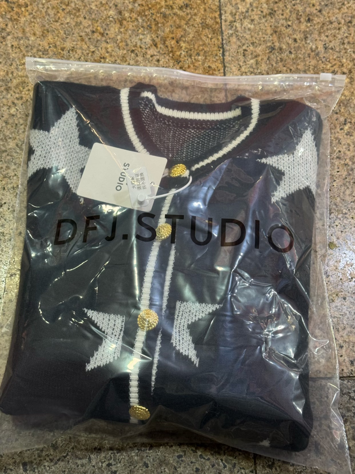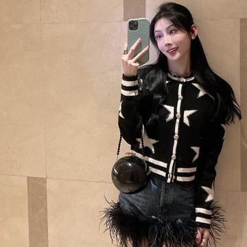 FA51214# 秋季新款高级感撞色拼接星星提花设计感针织开衫女修身显瘦上衣QN 服裝批發女裝批發服飾貨源