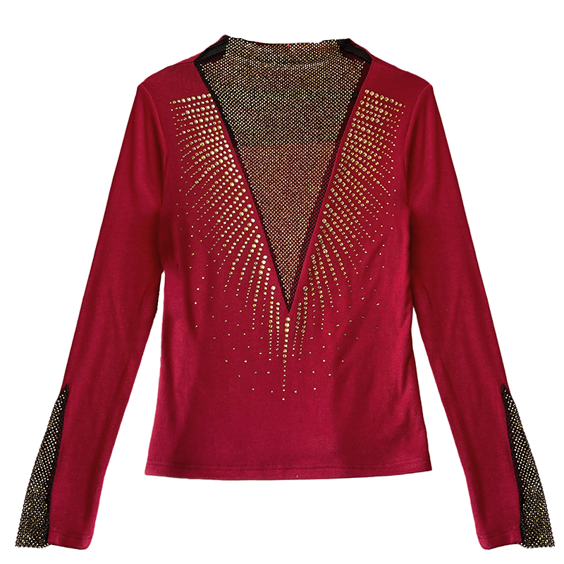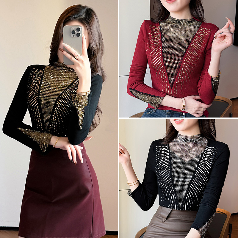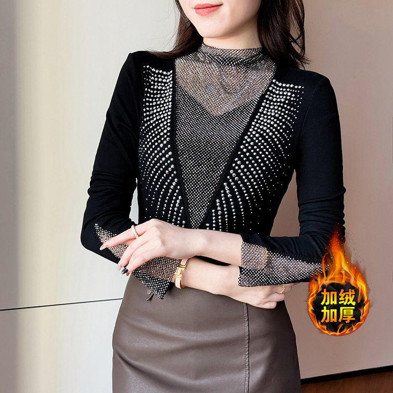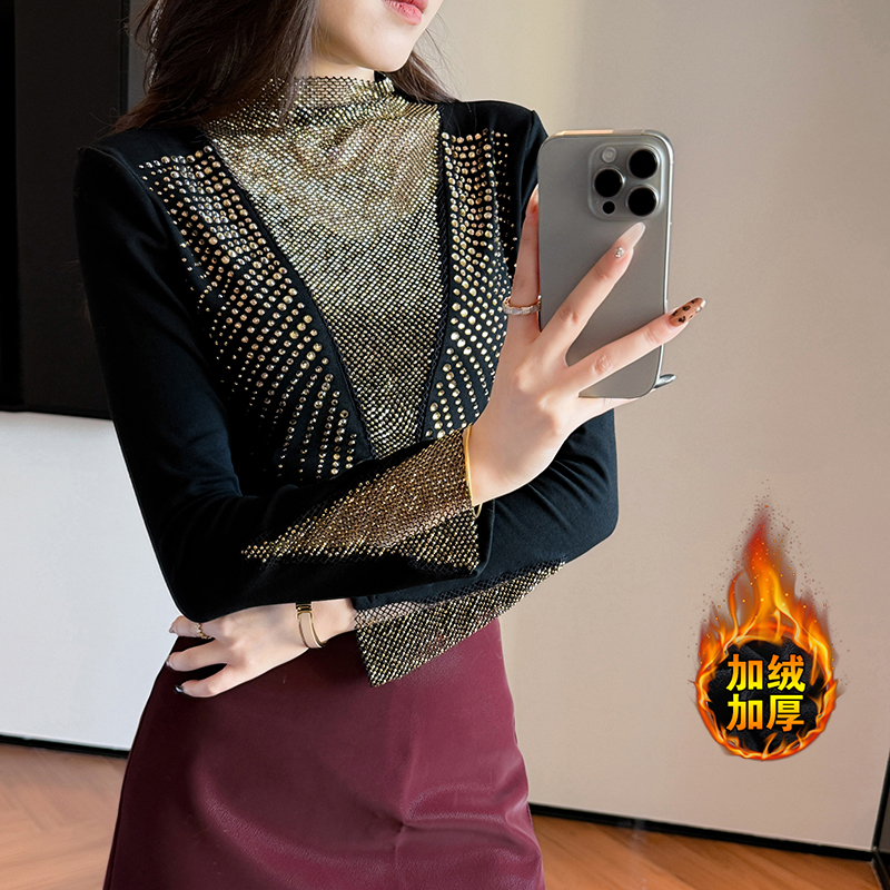 FA51227# 秋冬新款加厚保暖磨毛V领镶钻长袖修身显瘦设计感半高领打底衫女 服裝批發女裝批發服飾貨源