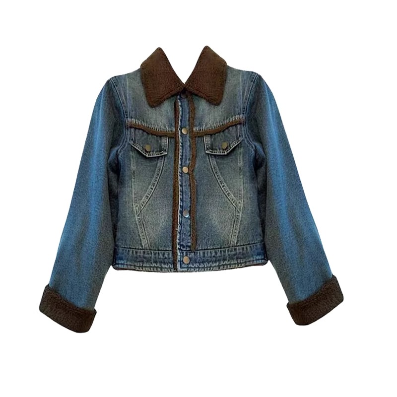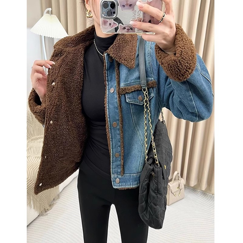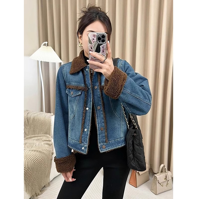 FA51231# 冬季加绒牛仔外套女爆款加厚兔毛羊羔毛棉服短款小个子 服裝批發女裝批發服飾貨源