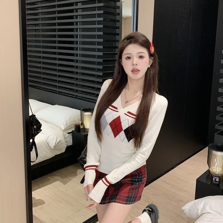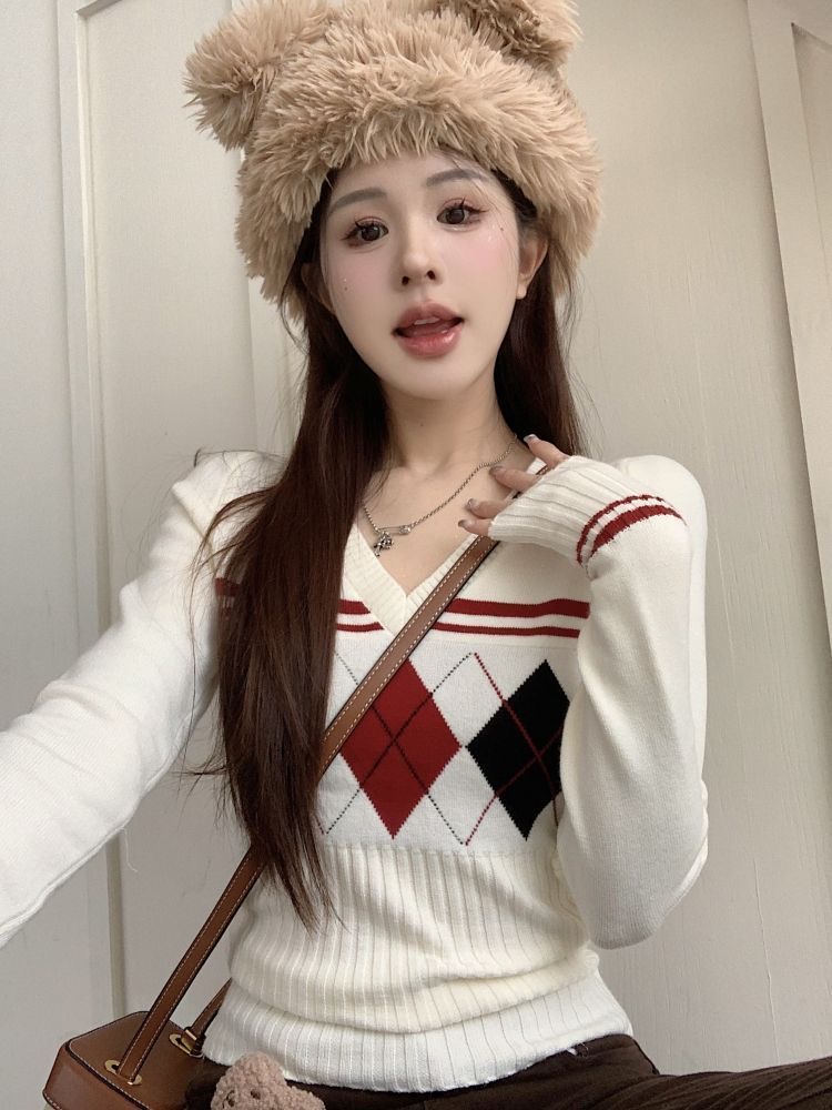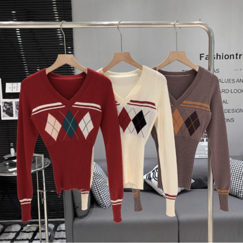 FA51268# 辣妹复古撞色菱格针织毛衣女秋冬修身套头上衣设计感小众显瘦长袖 服裝批發女裝批發服飾貨源