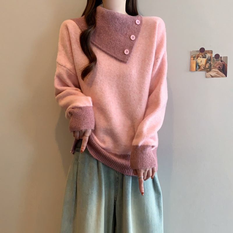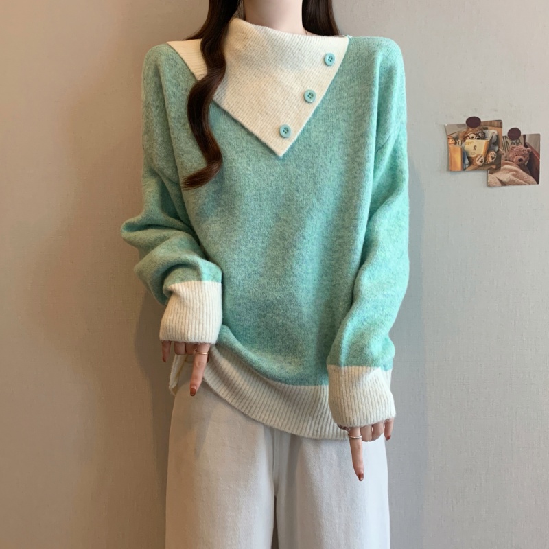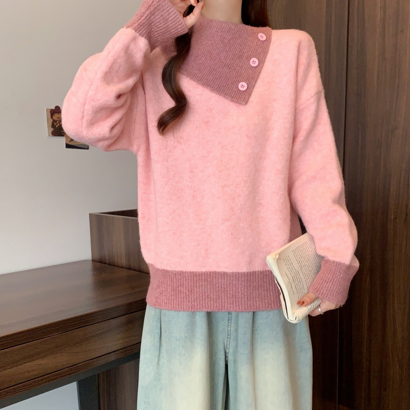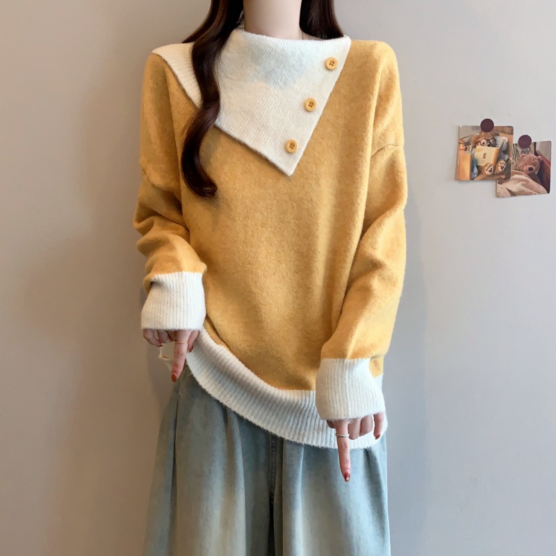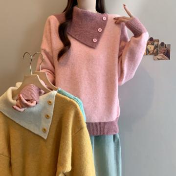 FA51302# 设计感撞色翻领针织毛衣冬季新年穿搭减龄显瘦洋气百搭上衣女 服裝批發女裝批發服飾貨源