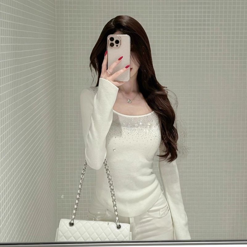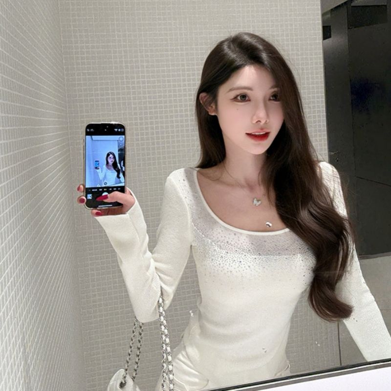 FA51318# 纯欲U领烫钻针织打底衫女秋冬新款巨好看的内搭修身长袖上衣 服裝批發女裝批發服飾貨源