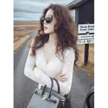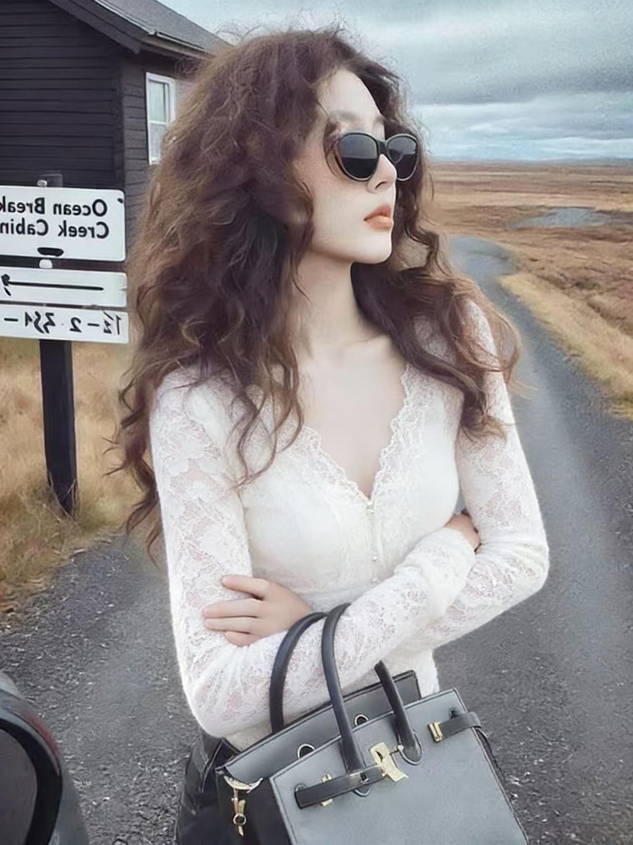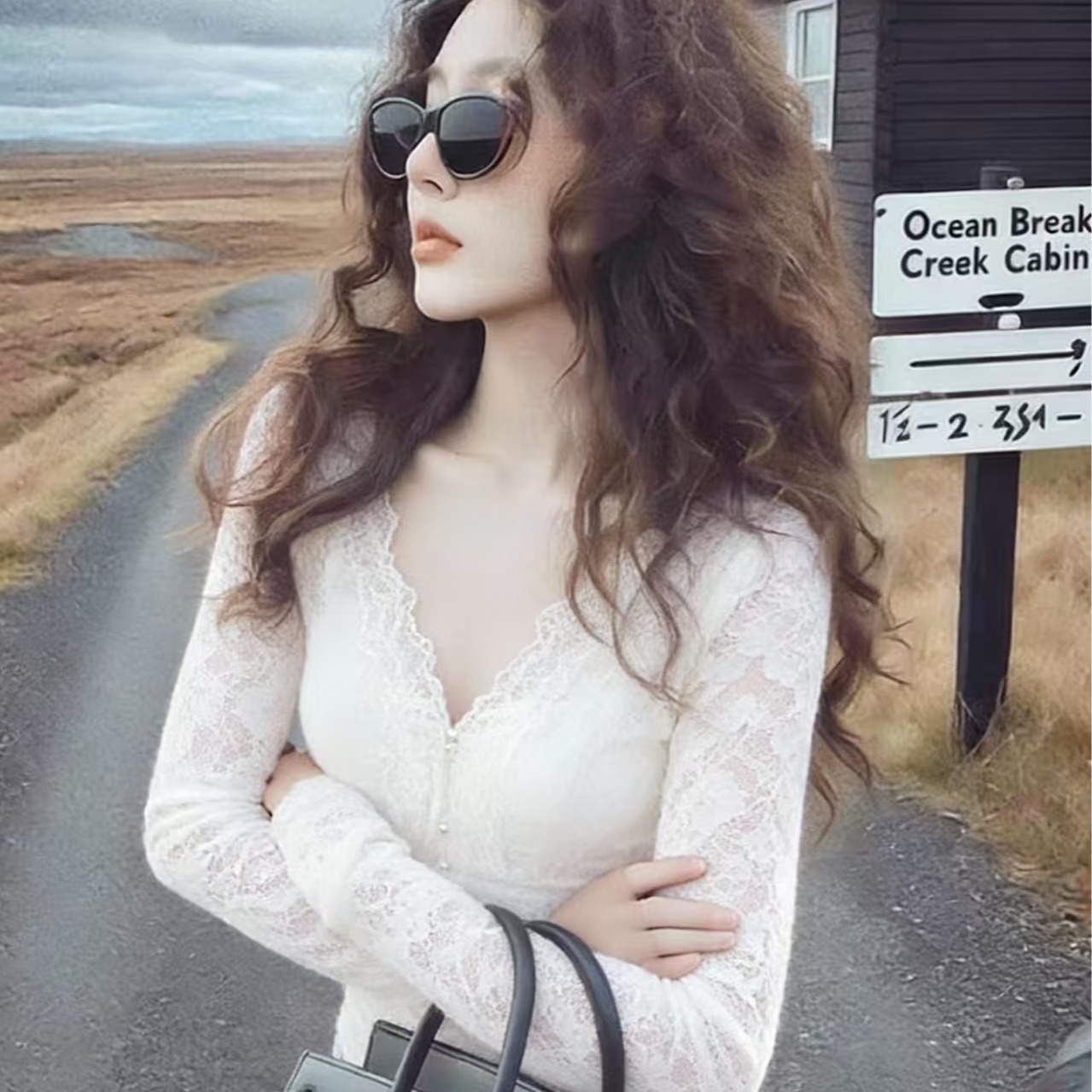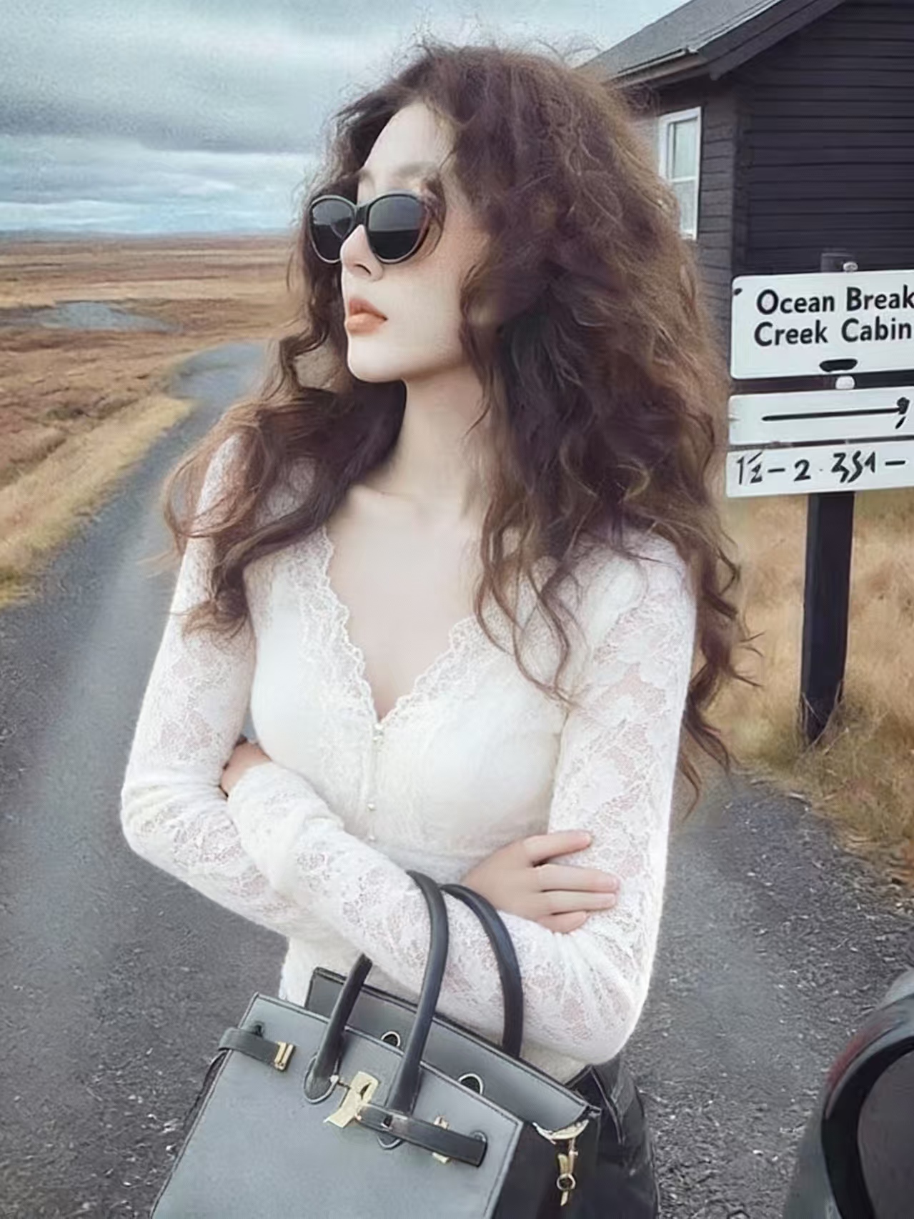 FA51326# 法式独特小上衣时尚洋气冷淡系高级感春秋款白色蕾丝V领上衣 服裝批發女裝批發服飾貨源