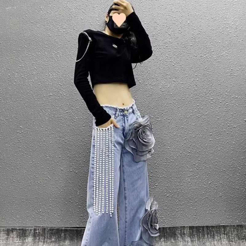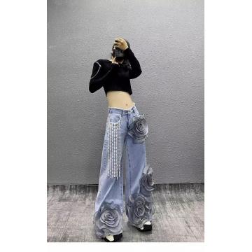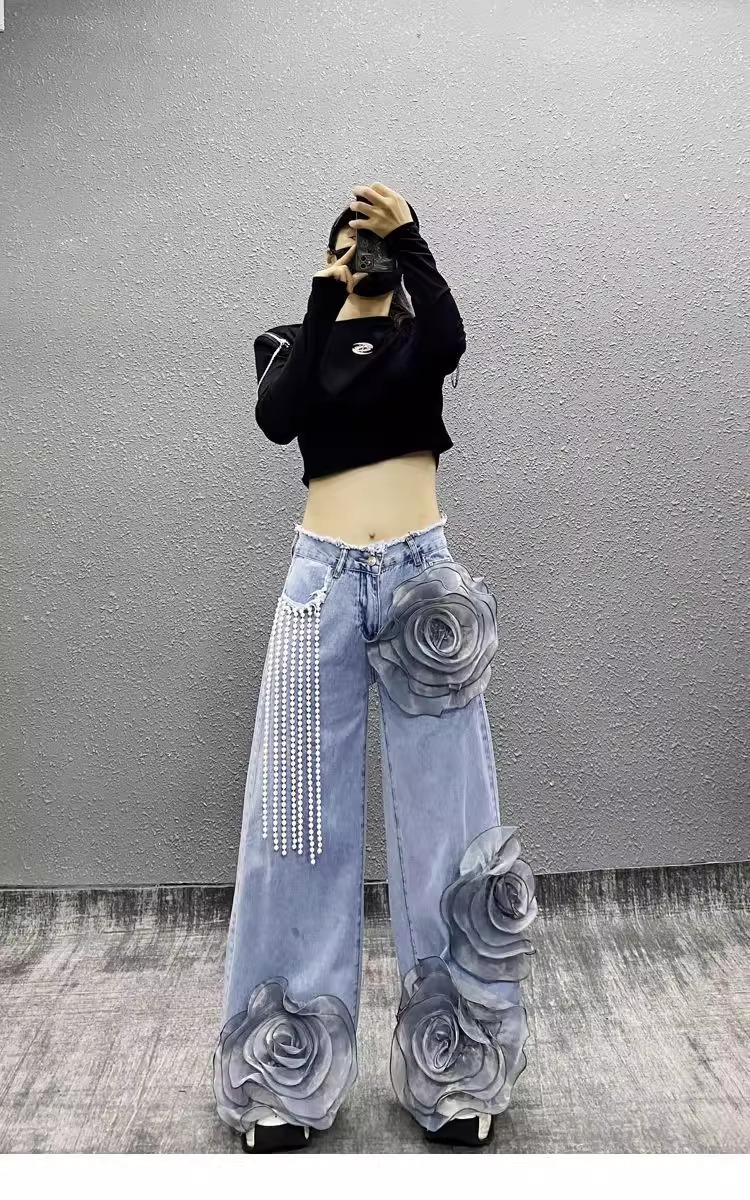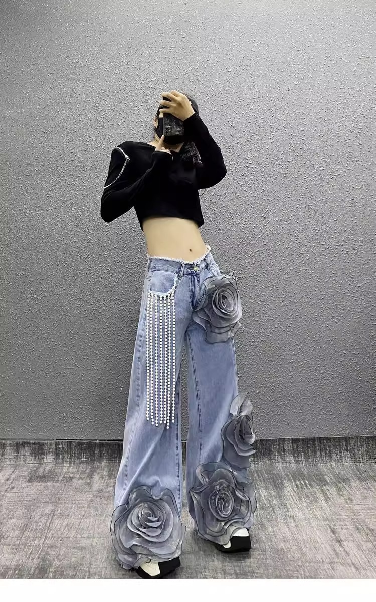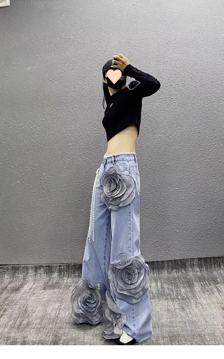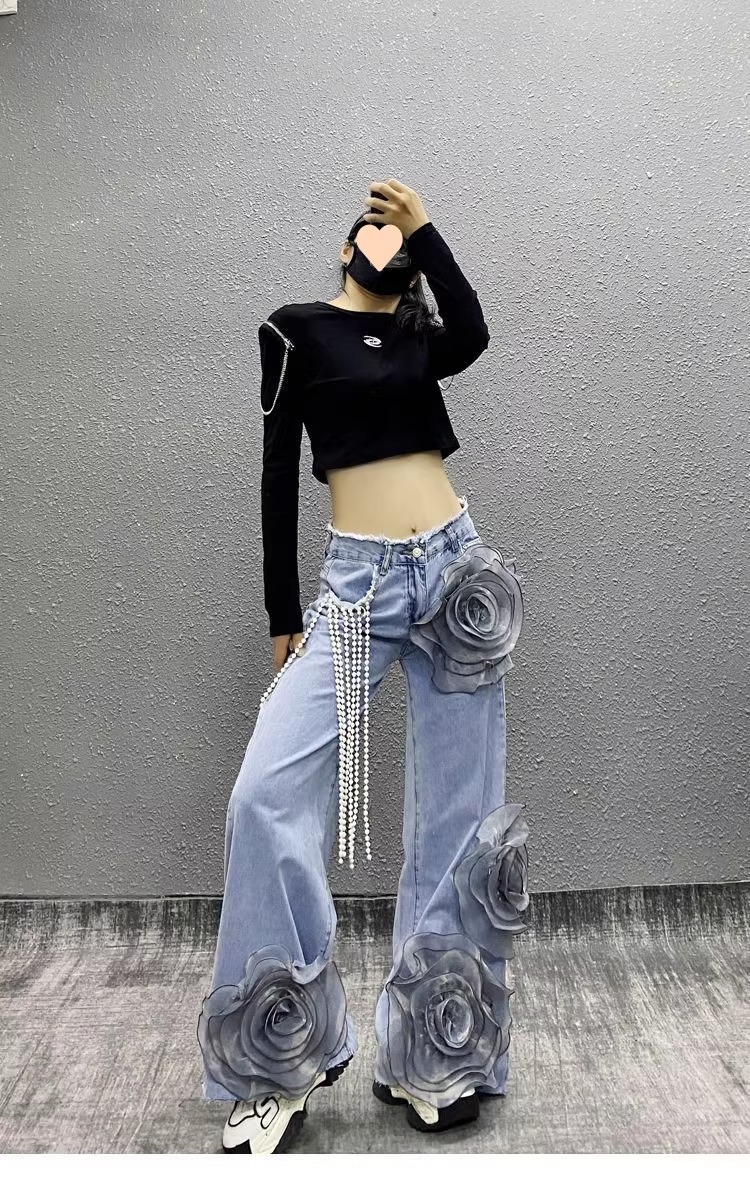 Home > 牛仔裤、长裤 > LN76396# 春夏季新款潮流百搭时尚洋气设计感街头女立体大花朵牛仔长裤