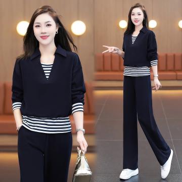 FA52245# 新品高品质休闲套装女秋季新款洋气条纹拼接假卫衣阔腿裤显瘦两件套 服裝批發女裝批發服飾貨源