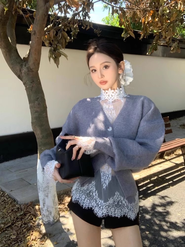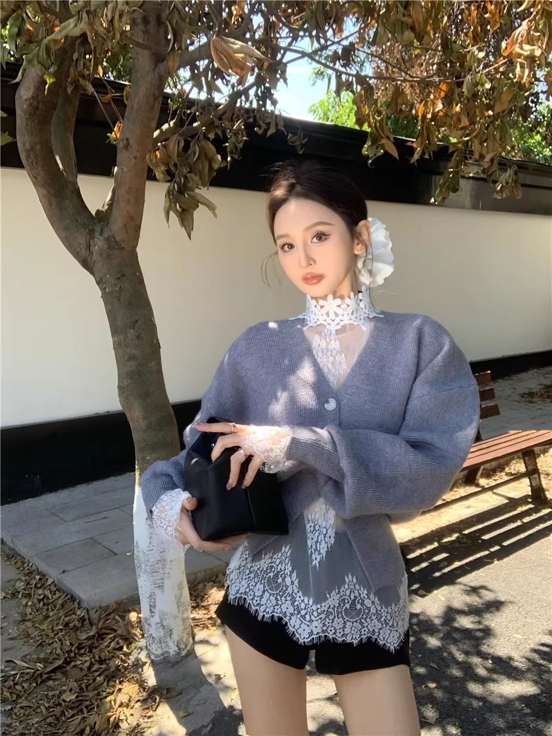 FA52819# 复古灰色毛衣外套女秋冬季新款法式气质v领宽松显瘦针织开衫上衣 服裝批發女裝批發服飾貨源