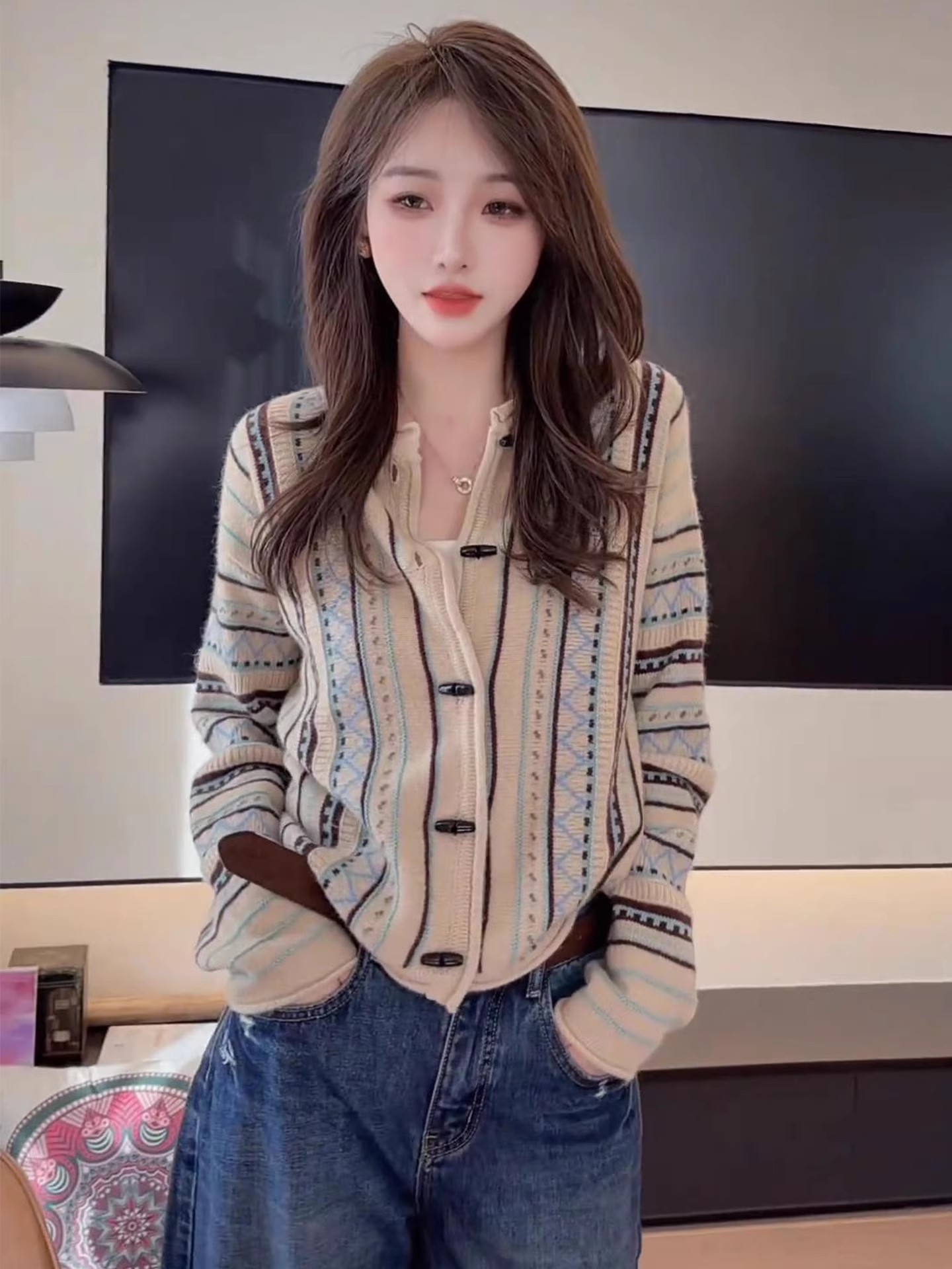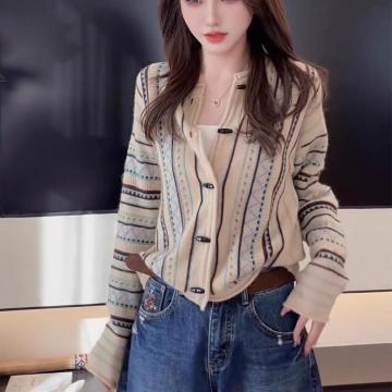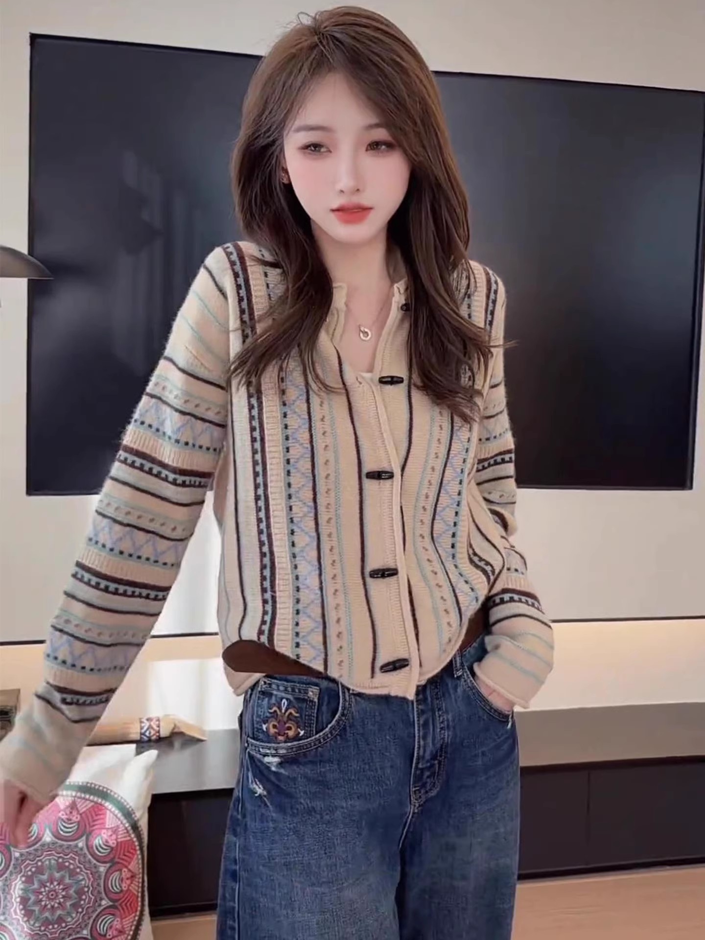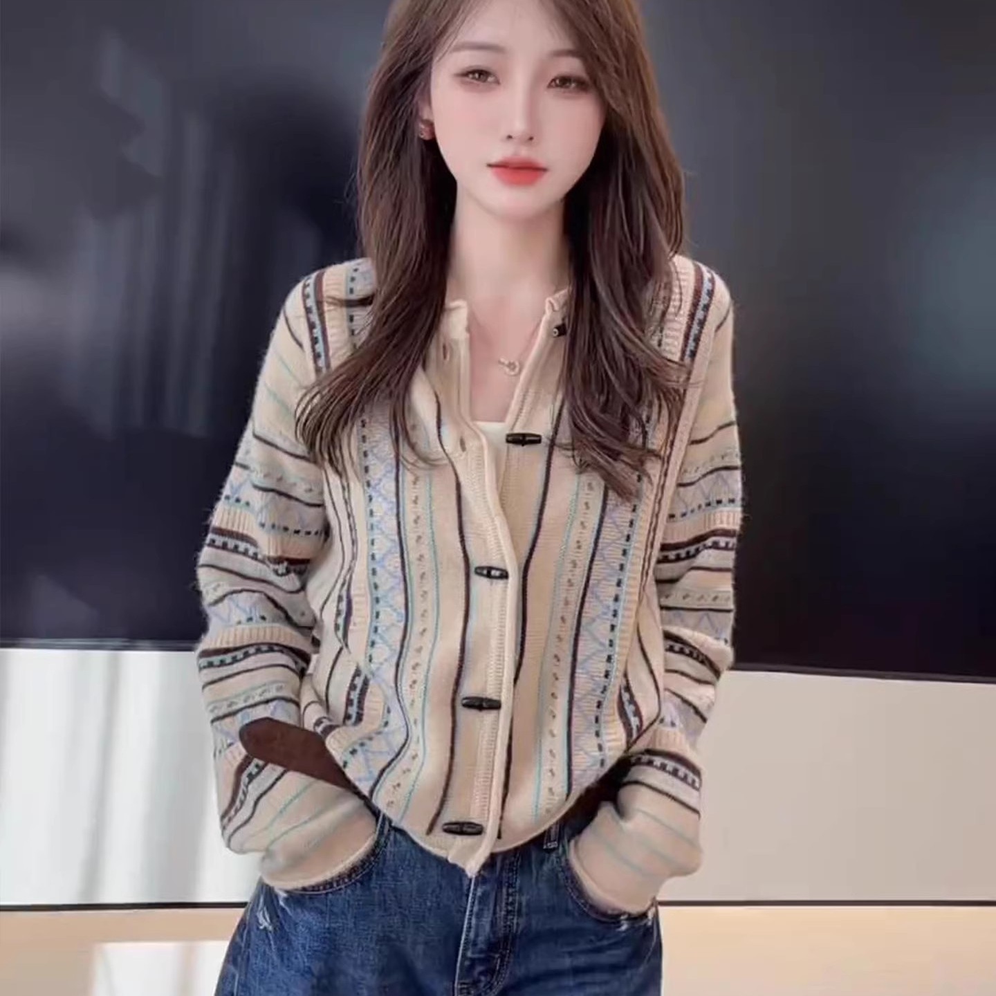 FA52821# 独特超好看牛角扣提花毛衣外套女秋冬穿搭高级感长袖针织开衫上衣 服裝批發女裝批發服飾貨源