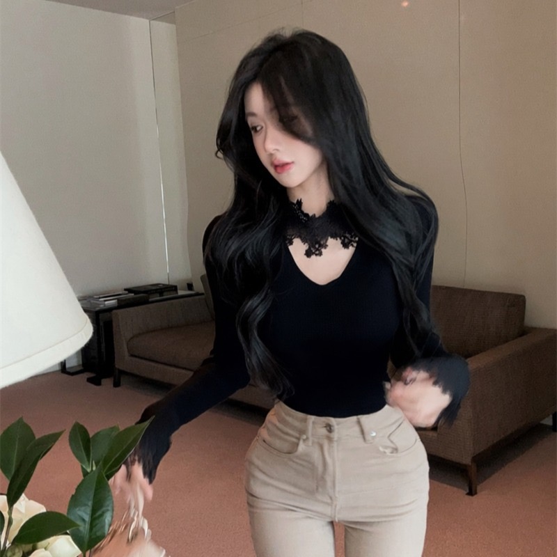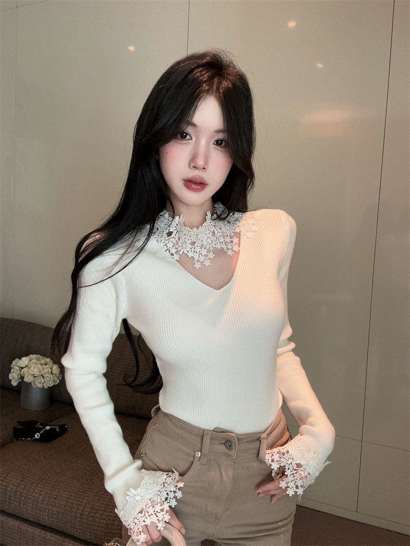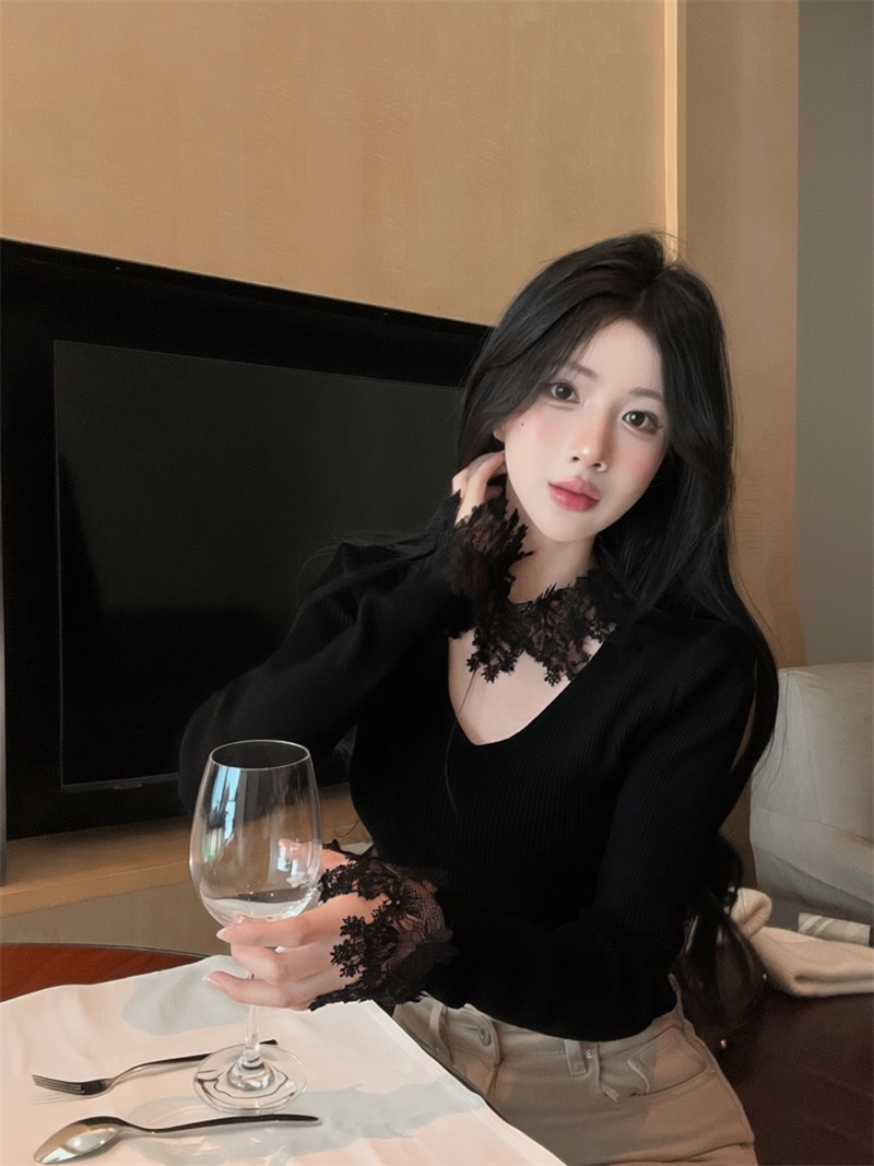 FA54471# 温柔风V领长袖针织衫春秋蕾丝拼接打底衫上衣女 服裝批發女裝批發服飾貨源
