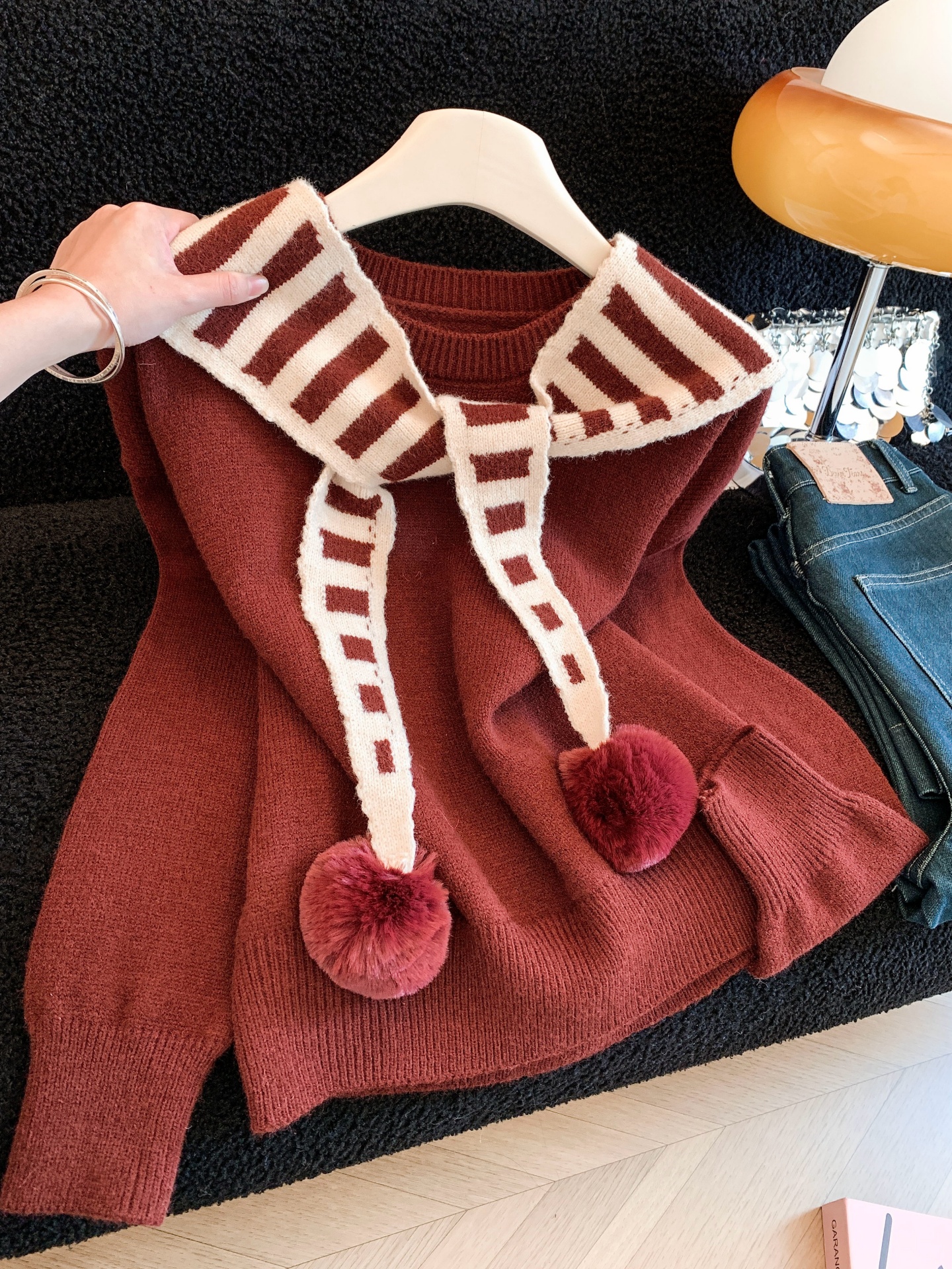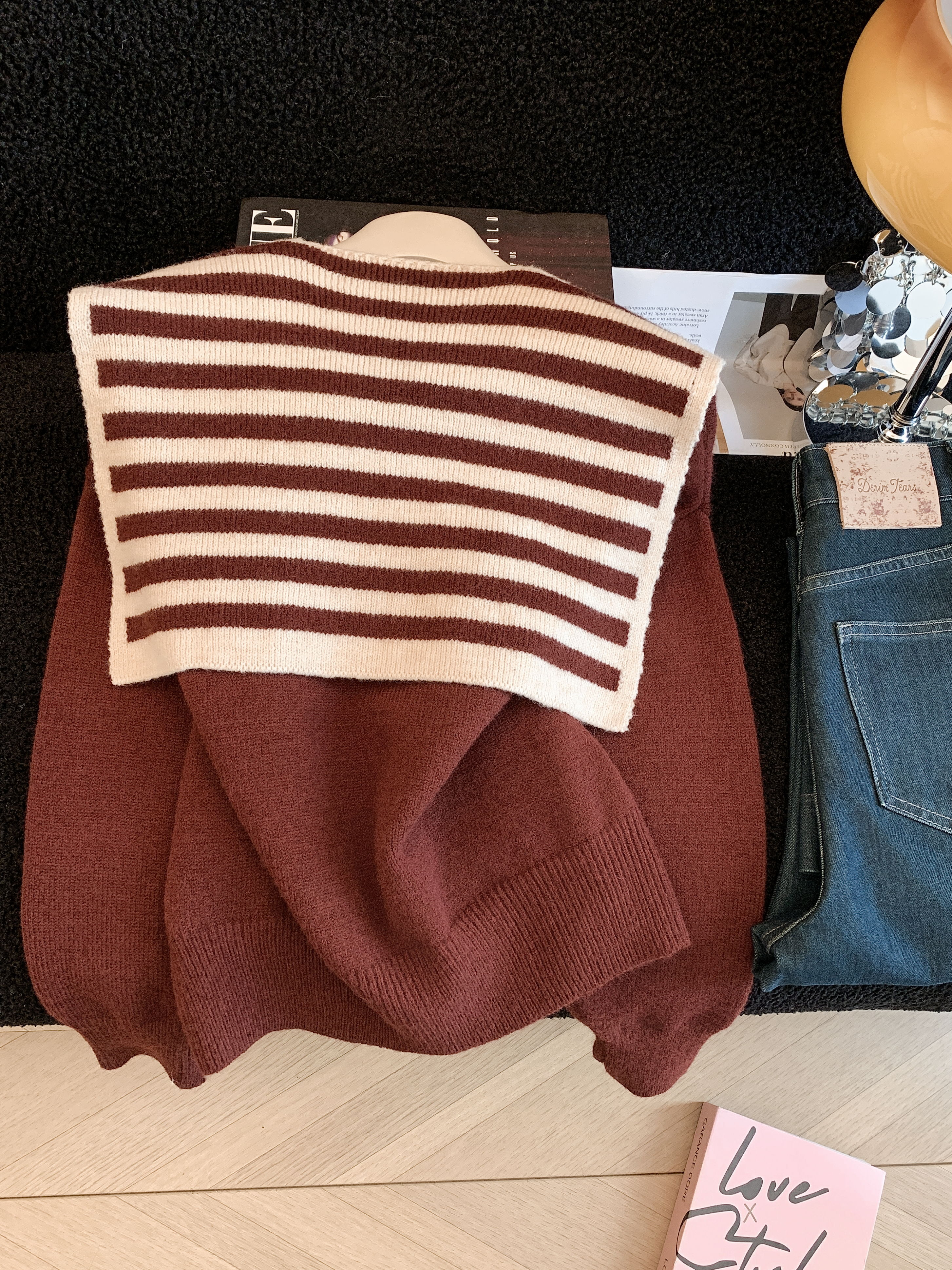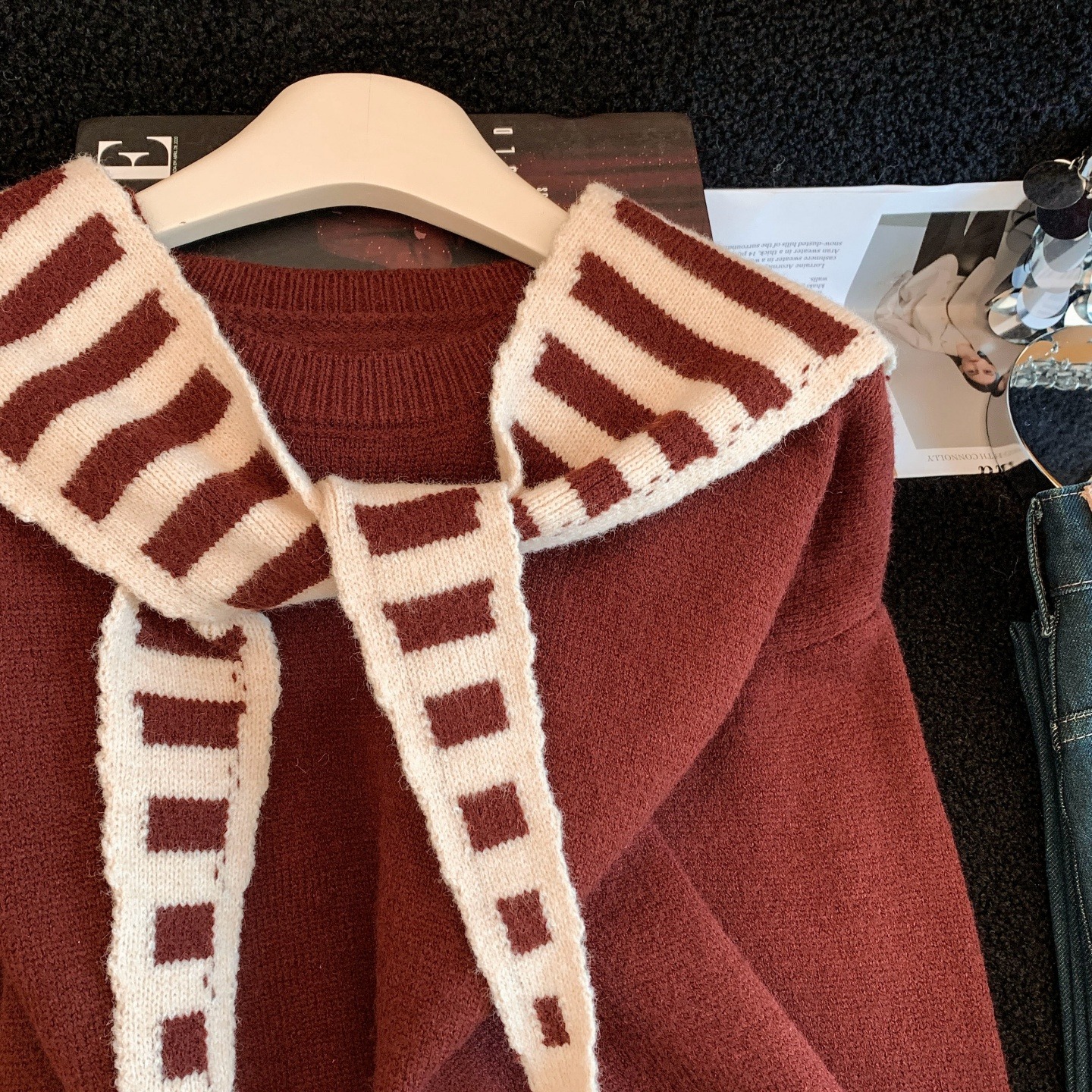 FA54762# ~条纹披肩针织衫安可拉红色毛衣女秋冬海军领上衣套装 服裝批發女裝批發服飾貨源