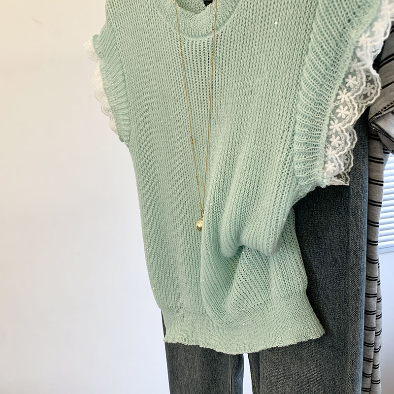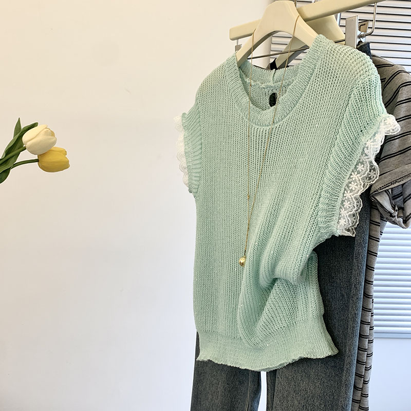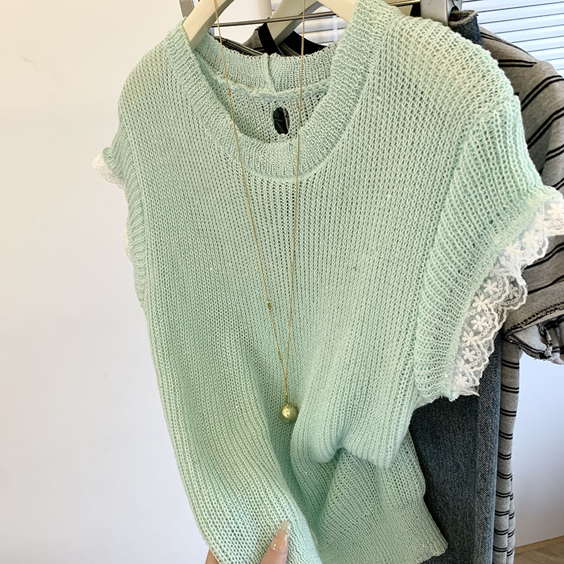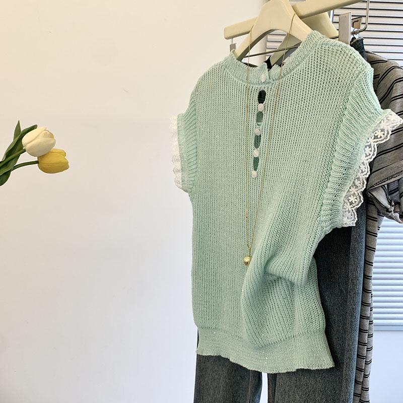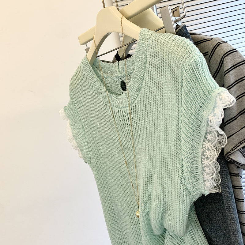 FA54854# 蕾丝拼接短袖t恤女新款女夏季针织衫后背镂空设计感上衣薄款 服裝批發女裝批發服飾貨源