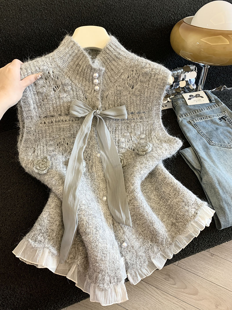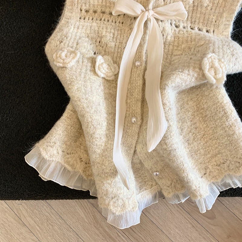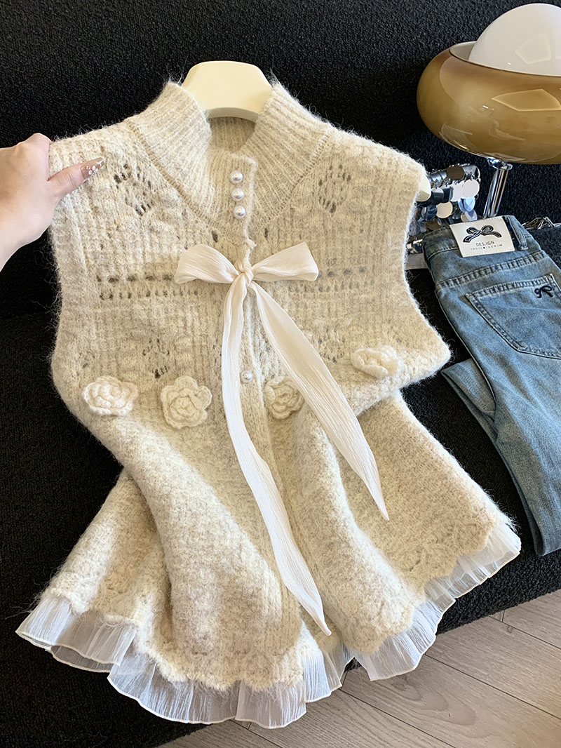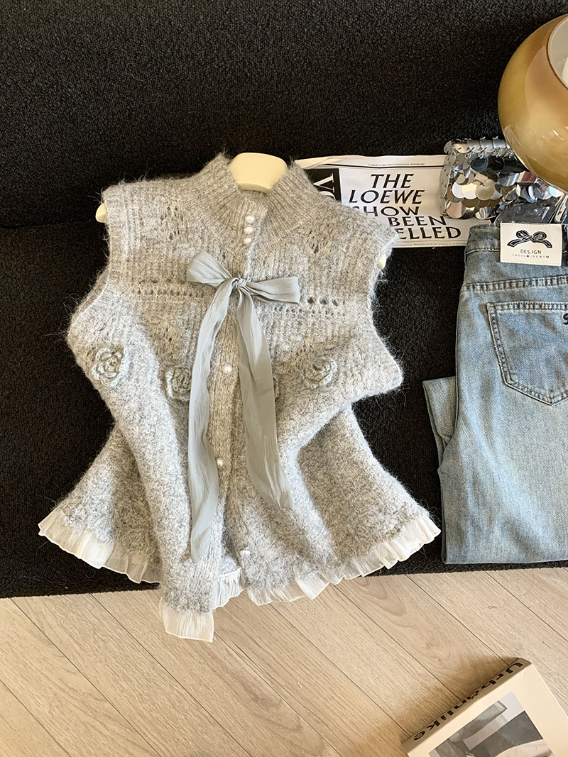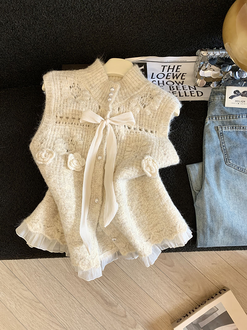 FA54858# 法式温柔风立体花朵针织马甲女秋冬百搭叠穿蝴蝶结毛衣背心 服裝批發女裝批發服飾貨源