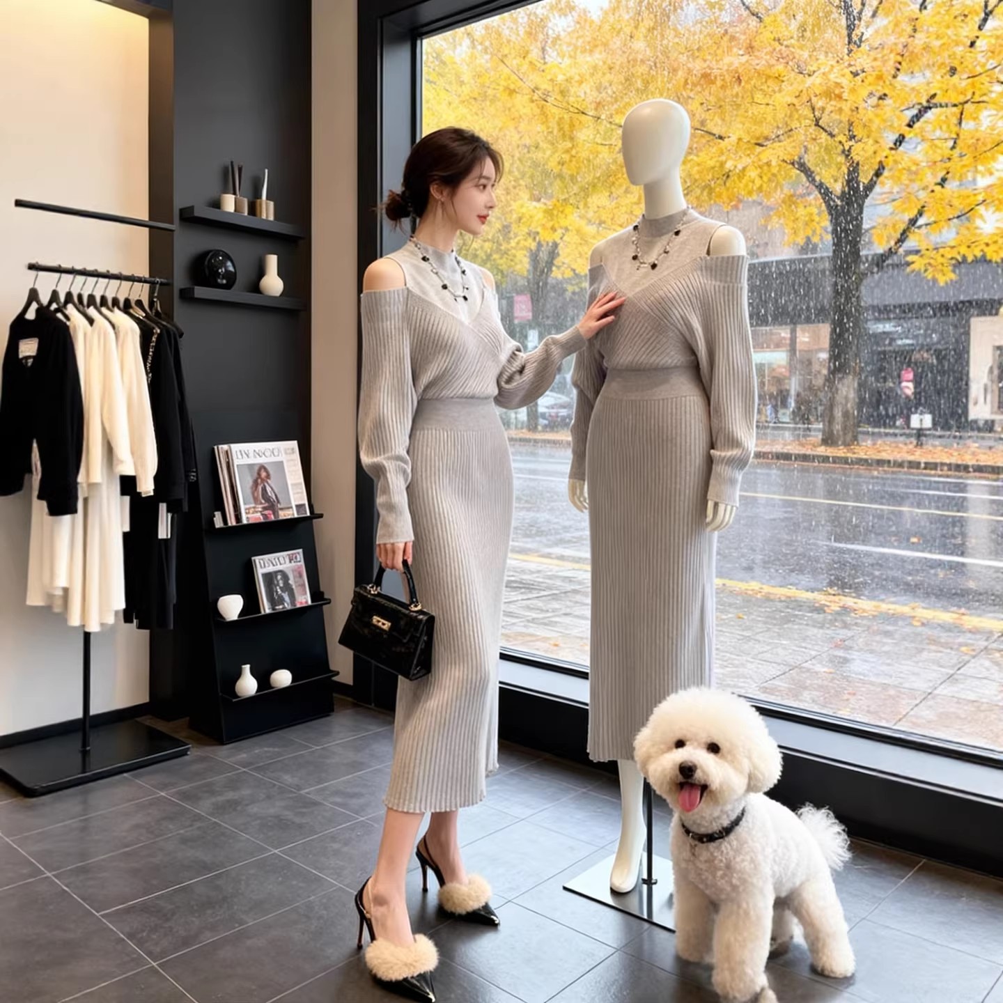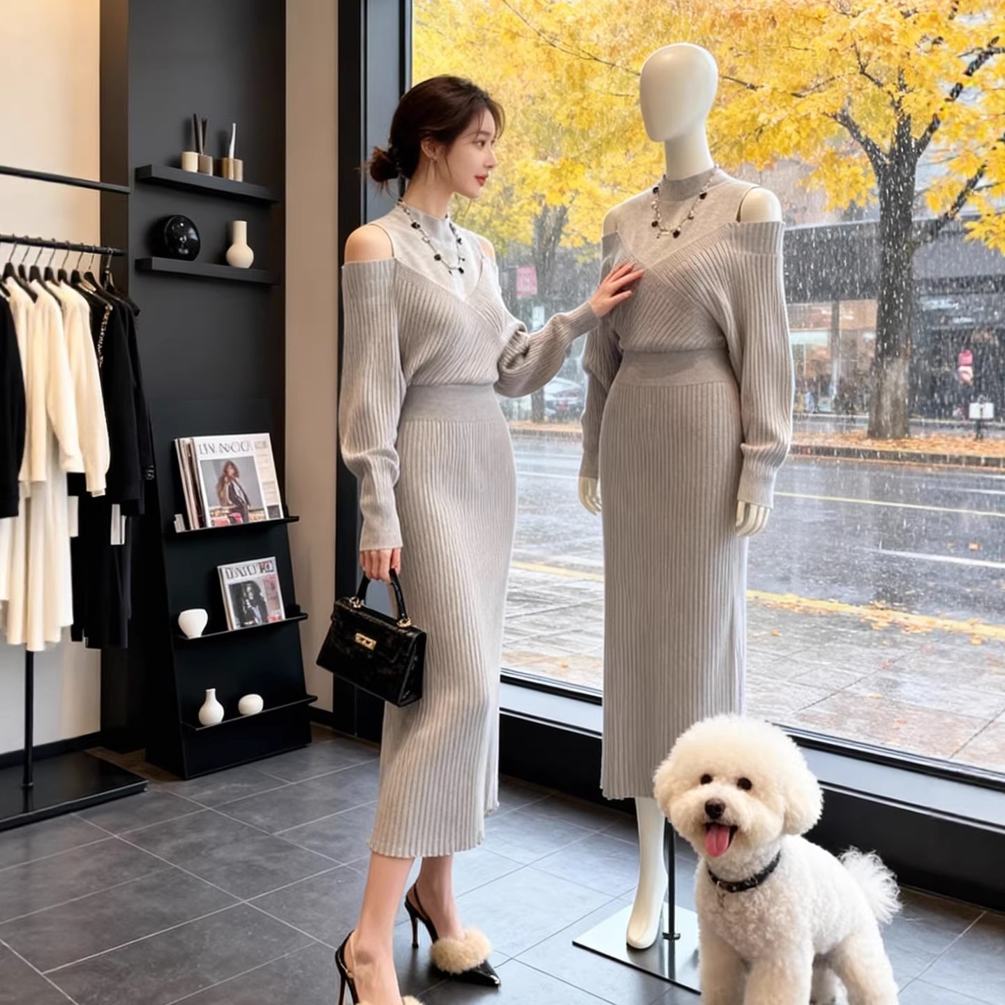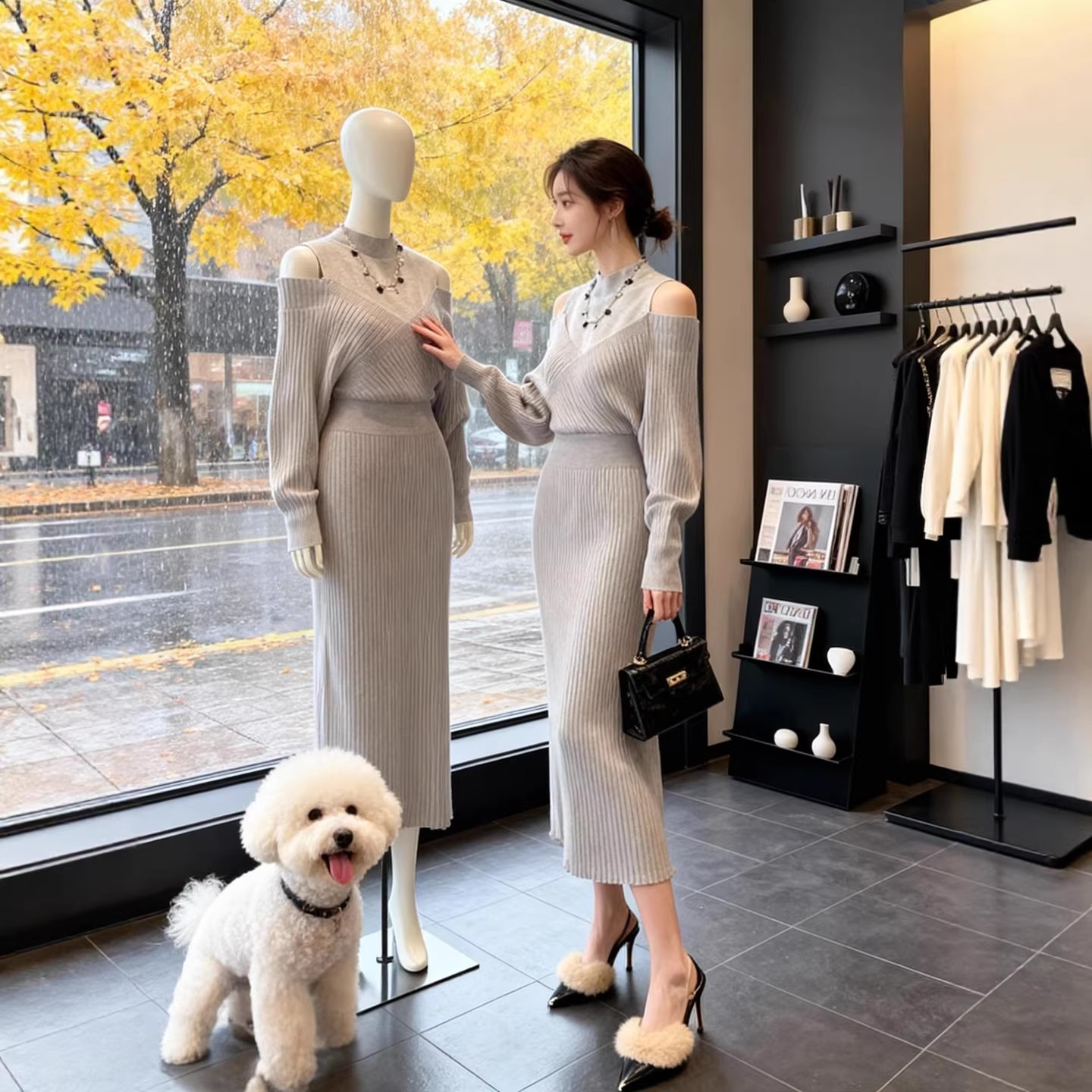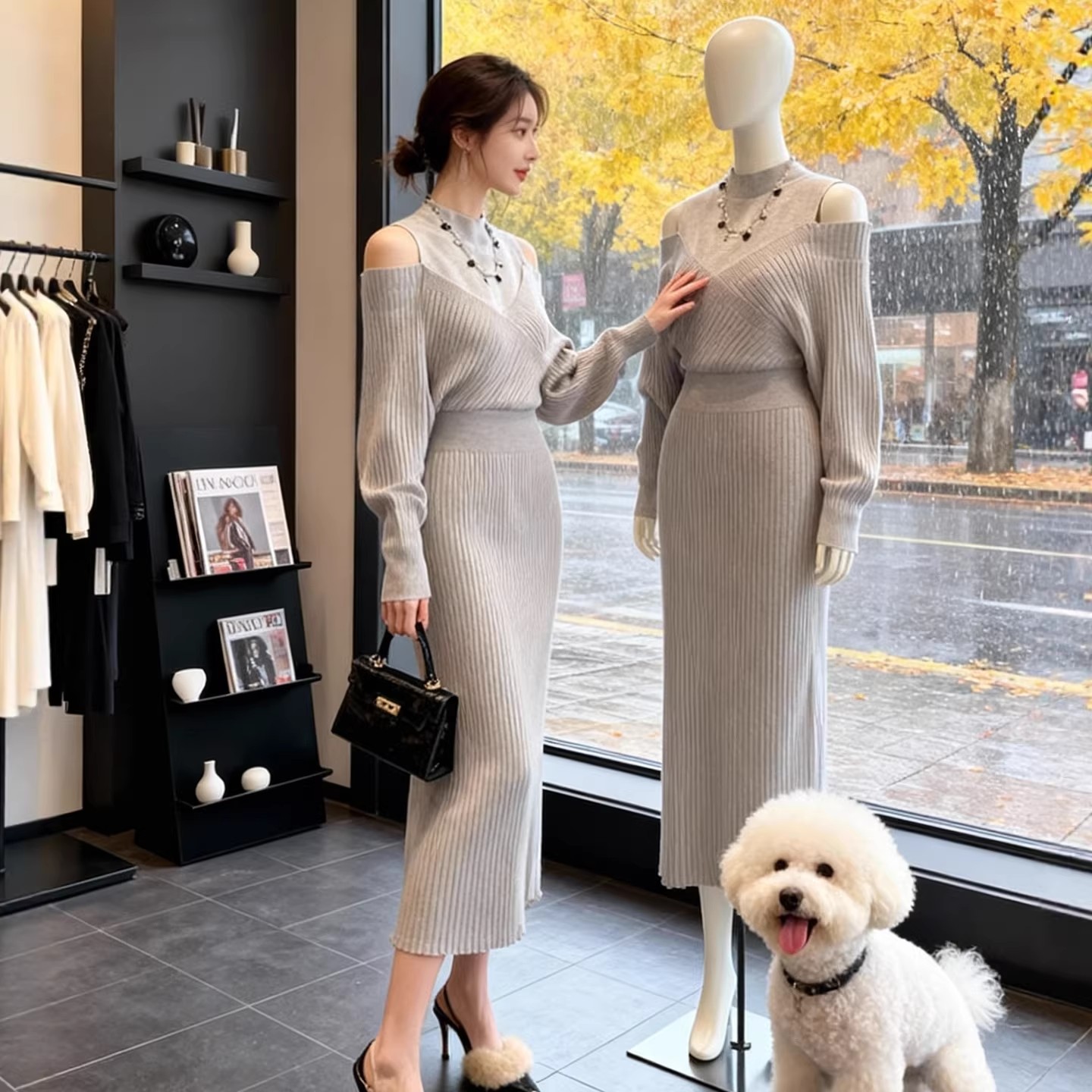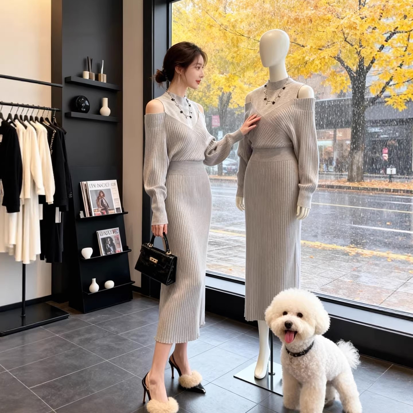 FA54943# 法式气质假两件露肩连衣裙女秋冬新款高级感慵懒风针织长裙子 服裝批發女裝批發服飾貨源