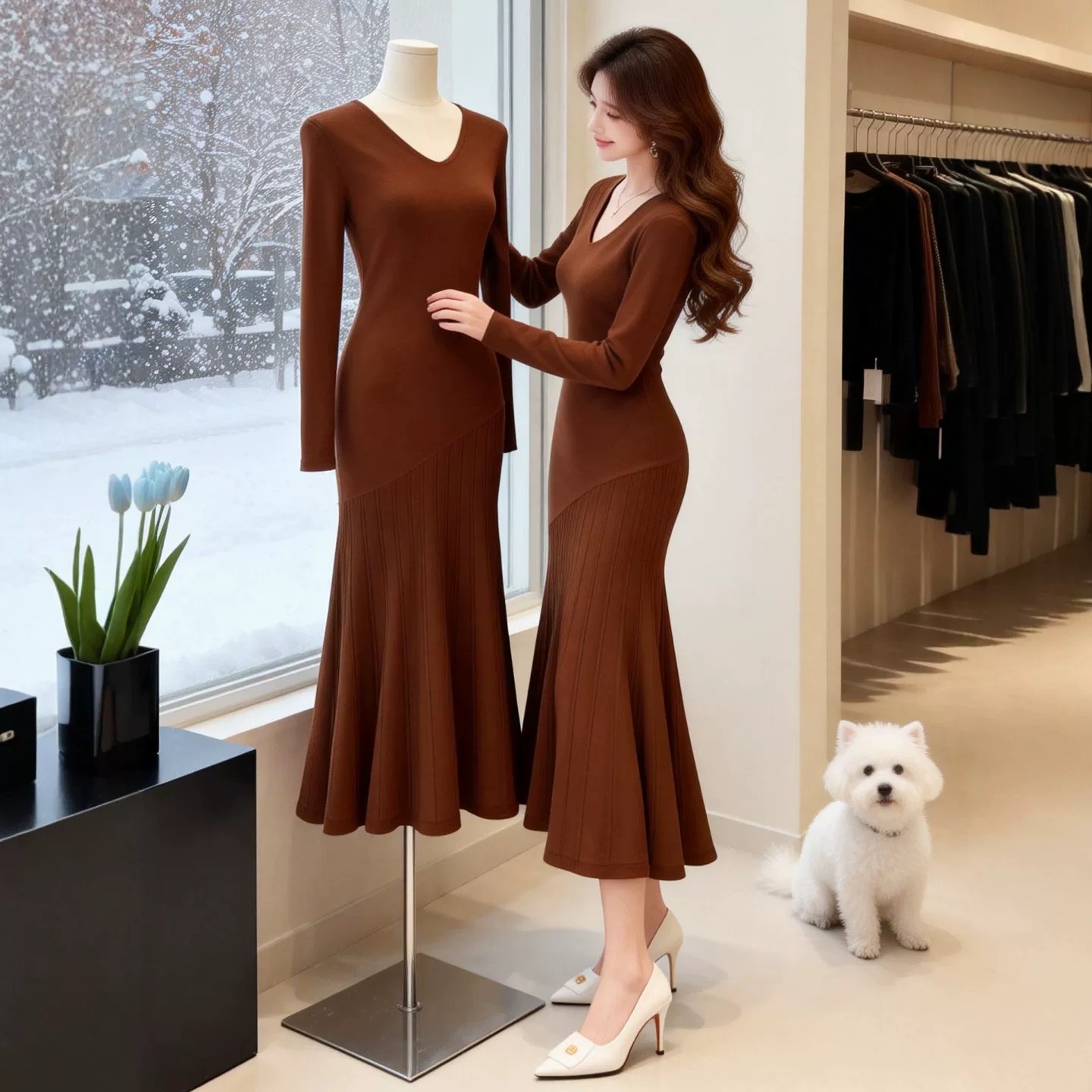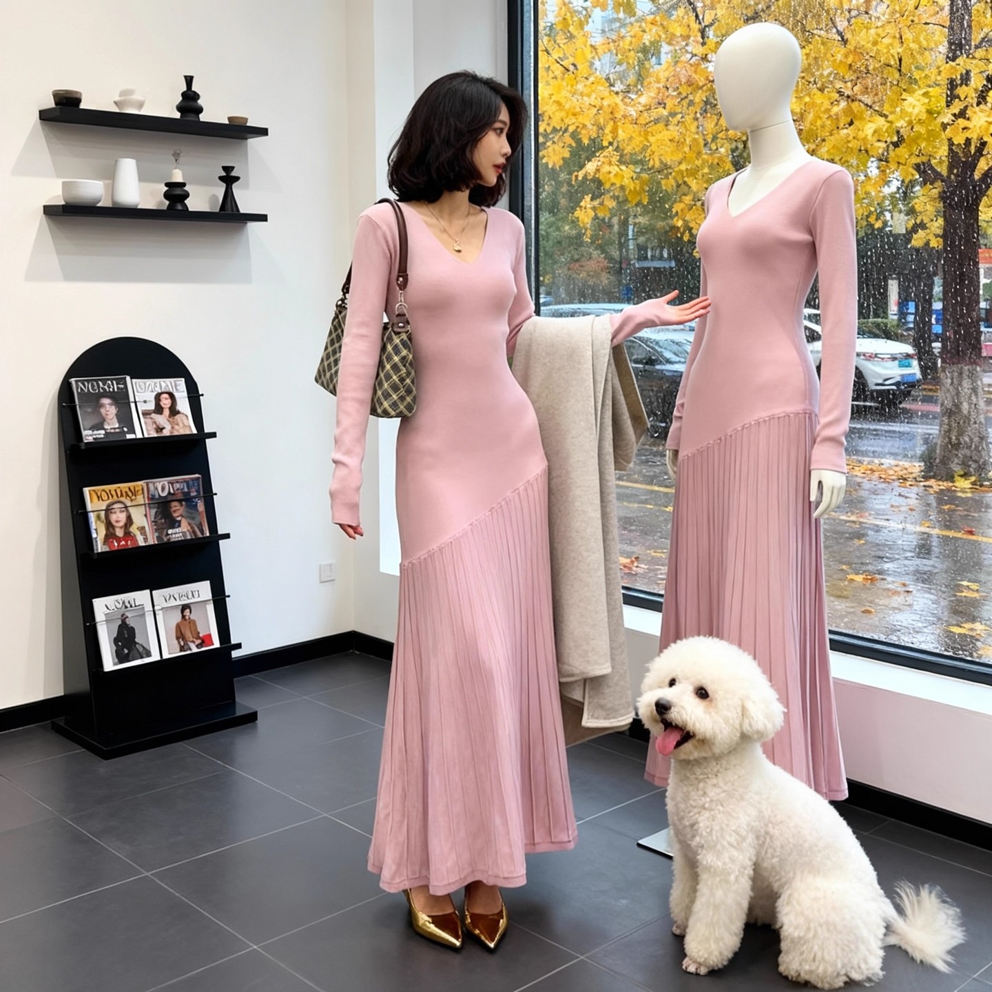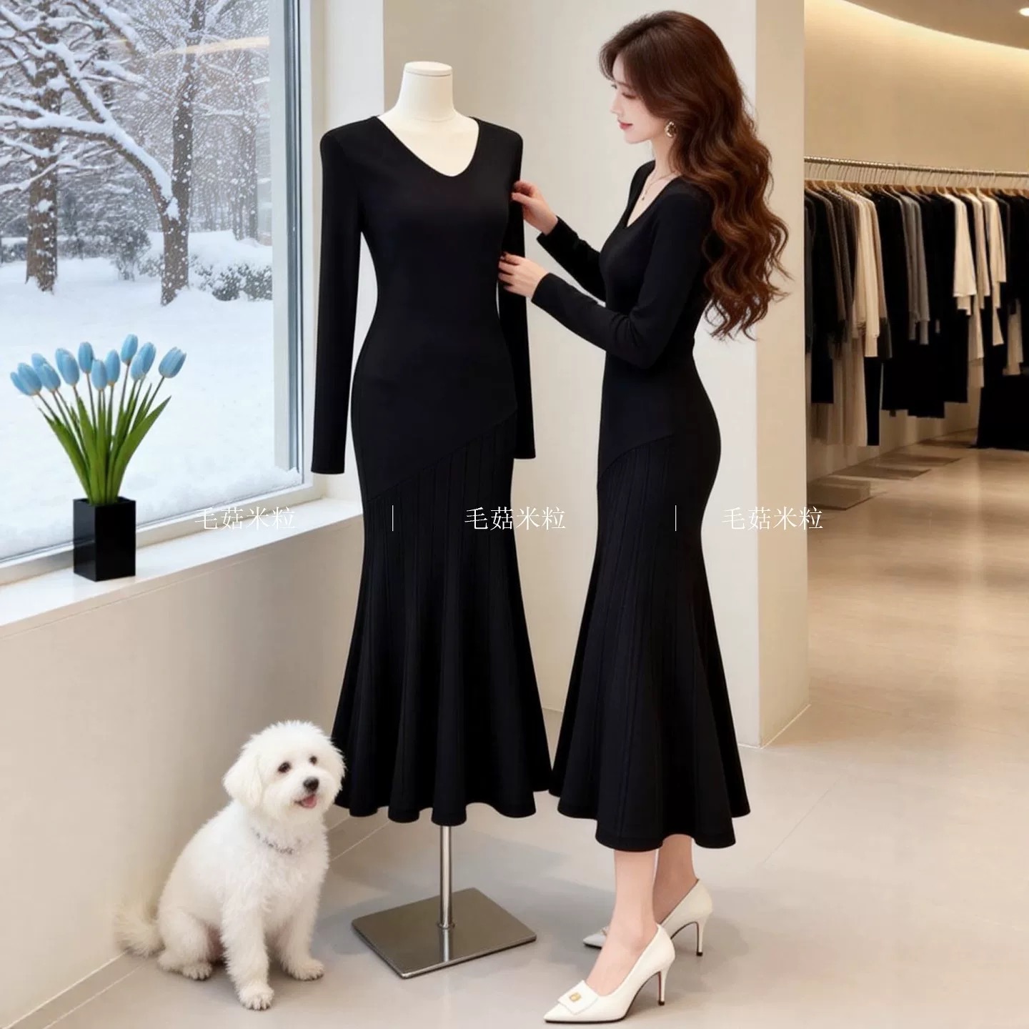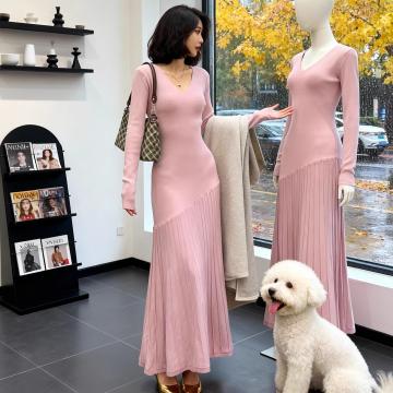 FA54945# 复古港风优雅性感V领针织连衣裙女春季收腰显瘦设计感长裙 服裝批發女裝批發服飾貨源