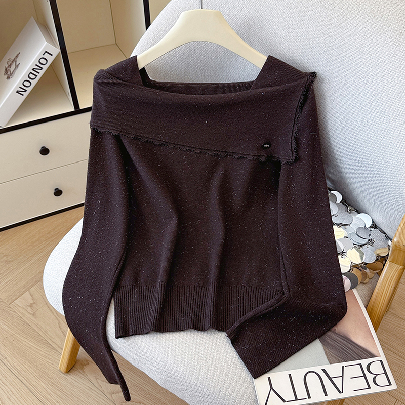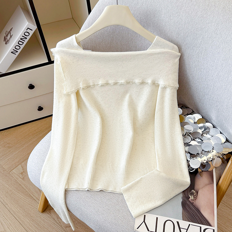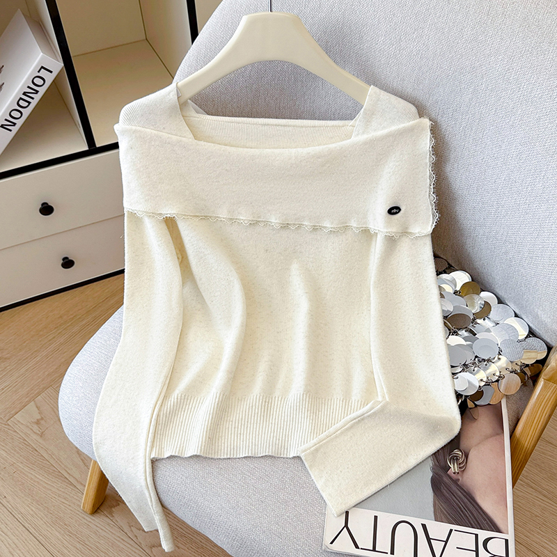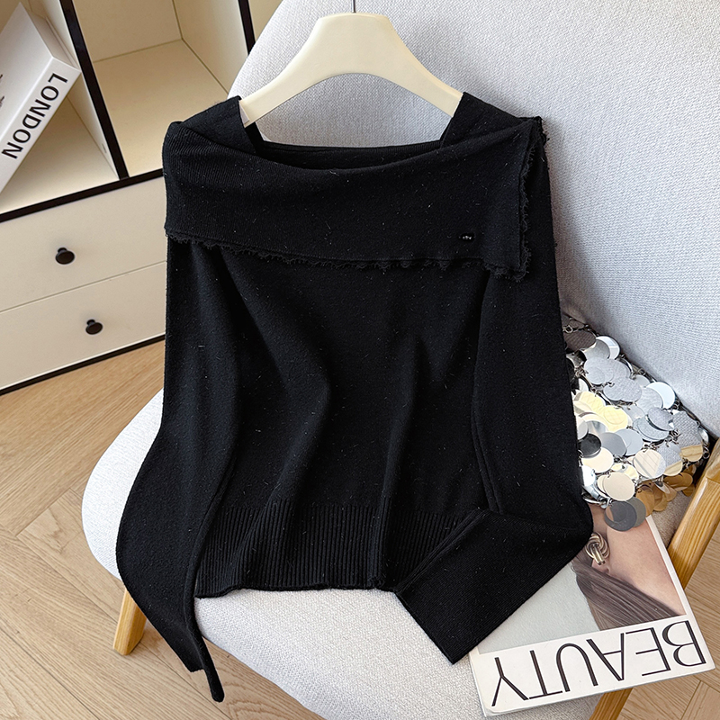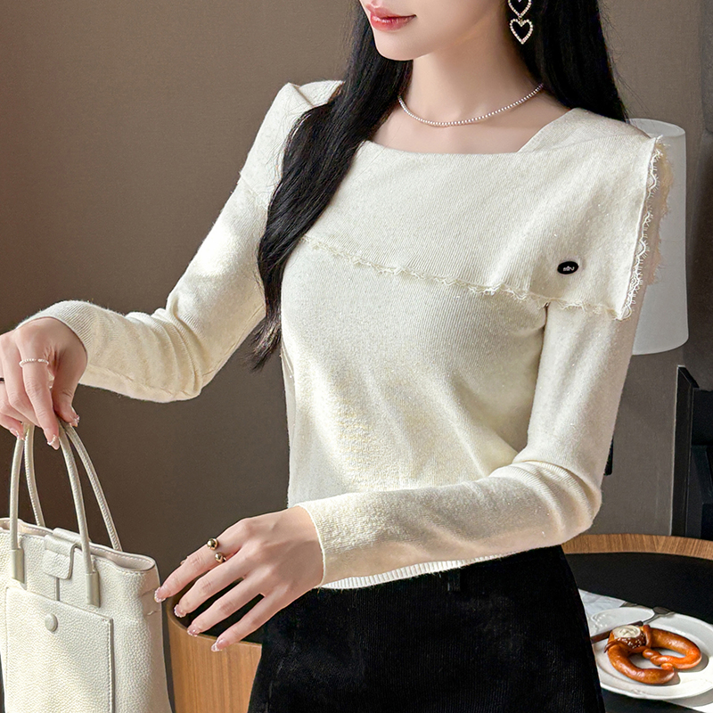 FA54977# 有货秋冬蕾丝边荷叶亮丝针织女设计感贝壳扣方领上衣打底衫外穿 服裝批發女裝批發服飾貨源
