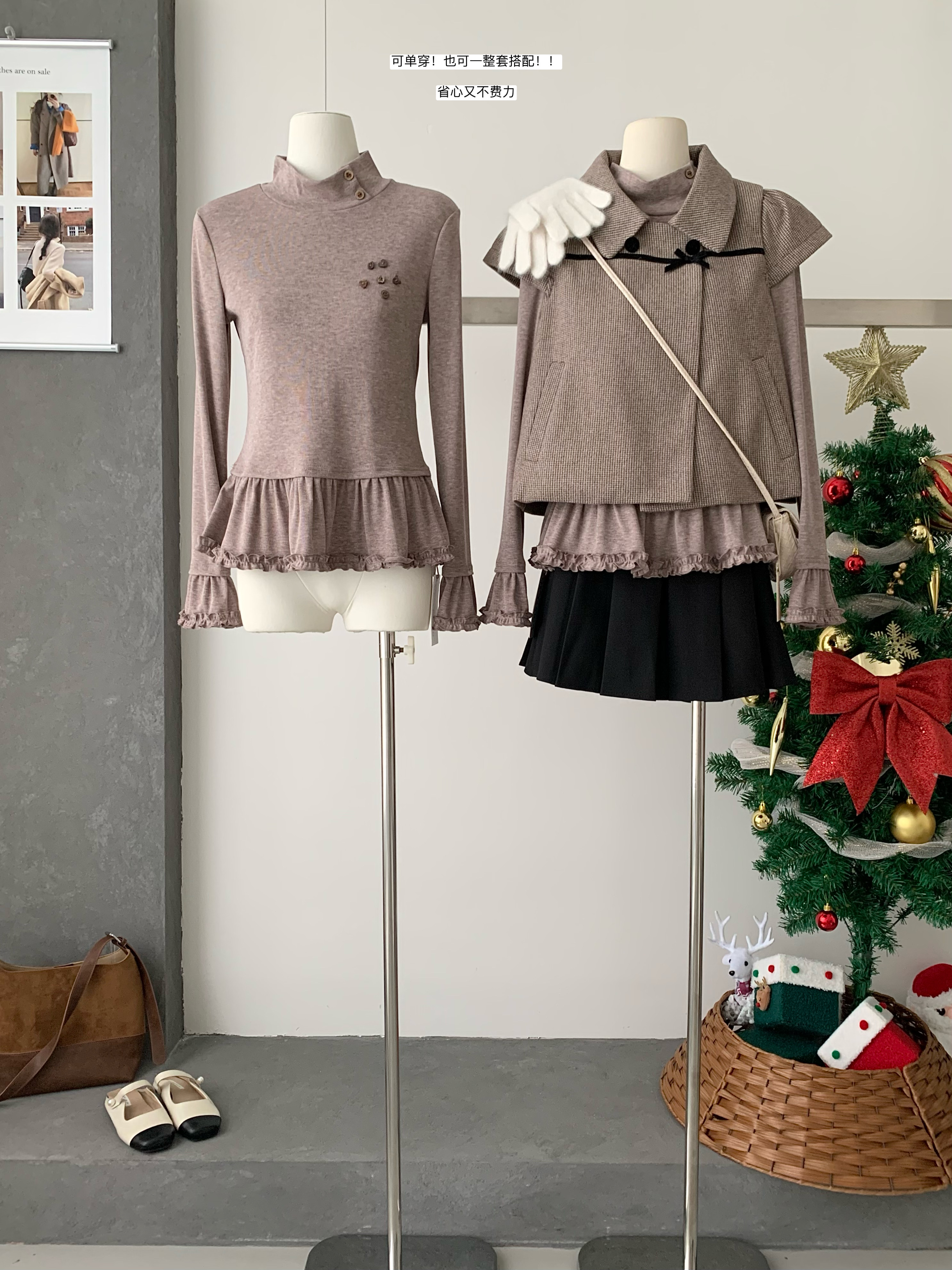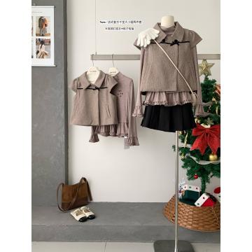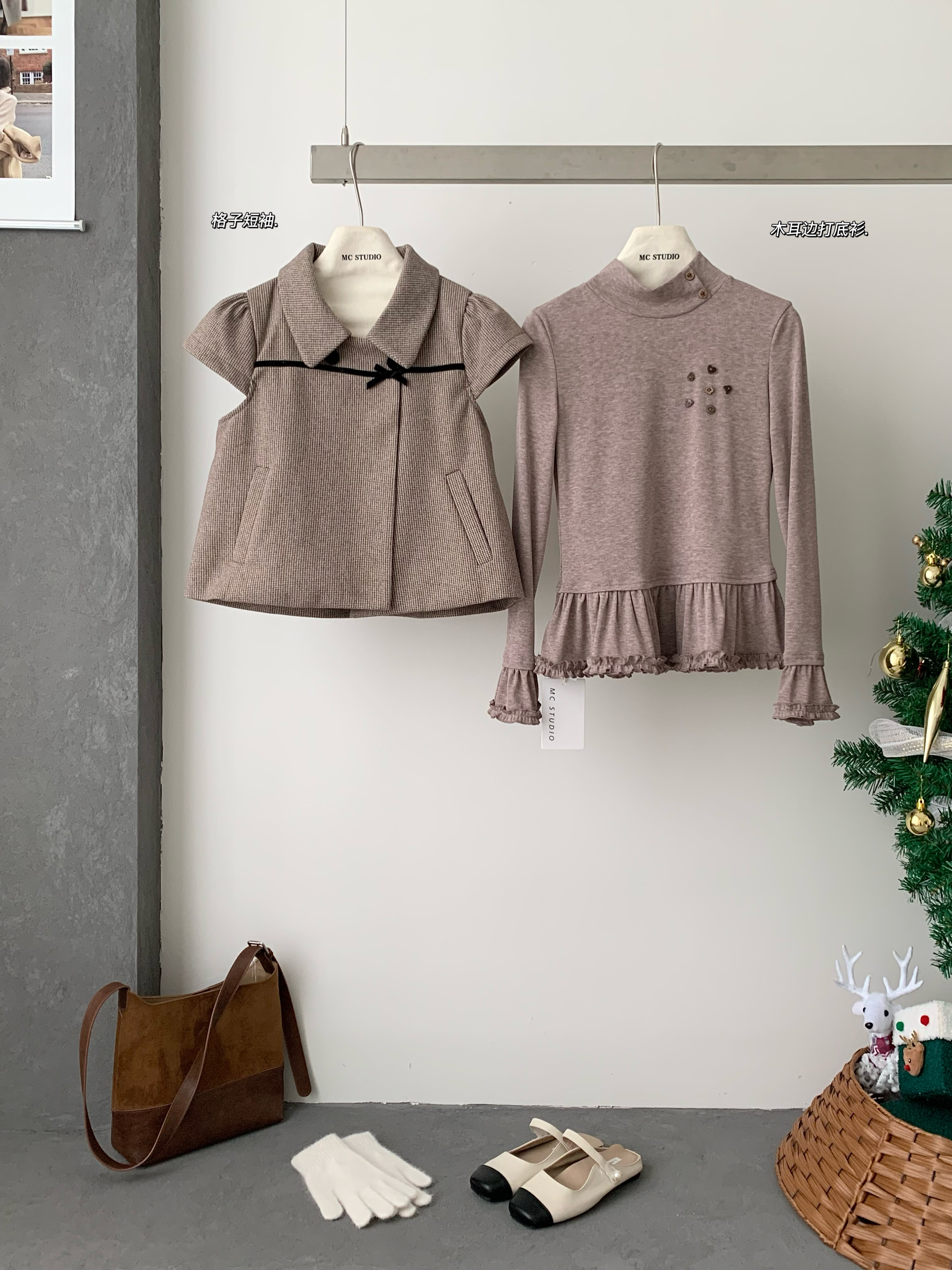 FA55012# 韩系减龄两件套女木耳边打底衫格纹POLO领开衫两件套装 服裝批發女裝批發服飾貨源