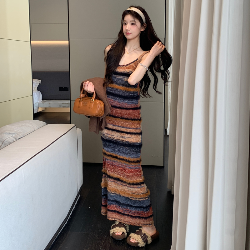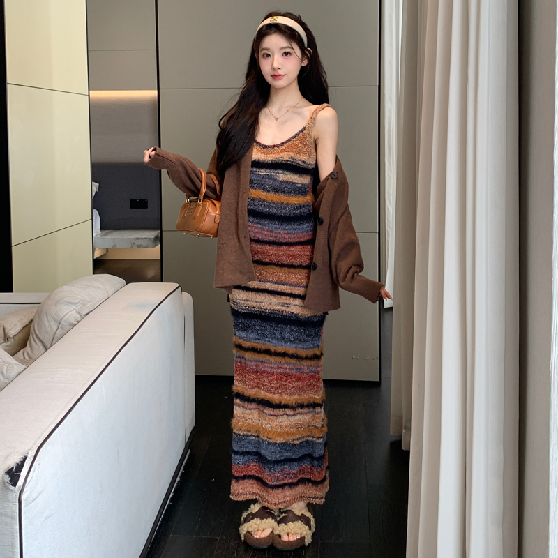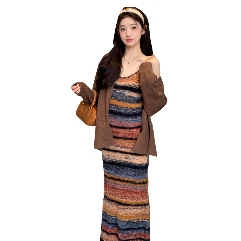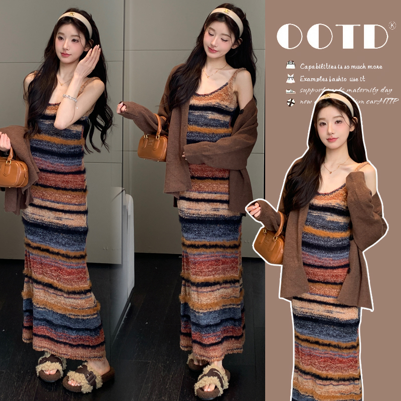 FA55032# 秋冬新款连衣裙孕期穿搭毛衣开衫条纹背带裙套装 服裝批發女裝批發服飾貨源