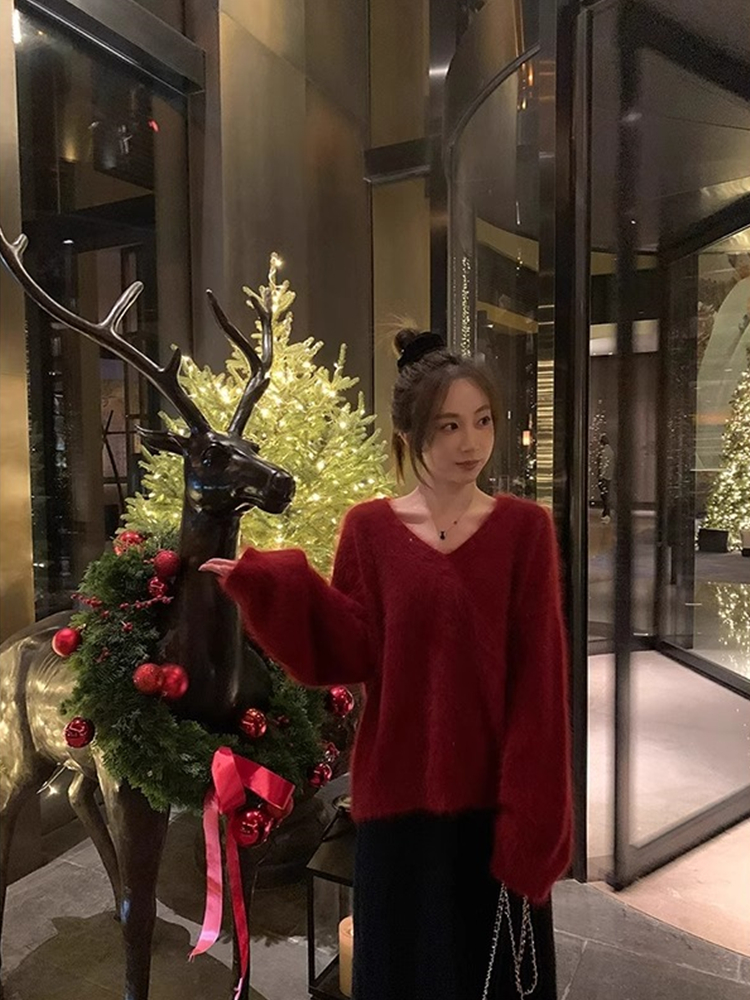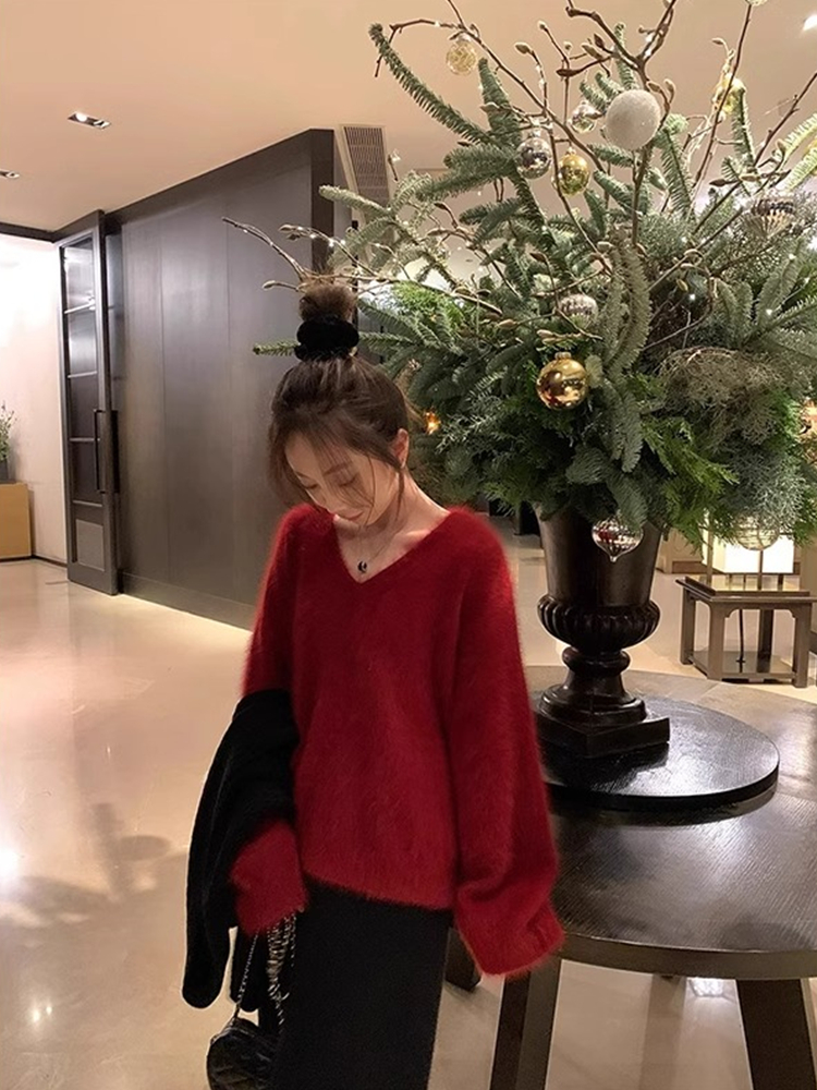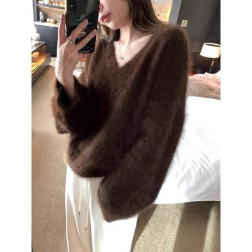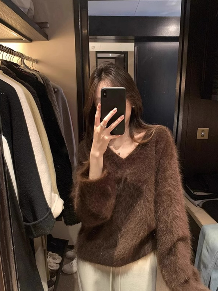 FA55039# 咖色高级感V领水貂绒毛衣女秋冬季慵懒风宽松打底软糯针织衫上衣 服裝批發女裝批發服飾貨源