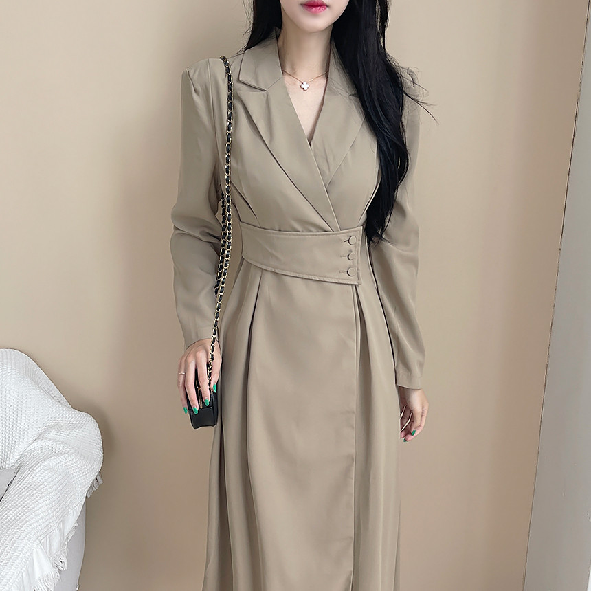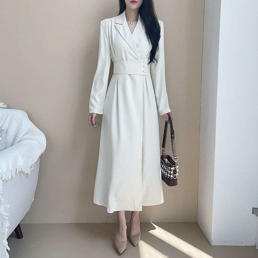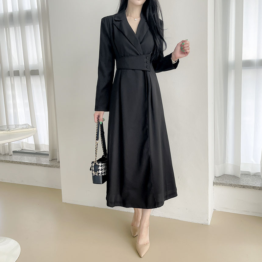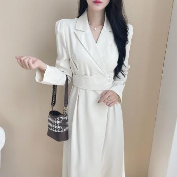 FA55068# 韩国chic春季法式轻奢赫本风气质翻领收腰显瘦设计感西装连衣裙 服裝批發女裝批發服飾貨源