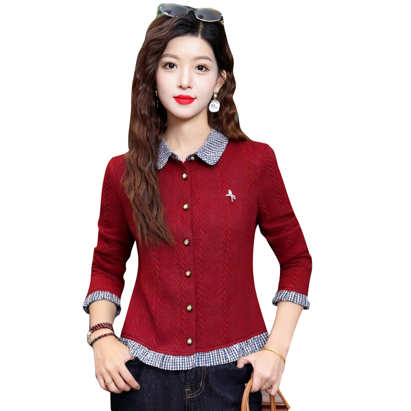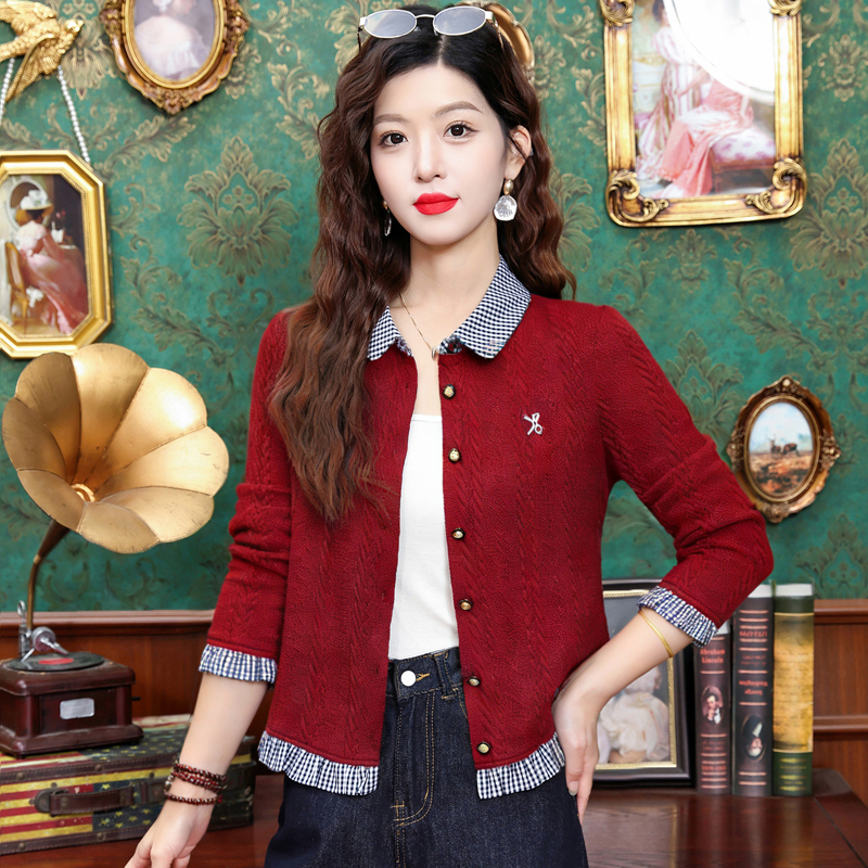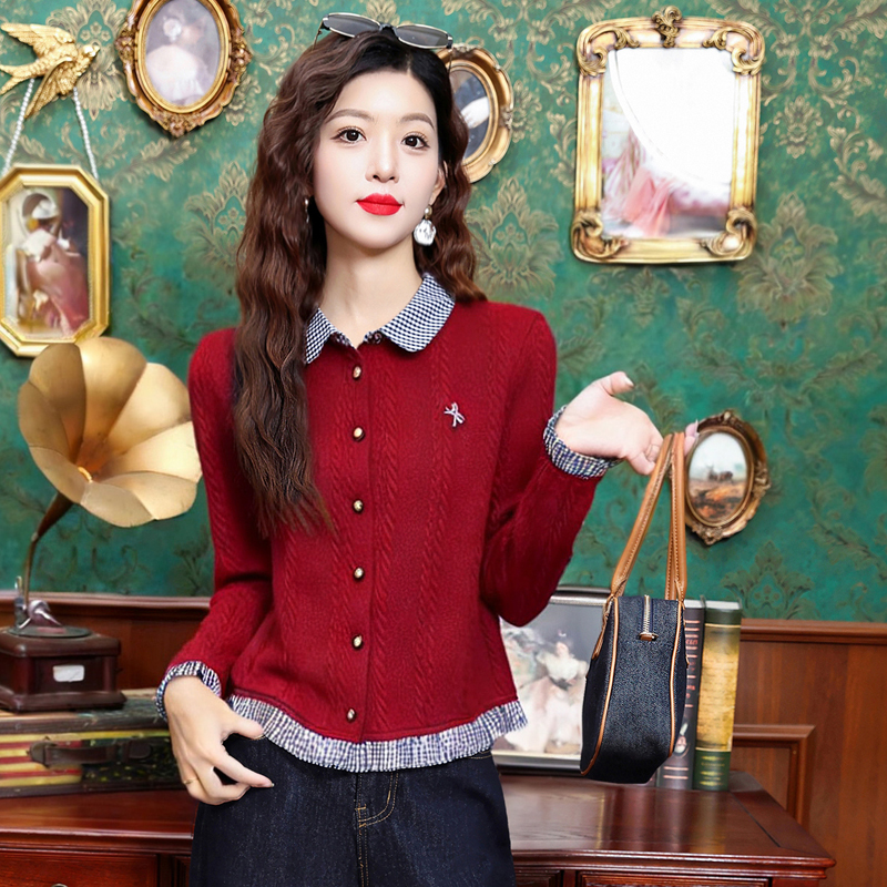 FA55364# 春秋时尚假两件针织毛衣洋气减龄蝴蝶结格子翻领气质开衫上衣 服裝批發女裝批發服飾貨源