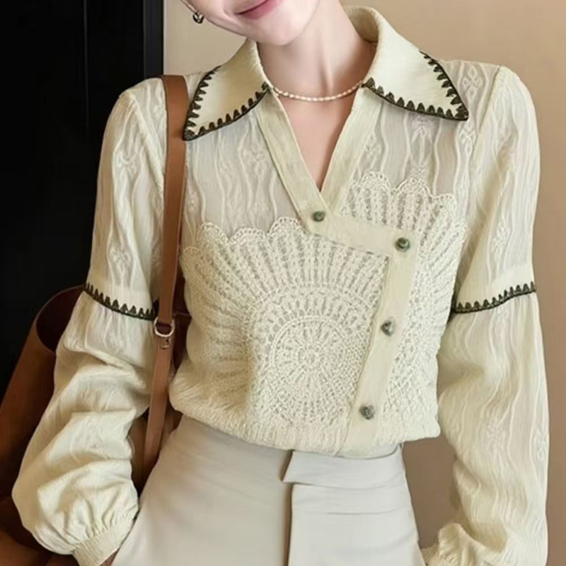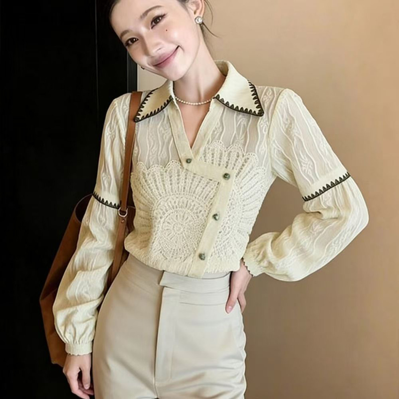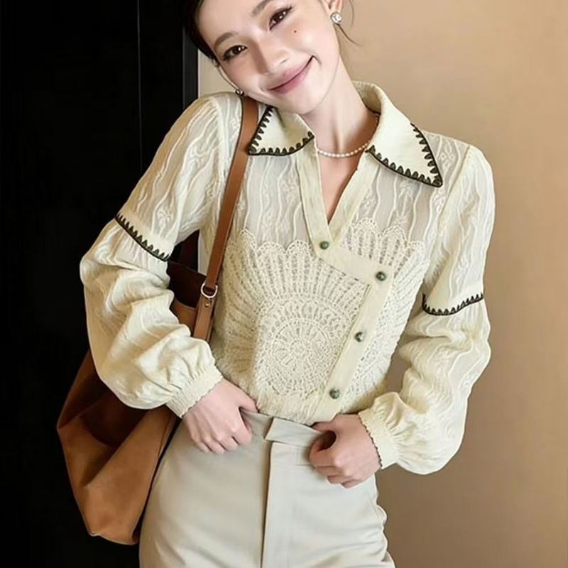 YF7012# 图片色春秋别致设计提花翻领长袖宽松显瘦韩版新款复古气质上衣