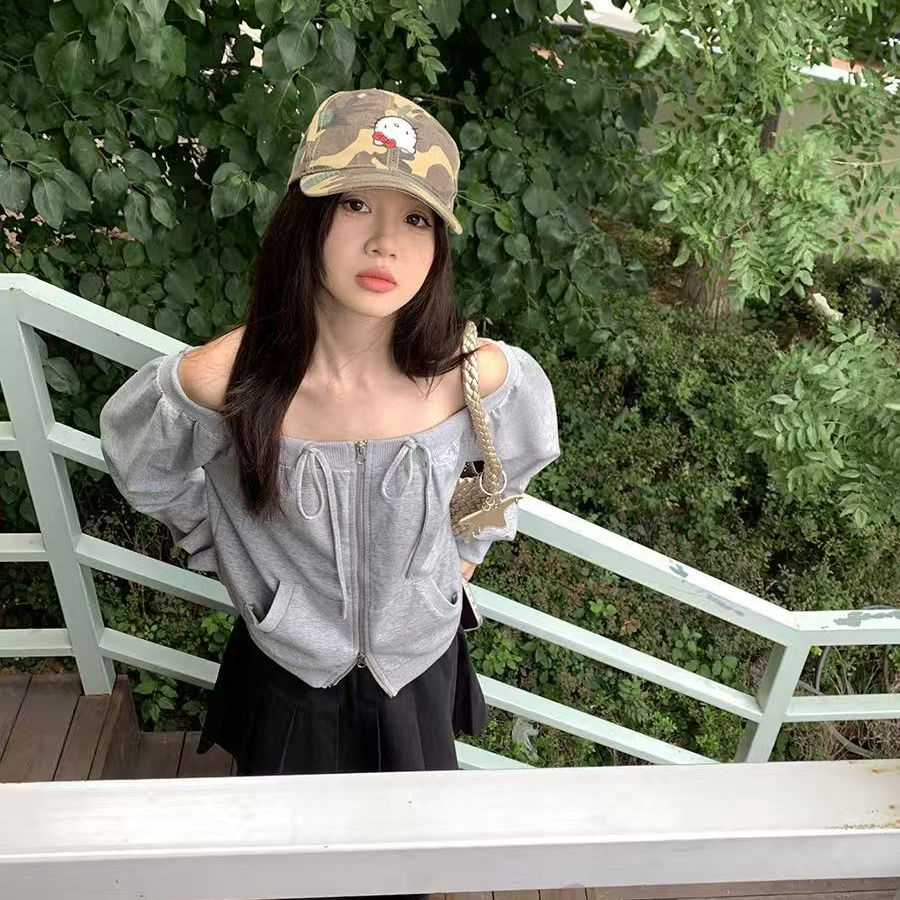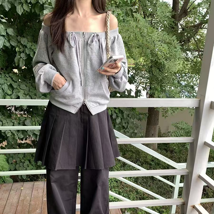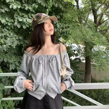BY10189# 长袖开衫卫衣春秋新款纯欲风一字肩大码宽松拉链绑带卫衣 服裝批發女裝批發服飾貨源