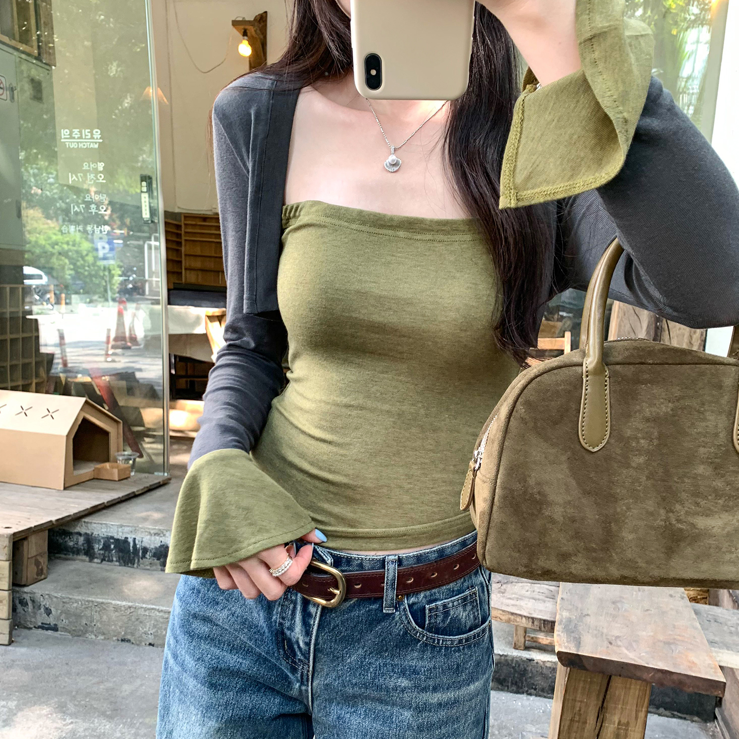 BY10309# 莱赛尔天丝喇叭袖假两件拼接打底长袖T恤女春新款上衣 服裝批發女裝批發服飾貨源