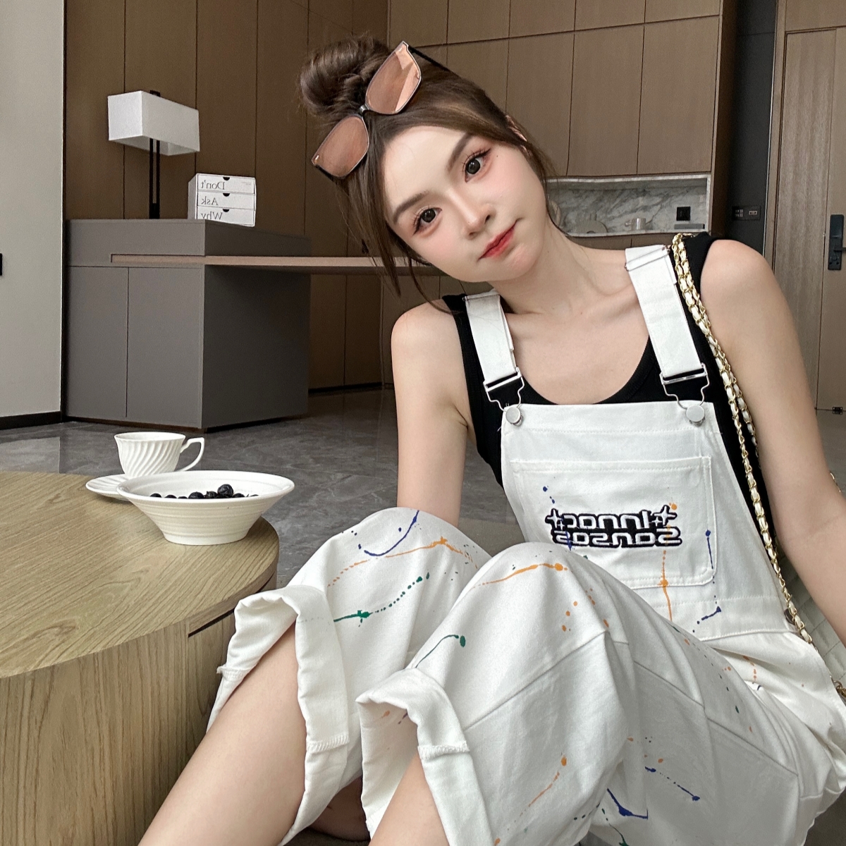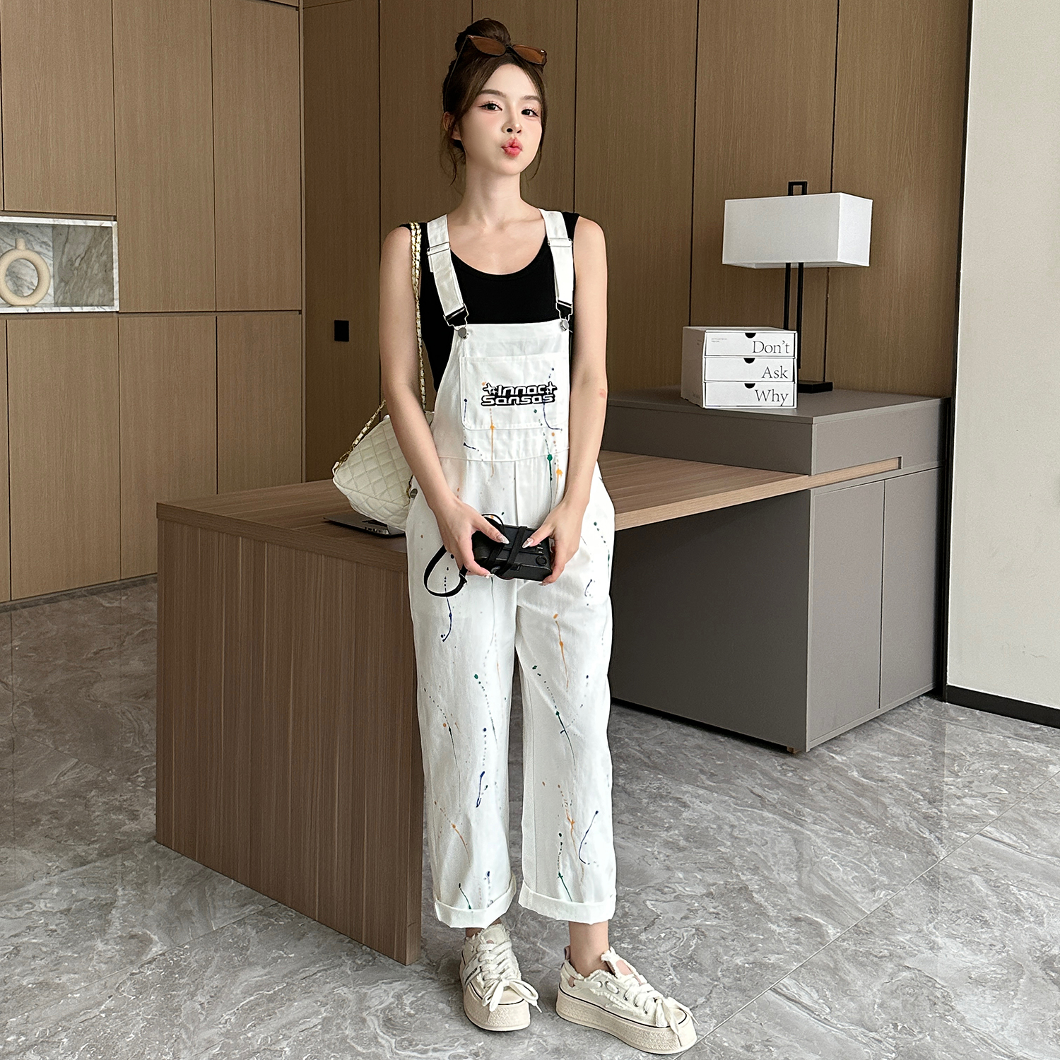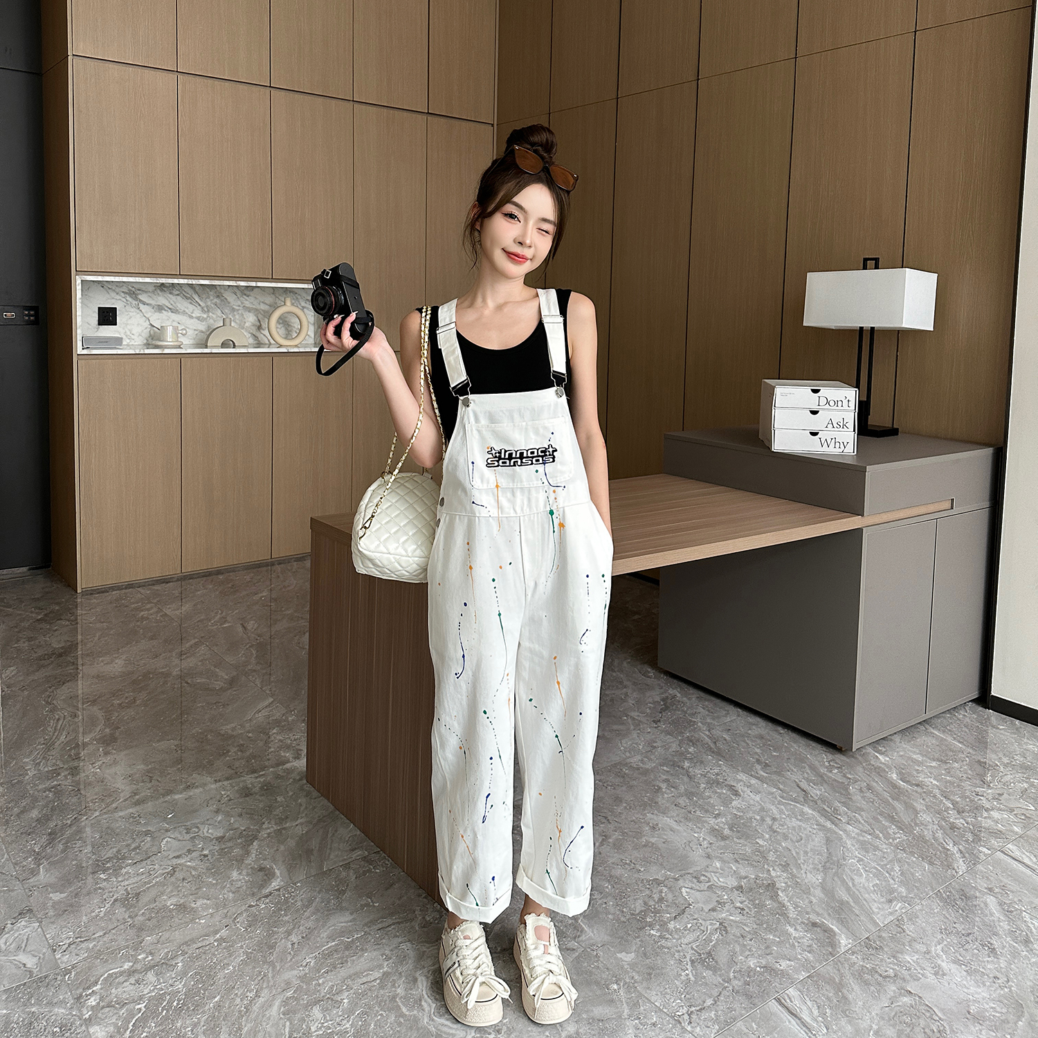 BY10327# 多巴胺美式复古喷墨工装背带裤女街头宽松百搭休闲长裤两件套装 服裝批發女裝批發服飾貨源
