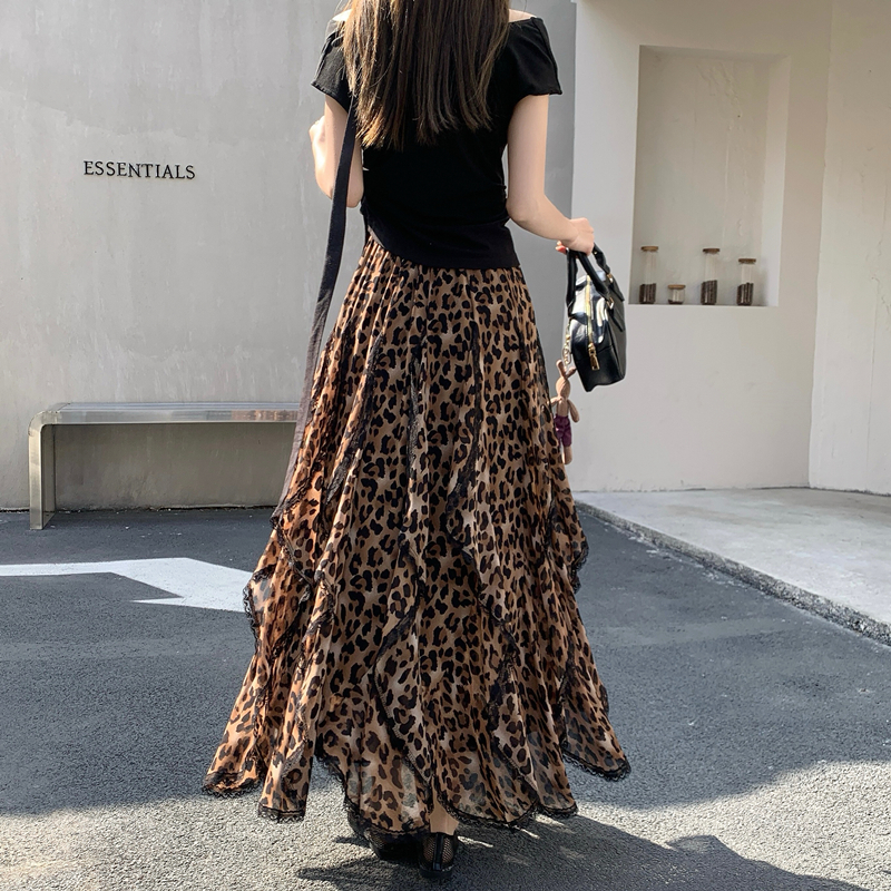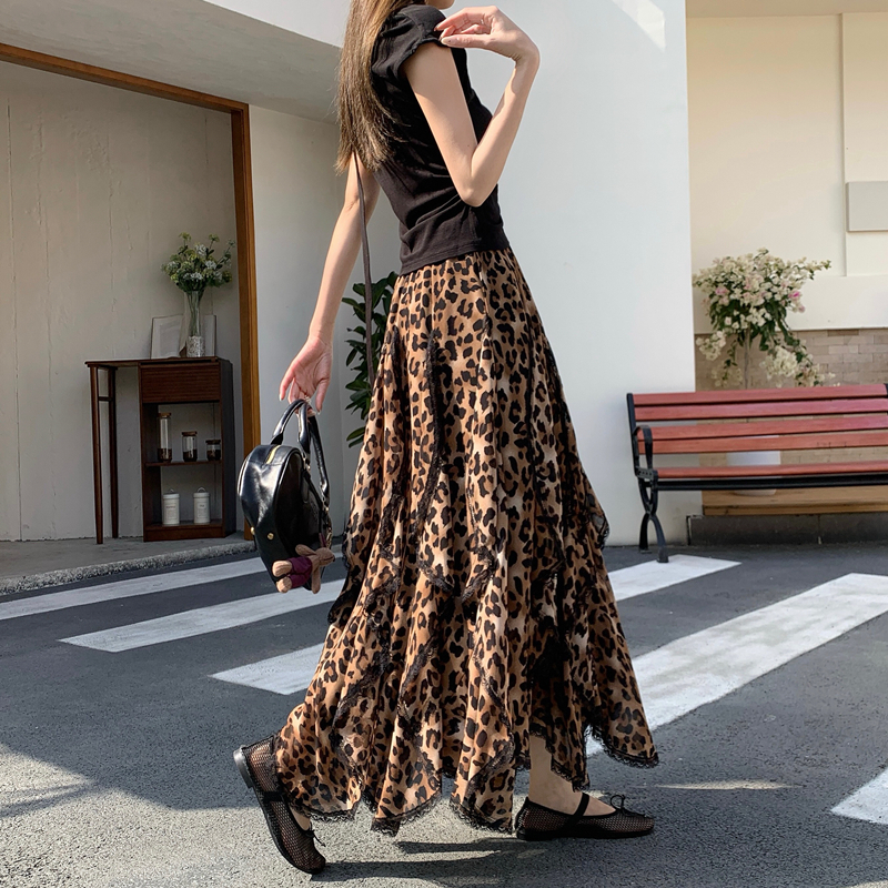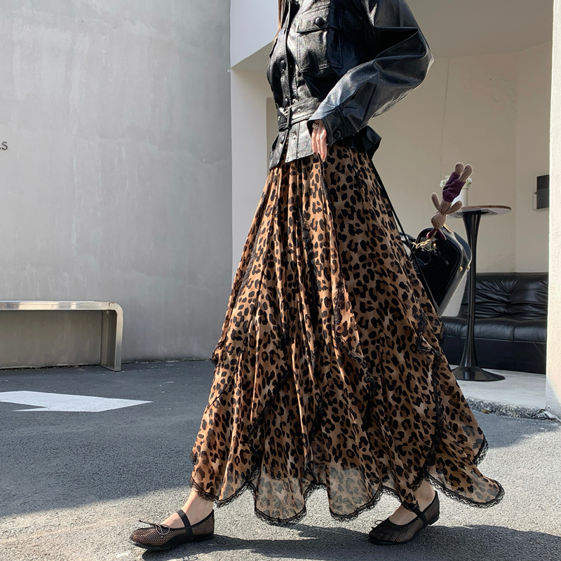 BY10331# 雪纺法式不规则荷叶边豹纹半身裙女春秋复古花边不对称大摆A字裙 服裝批發女裝批發服飾貨源