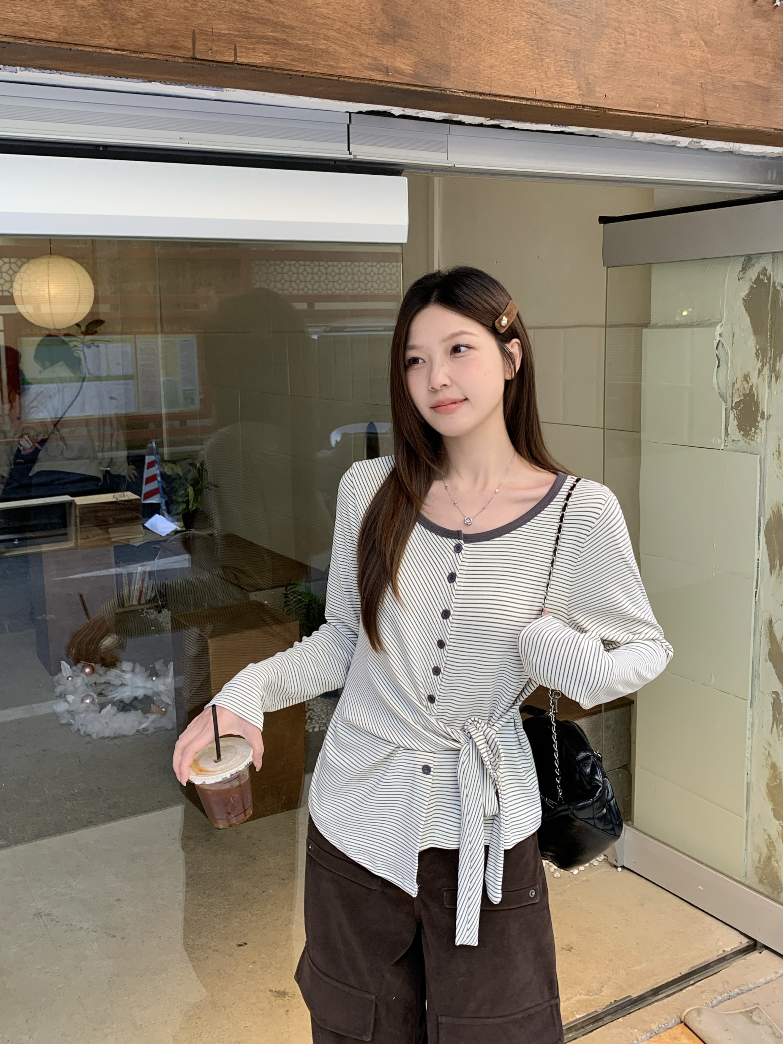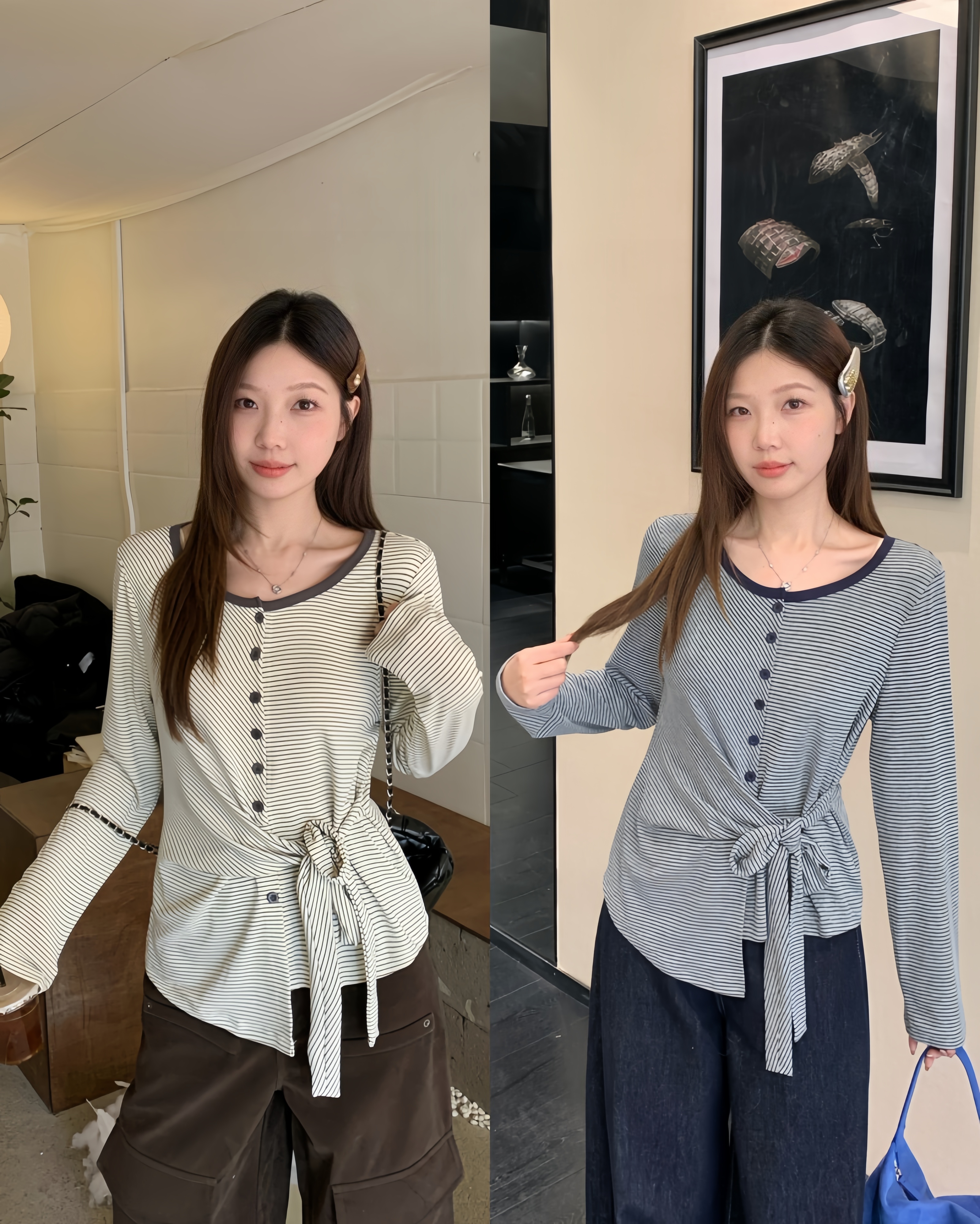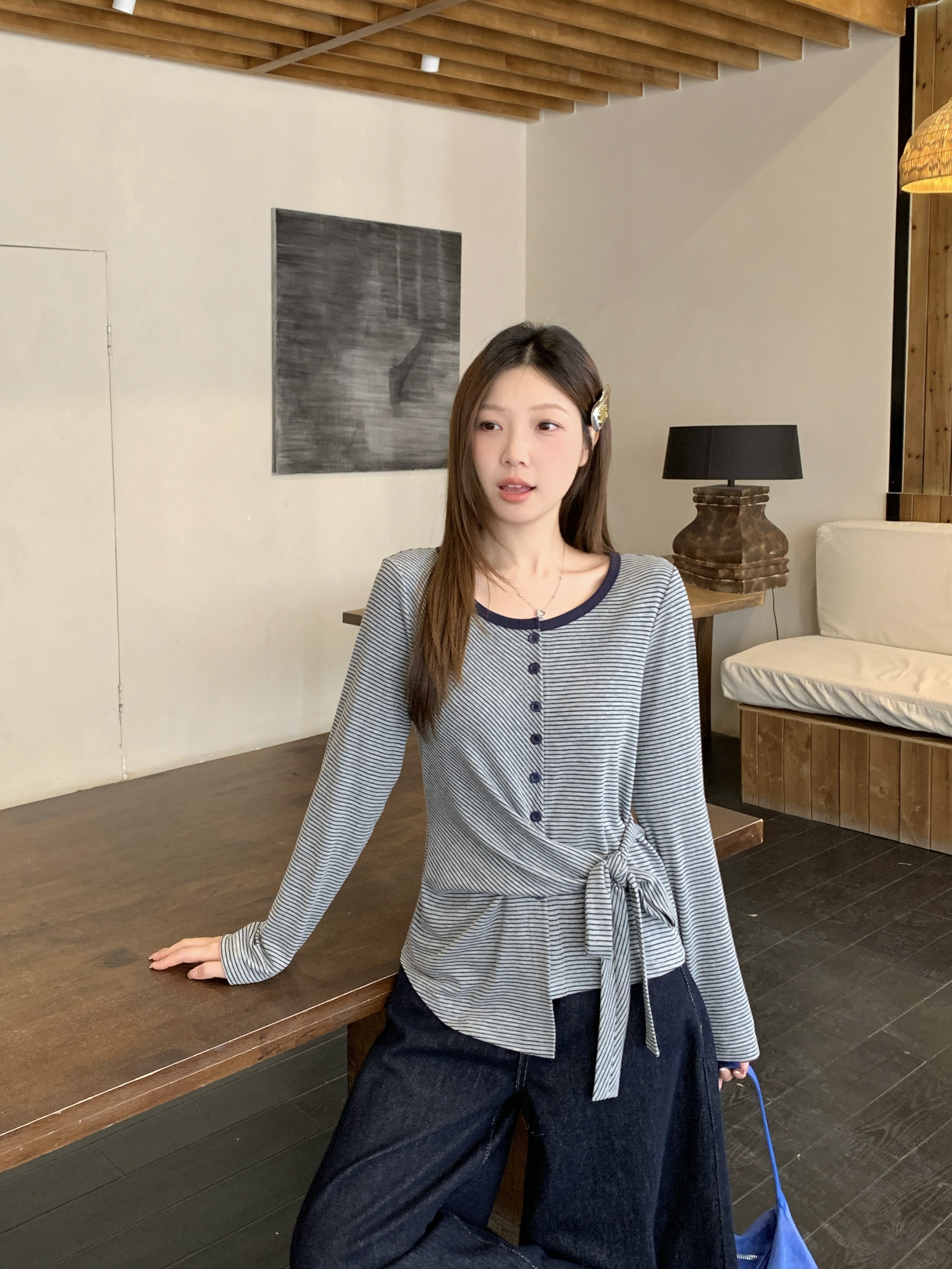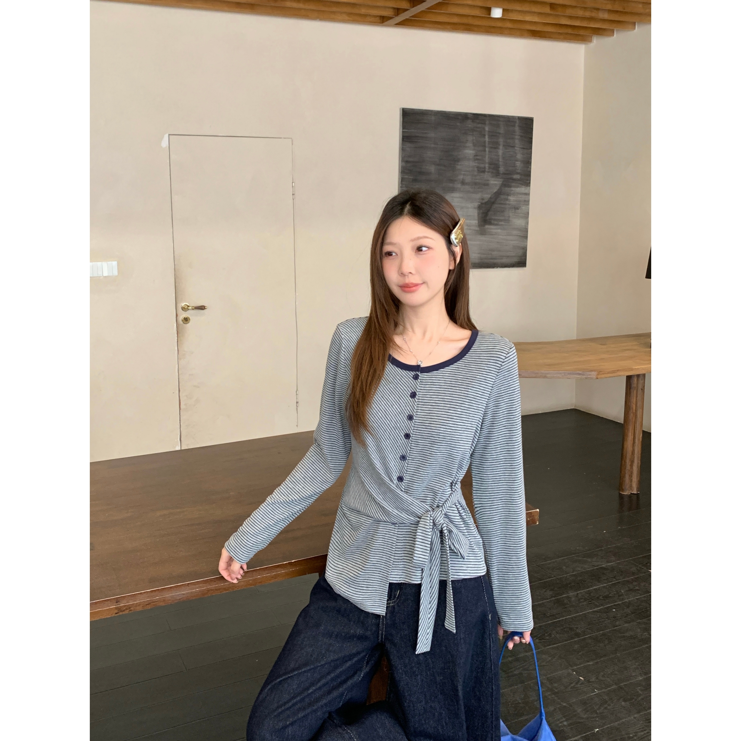 BY10361# 春季新款胖mm大码女不规则收腰长袖T恤条纹圆领打底上衣 服裝批發女裝批發服飾貨源