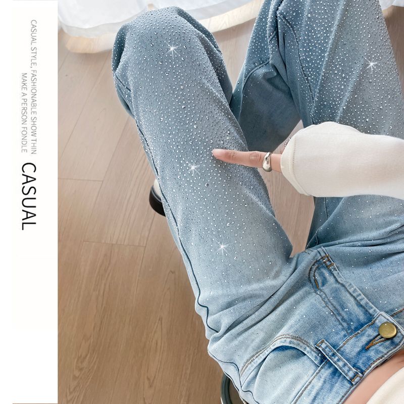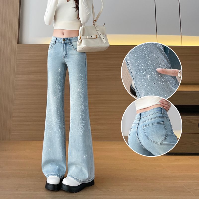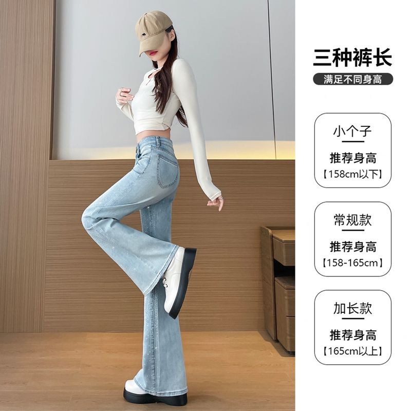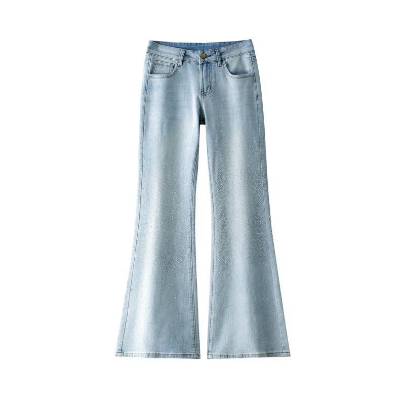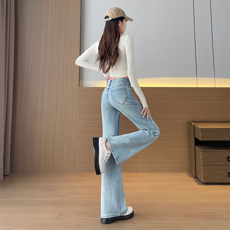 BY10363# 烫钻微喇叭牛仔裤女春秋季新款高腰修身显瘦小个子弹力美式喇叭裤 服裝批發女裝批發服飾貨源