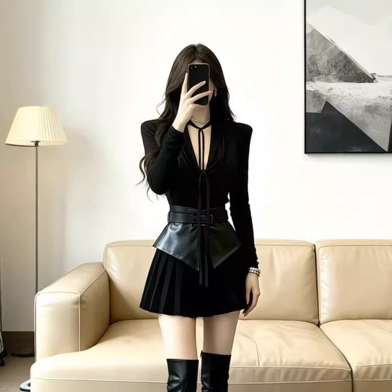 BY10375# 春气质辣妹风黑色V领修身长袖上衣女高腰显瘦A字半身裙两件套装女 服裝批發女裝批發服飾貨源