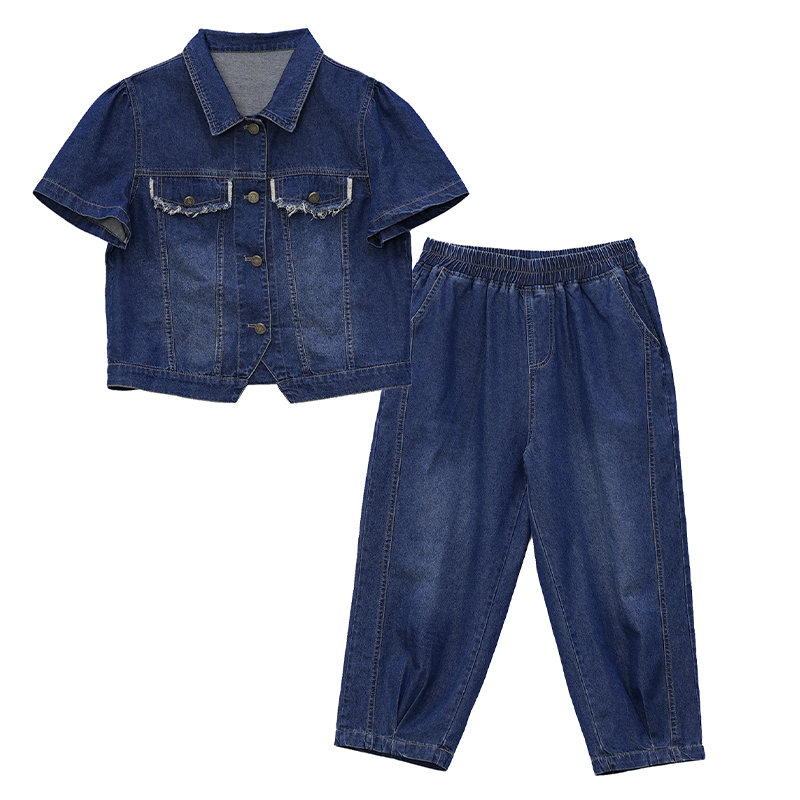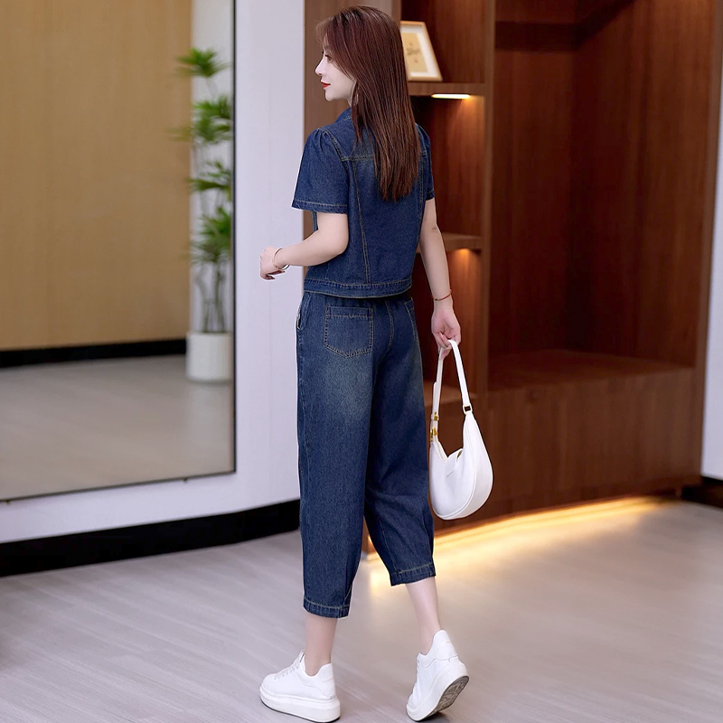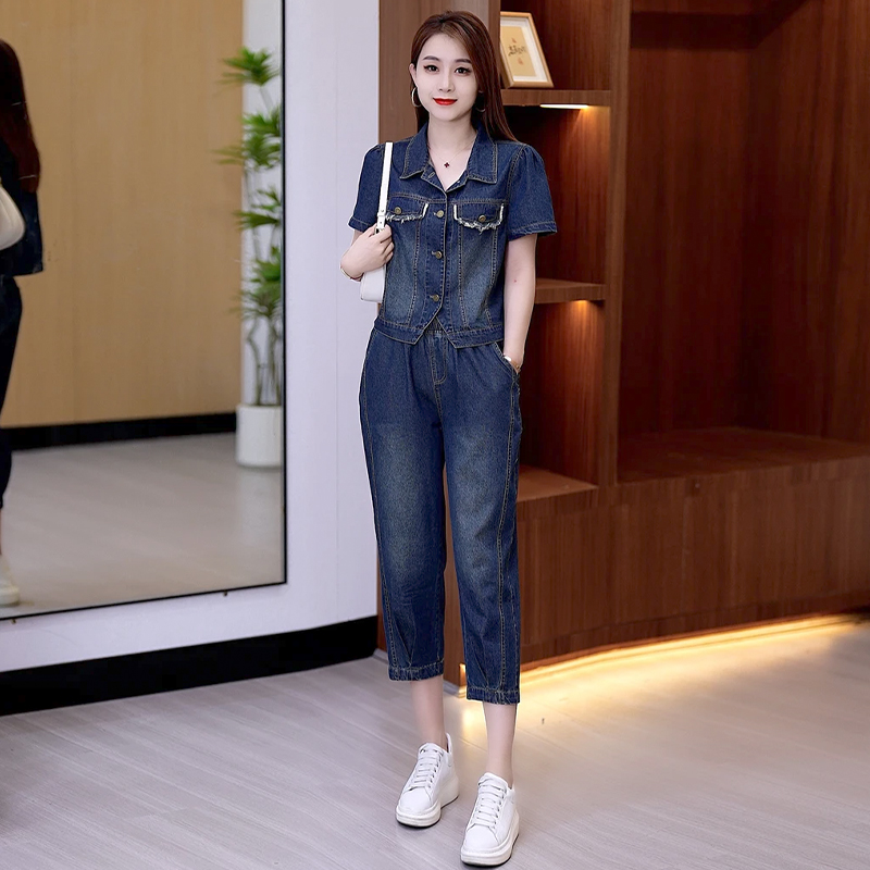 BY10384# 高含棉套装女夏季新款洋气牛仔短袖外套直筒裤两件套潮 服裝批發女裝批發服飾貨源