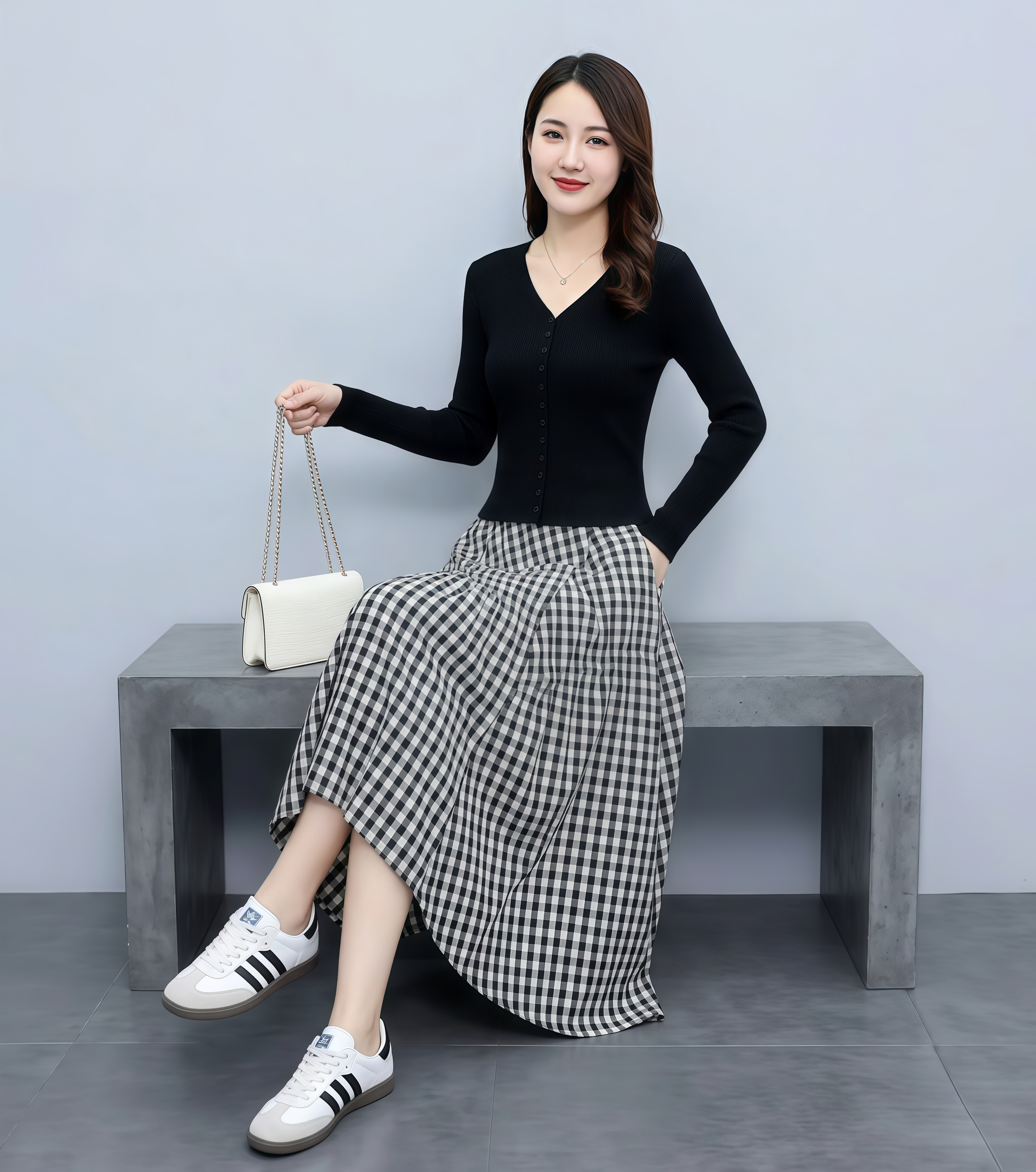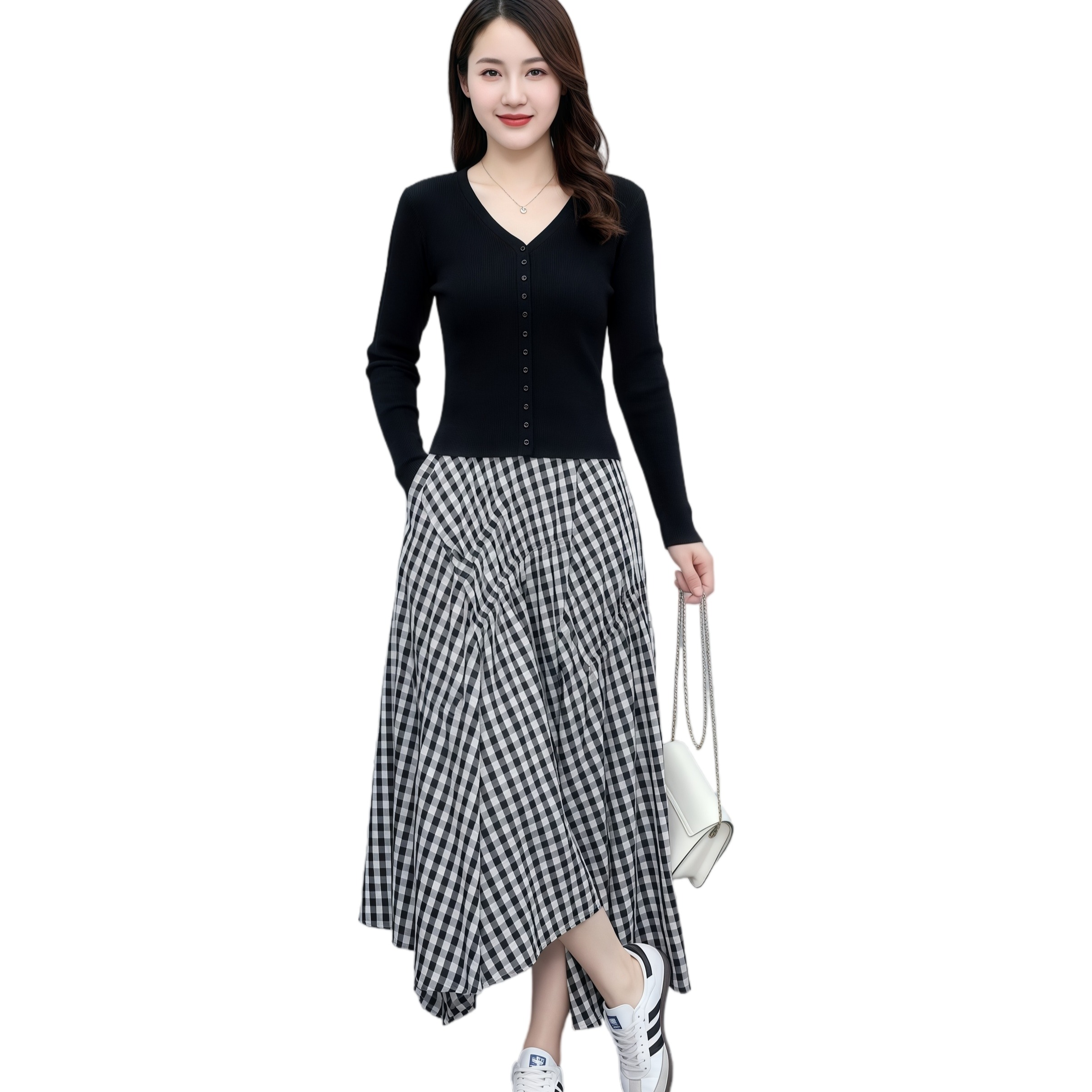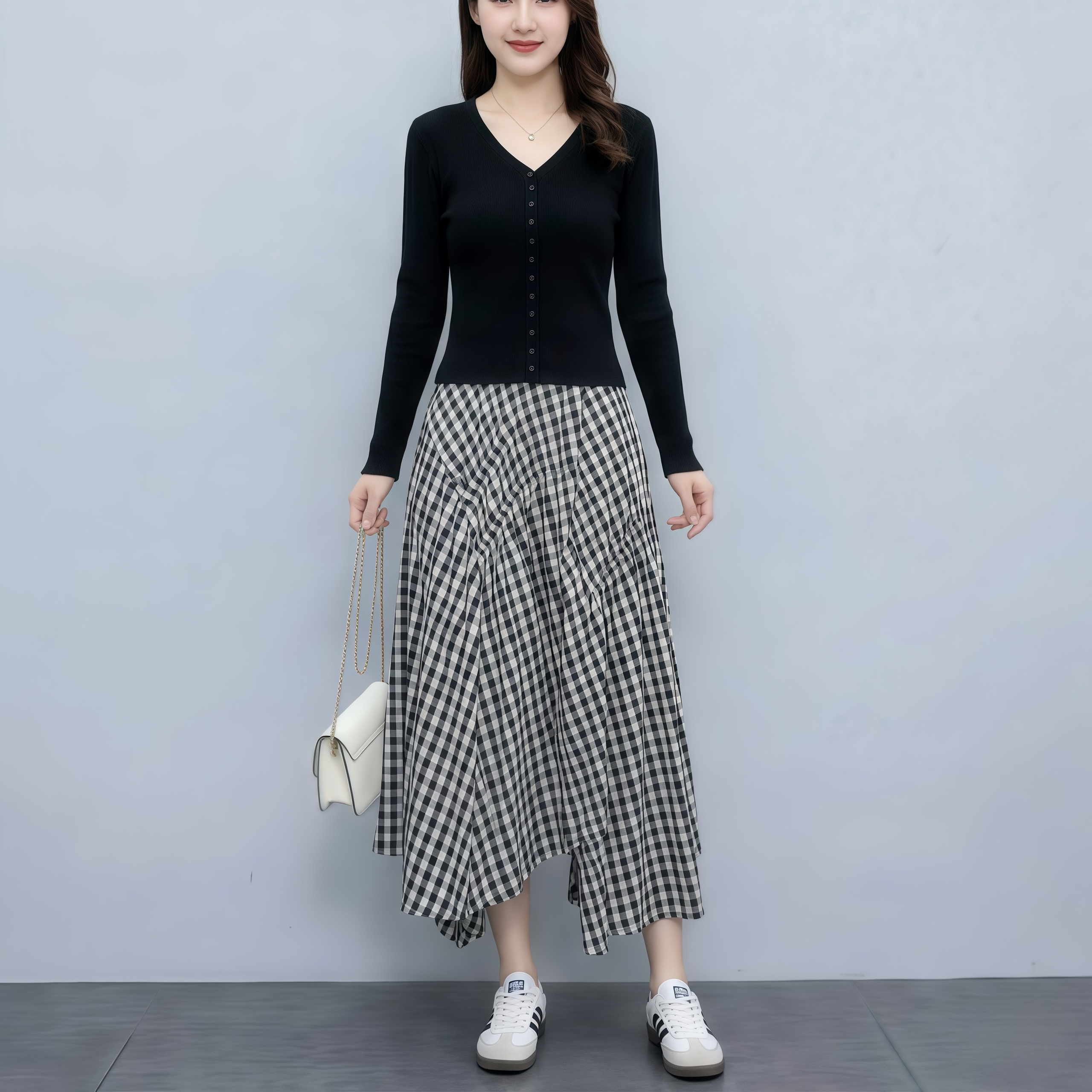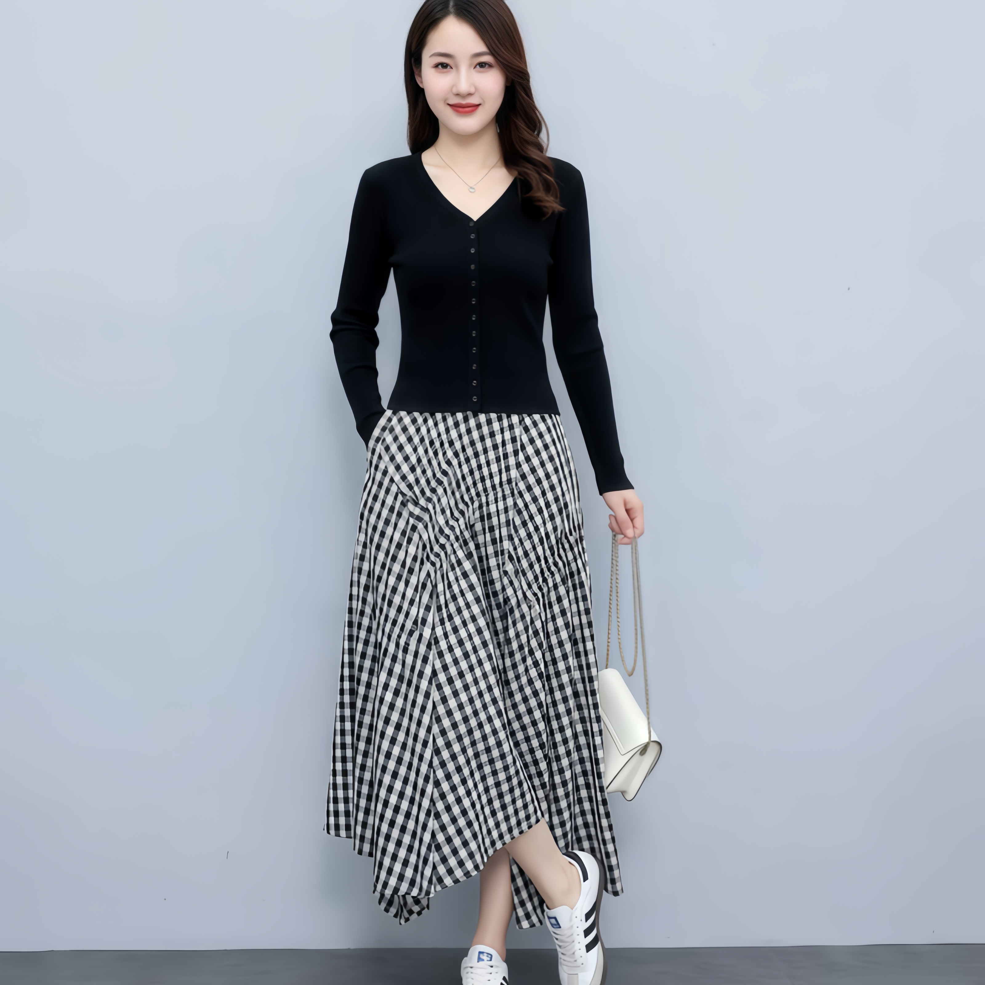 BY10411# 小众调性春夏季新款长袖针织上衣格纹半身裙两件套 服裝批發女裝批發服飾貨源
