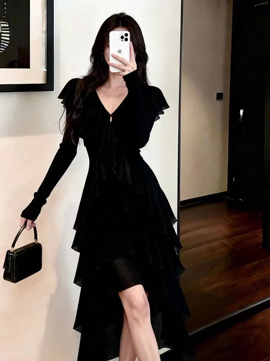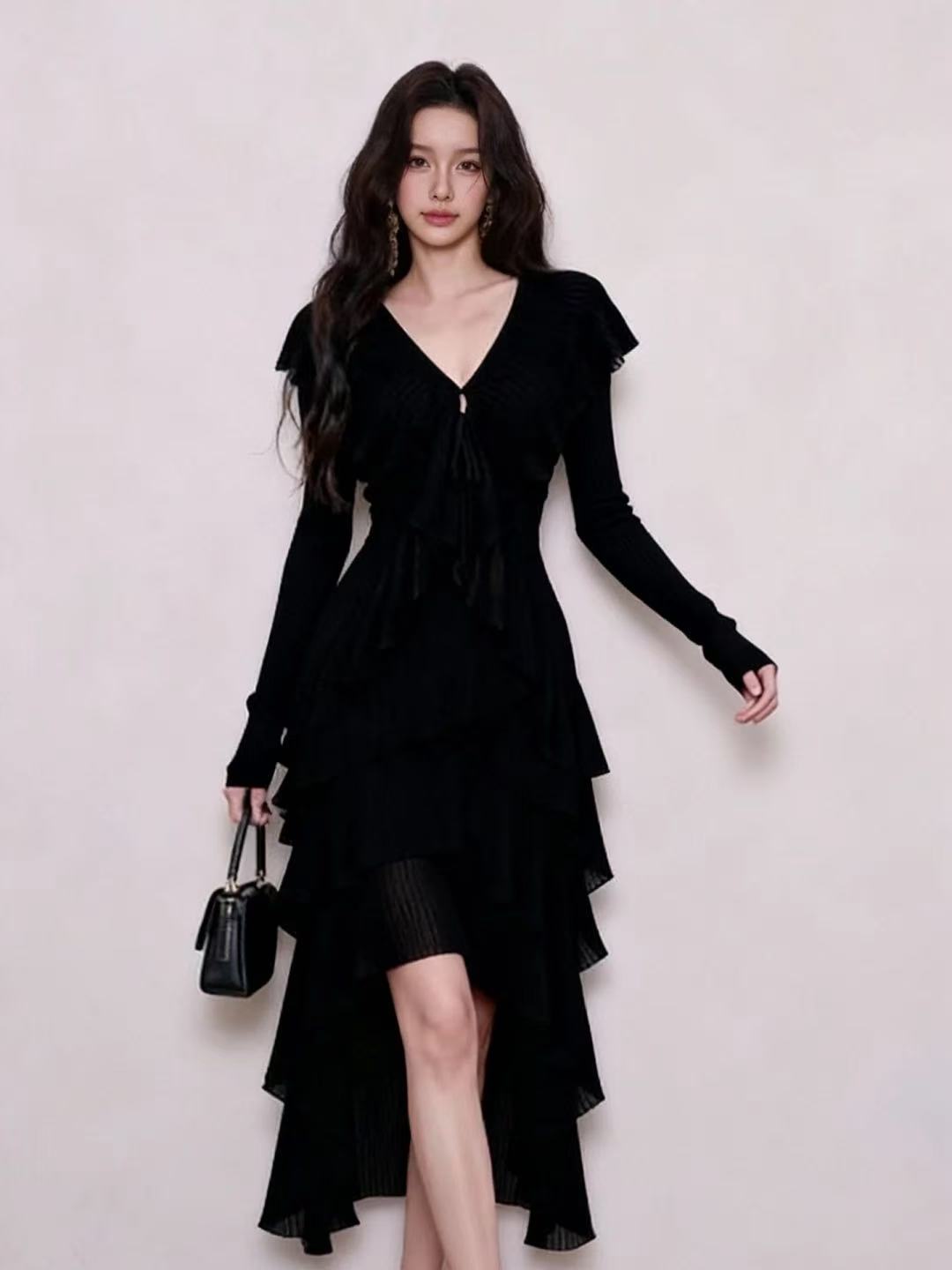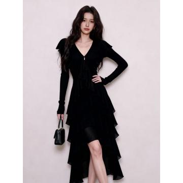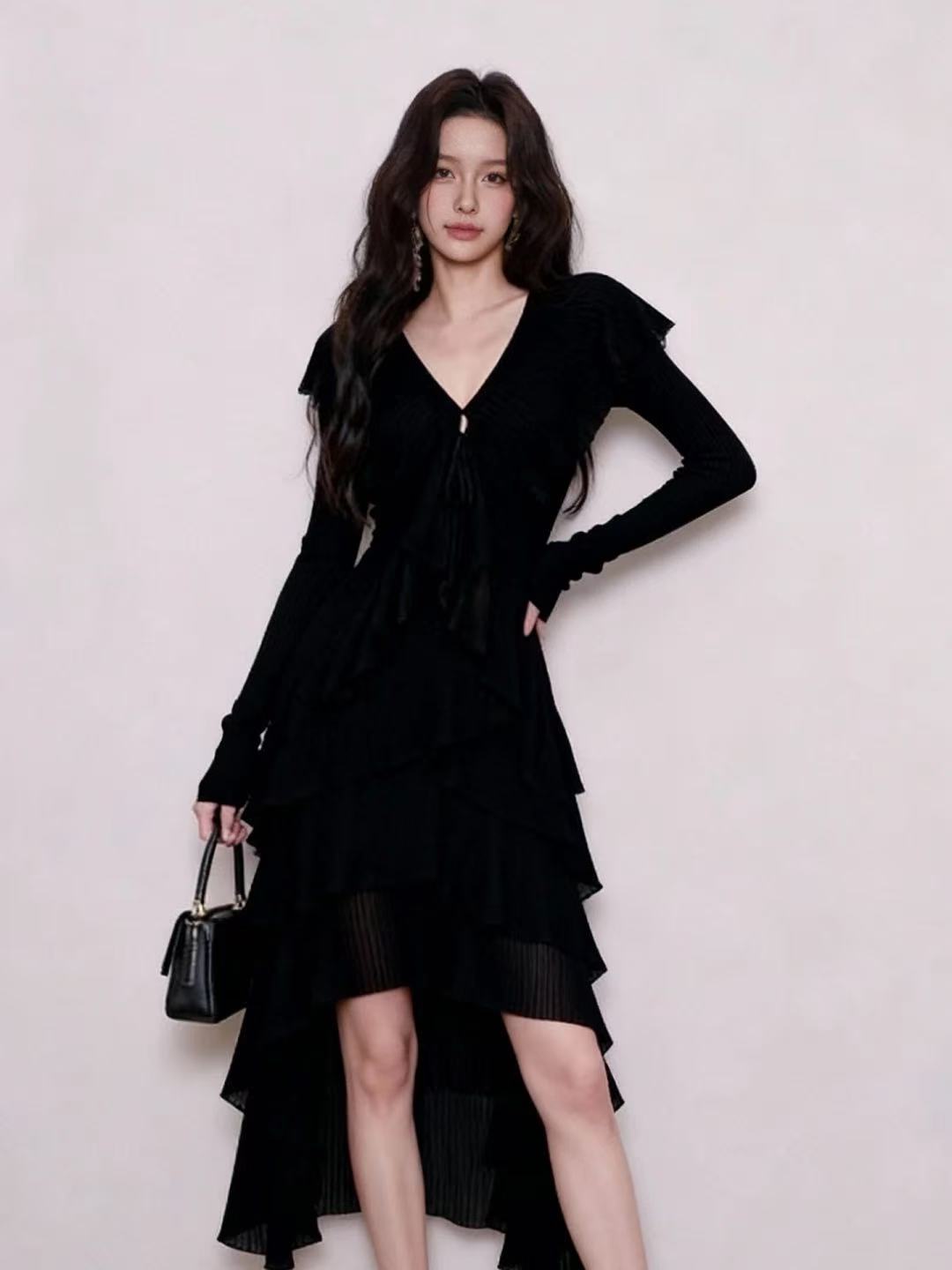 BY10432# 黑色V领系带气质连衣裙女春季新款不规则裙摆优雅小黑裙 服裝批發女裝批發服飾貨源