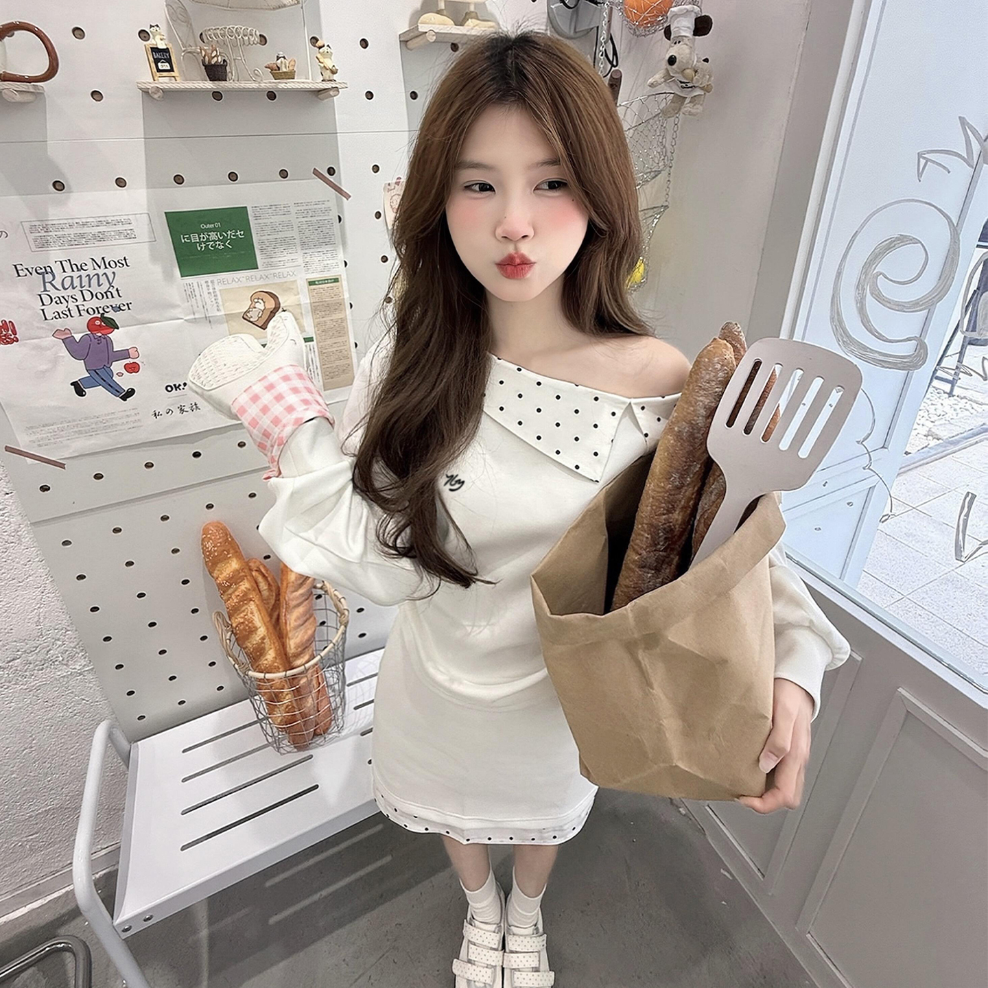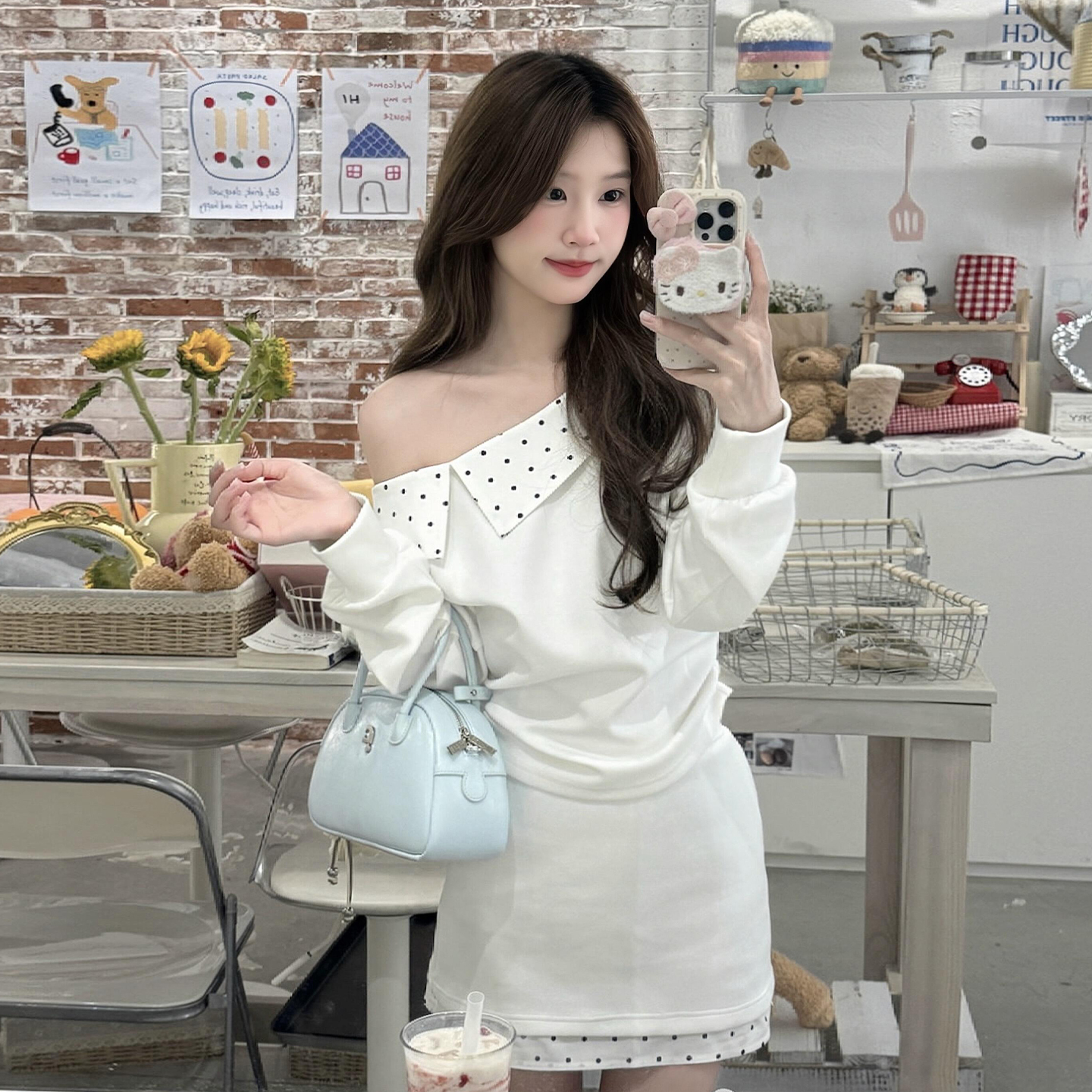 BY10489# 一字肩斜肩白色卫衣连衣裙子女新款秋季韩系穿搭包臀短裙套装 服裝批發女裝批發服飾貨源