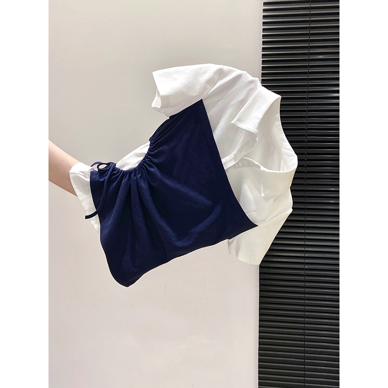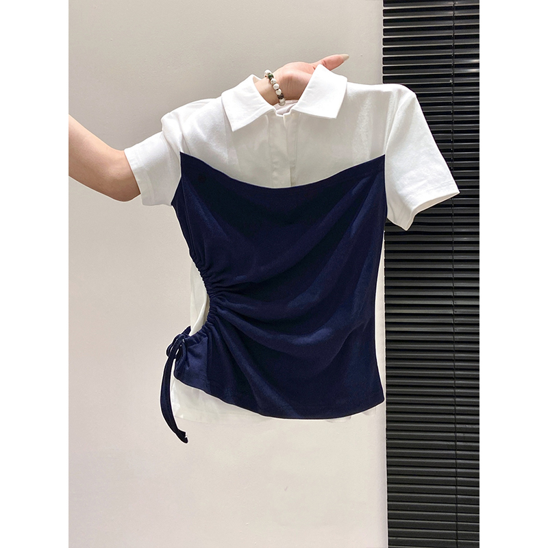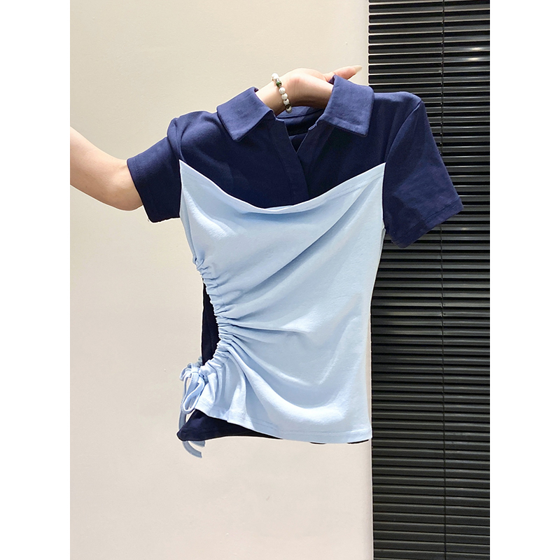 BY10592# 假两件polo领短袖T恤女夏季新款侧边抽绳收腰显瘦百搭上衣 服裝批發女裝批發服飾貨源