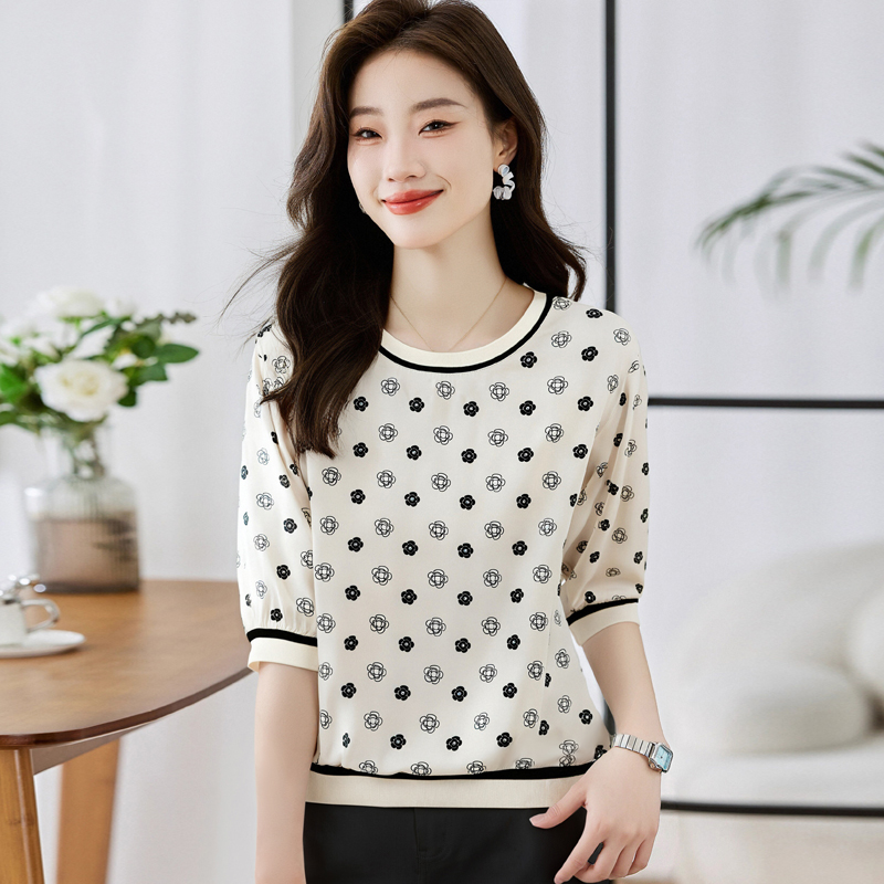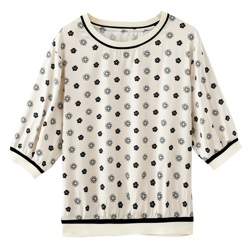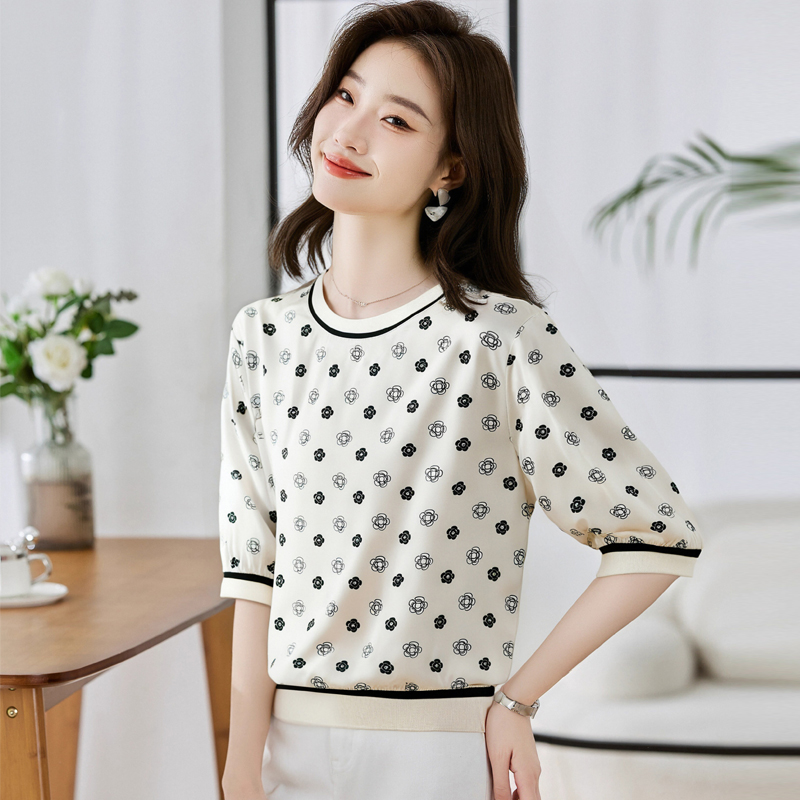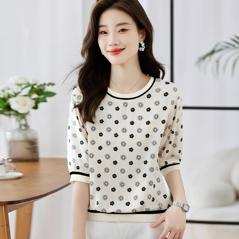 BY10660# 高端缎面仿真丝气质经典印花圆领五分袖设计感小众T恤 服裝批發女裝批發服飾貨源