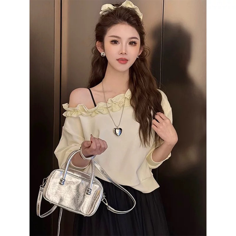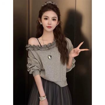 BY10669# 巨好看春季荷叶花边领斜肩卫衣T恤女新款爆款时尚洋气小个子 服裝批發女裝批發服飾貨源
