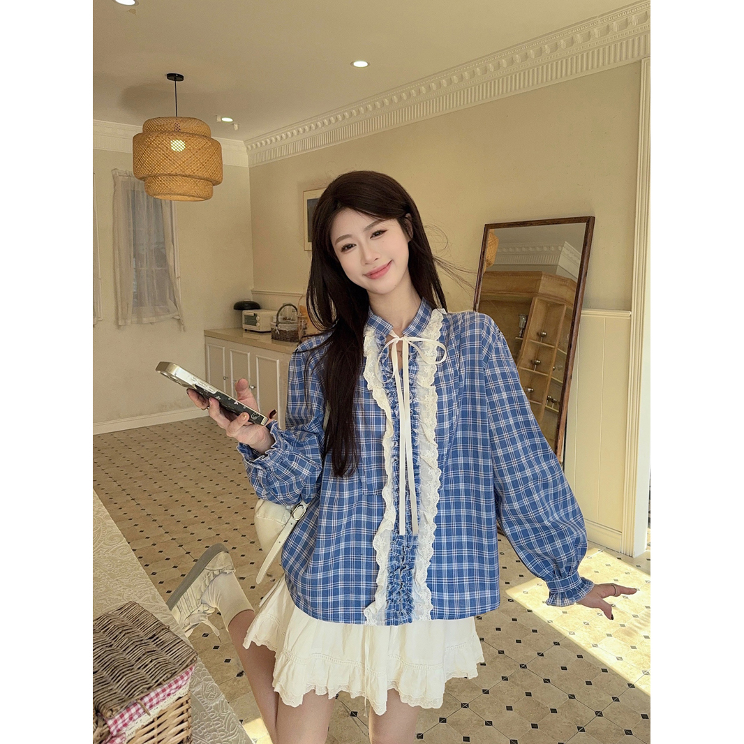 BY10673# 法式灯笼袖系带蓝格子衬衫女宽松蕾丝拼接气质v领长袖上衣春 服裝批發女裝批發服飾貨源