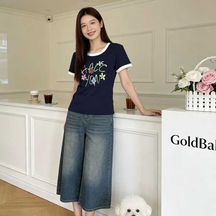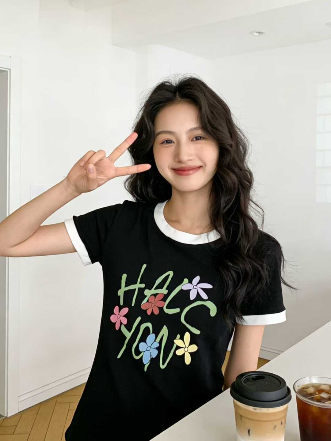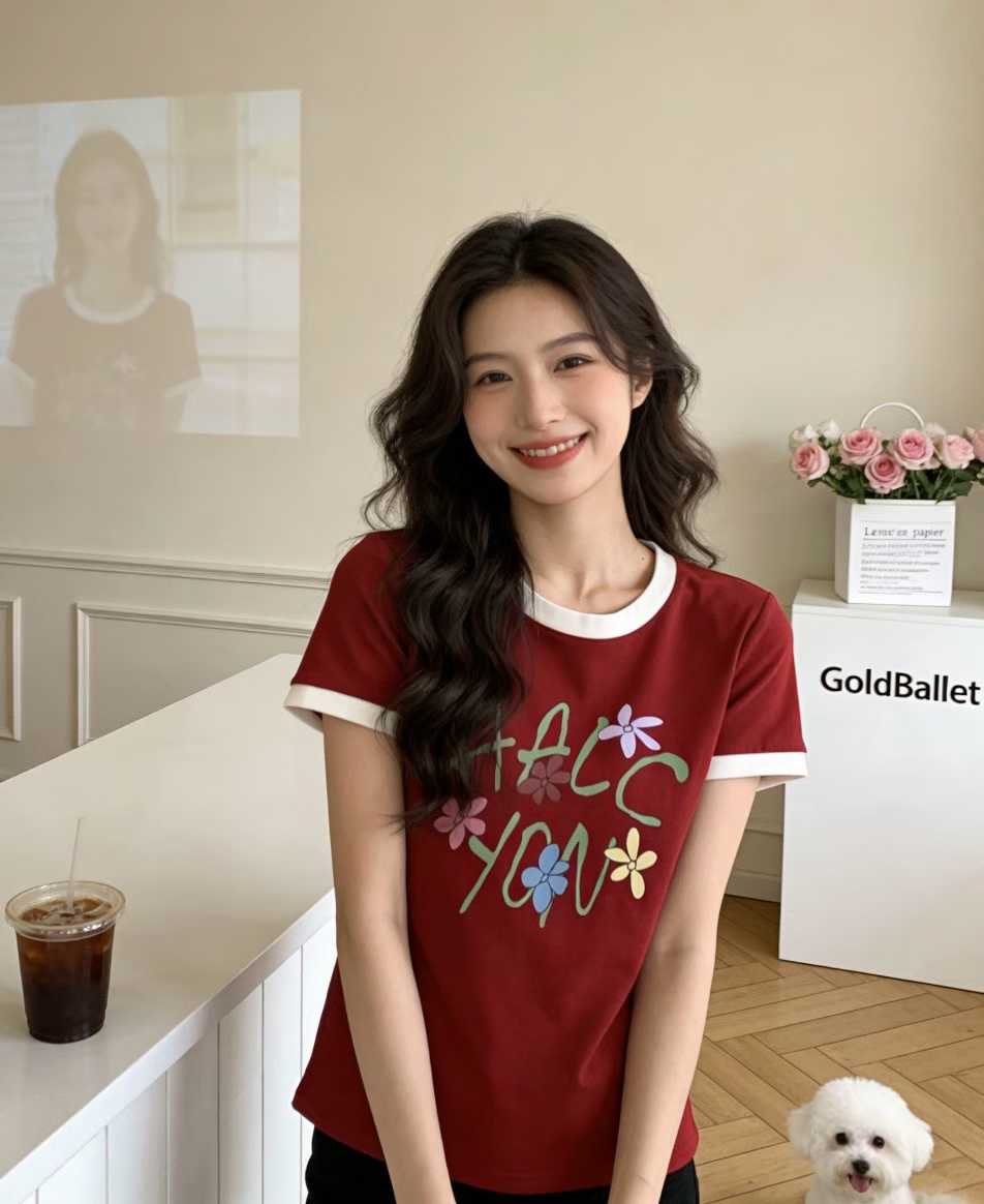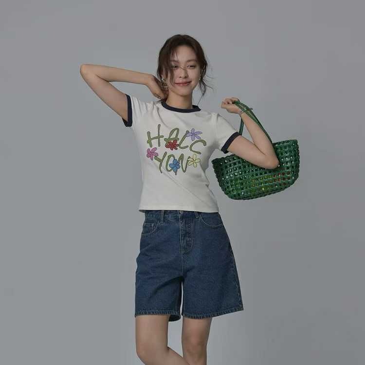 BY10686# 多巴胺彩色印花撞边圆领正肩显瘦短袖T恤女夏短款上衣 服裝批發女裝批發服飾貨源