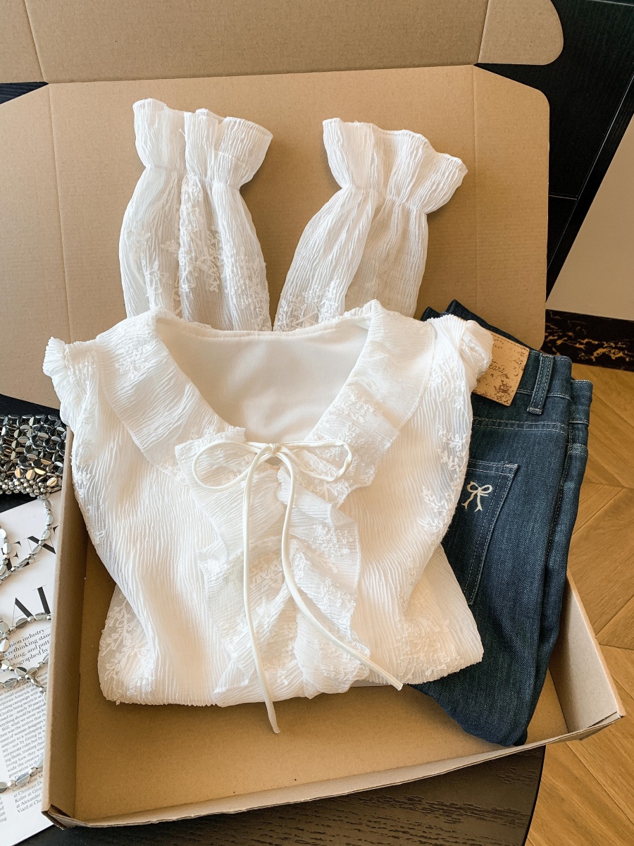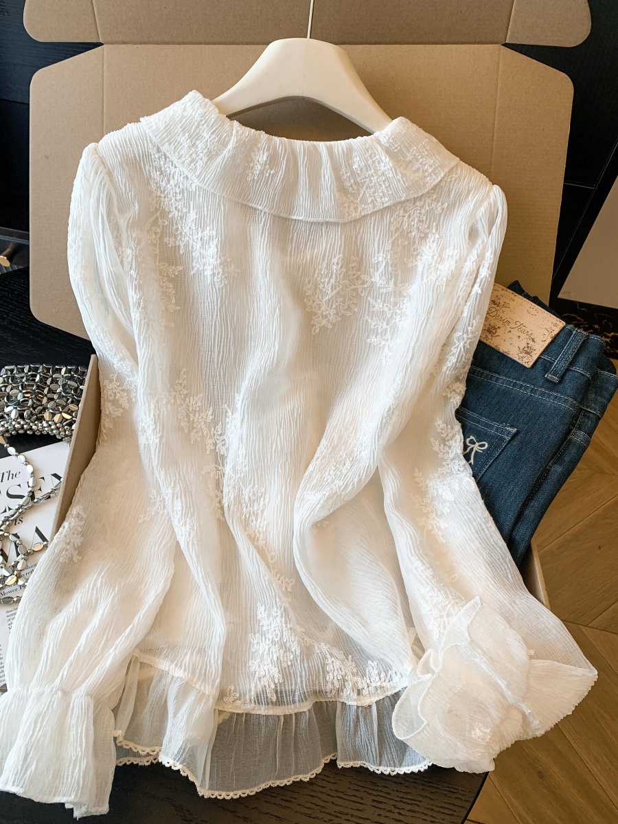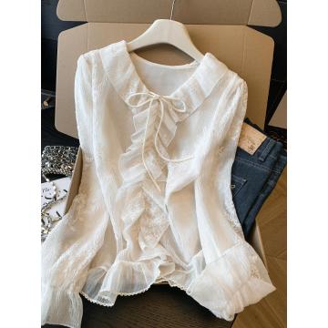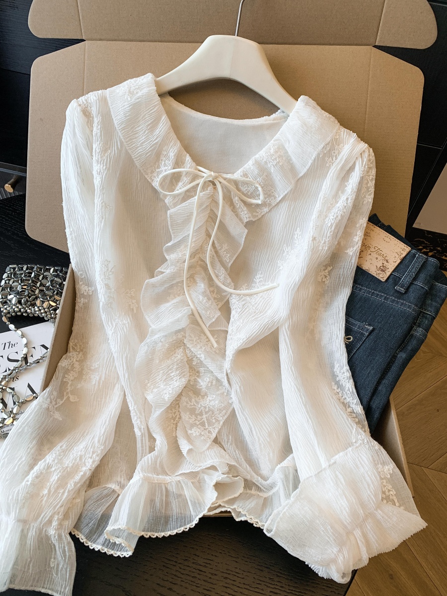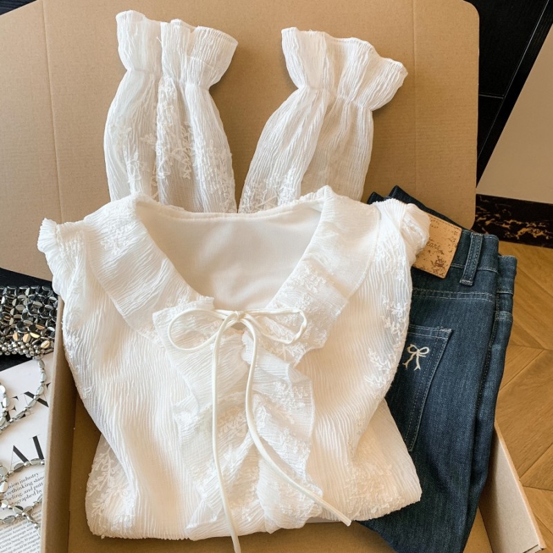 BY10694# 春季新款刺绣烫褶蕾丝衫法式轻奢刺绣小衫荷叶边系带上衣 服裝批發女裝批發服飾貨源