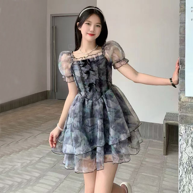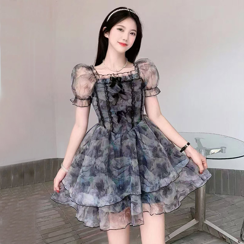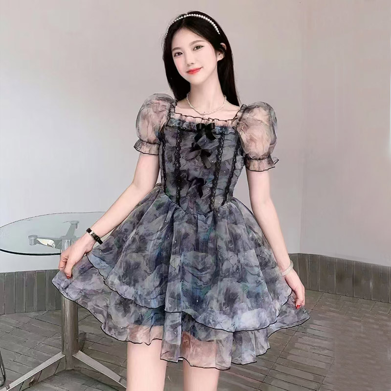 BY10756# 夏季新款女装气质蓬蓬短袖网纱碎花连衣裙 服裝批發女裝批發服飾貨源