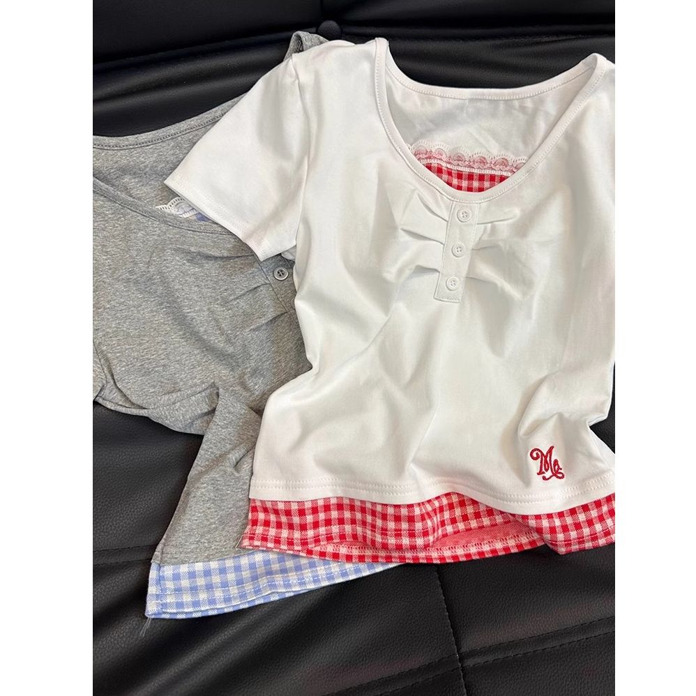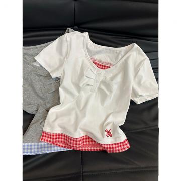 BY11802# 新款假两件蕾丝格子圆领短袖t恤女夏设计感甜美风别致上衣 服裝批發女裝批發服飾貨源
