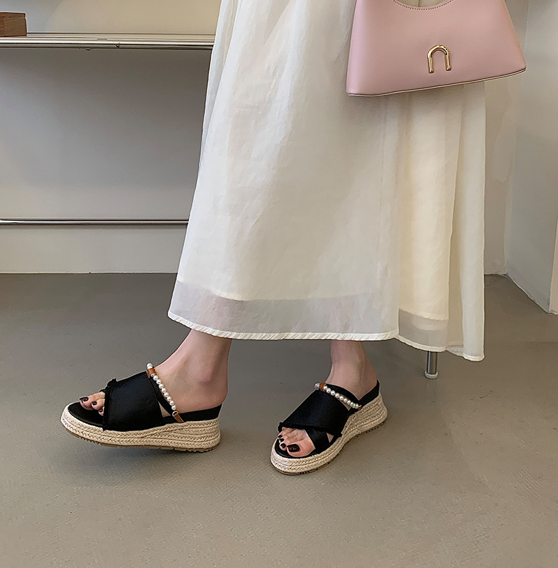 X-33186#厚底增高7cm珍珠一字拖女休闲新款小个子百搭流苏凉拖鞋 鞋子批发女鞋批发凉鞋货源