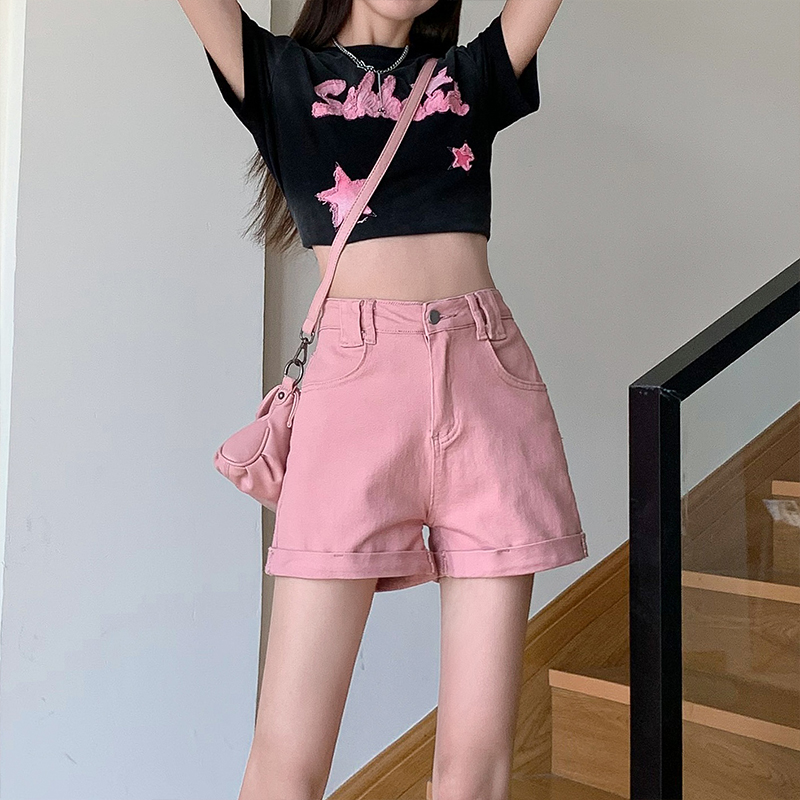 BY17461# 粉色卷边高腰牛仔短裤女夏季薄款遮胯显瘦宽松a字百搭阔腿热裤潮 服裝批發女裝批發服飾貨源