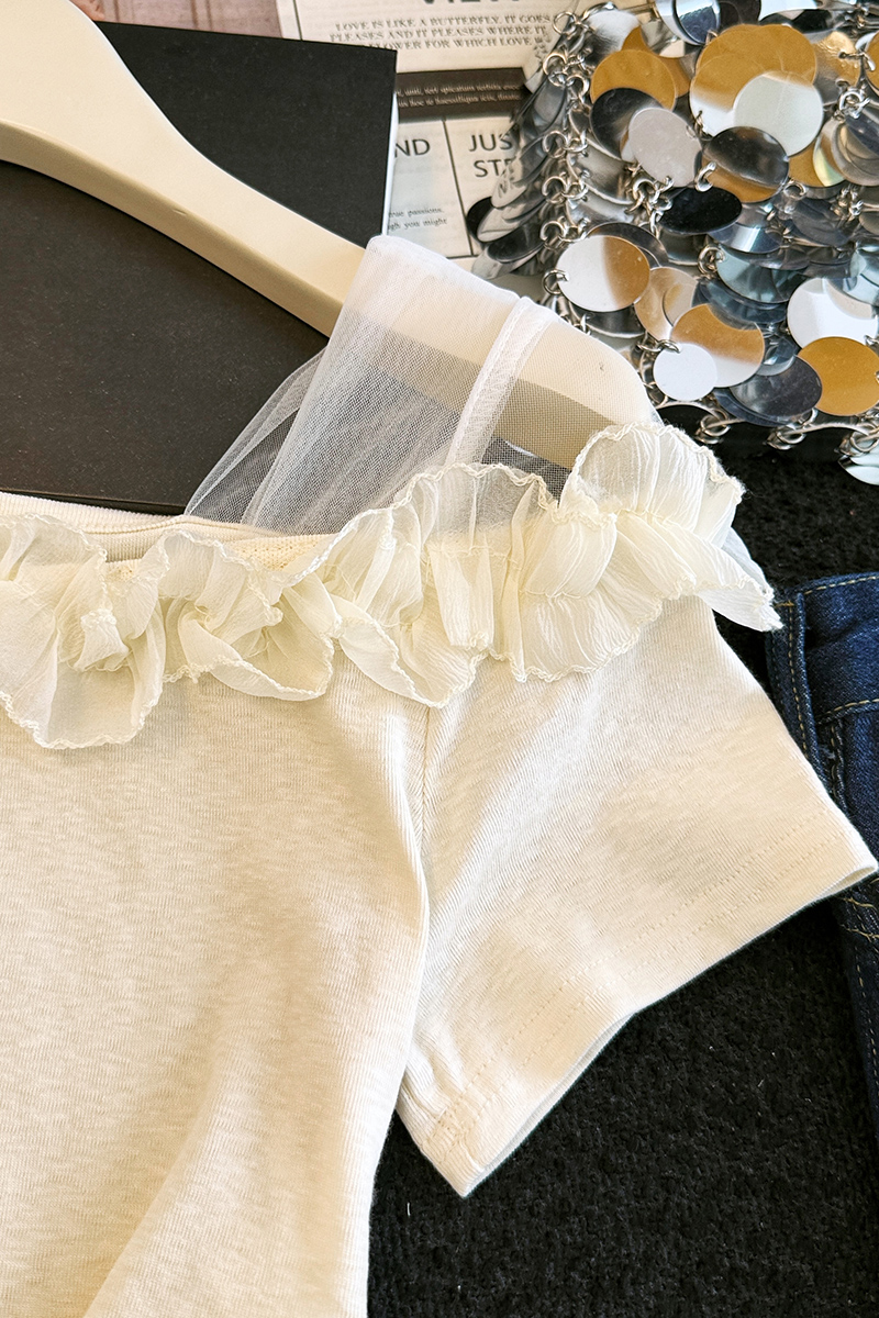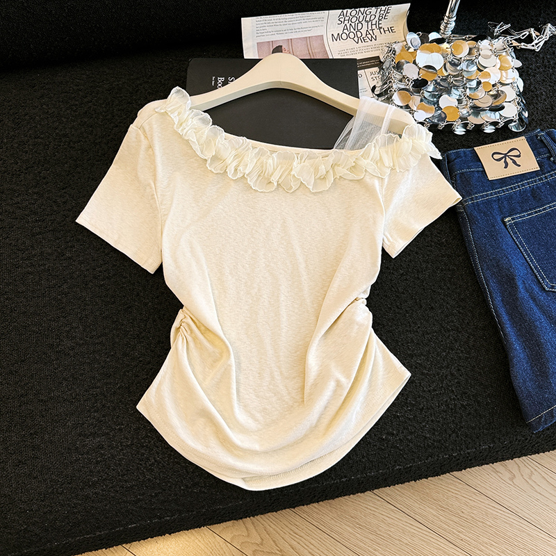 BY17525# 有货夏季新款韩版修身花朵斜肩设计感百搭套头小衫 服裝批發女裝批發服飾貨源