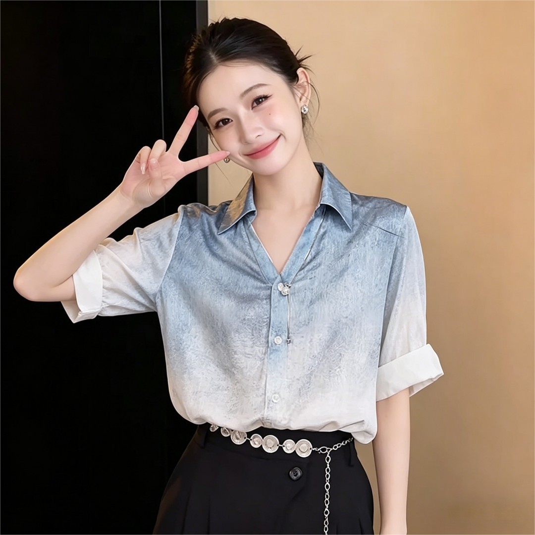 BY17529# 法式冰川蓝渐变设计感短袖衬衫女夏宽松休闲上衣 服裝批發女裝批發服飾貨源